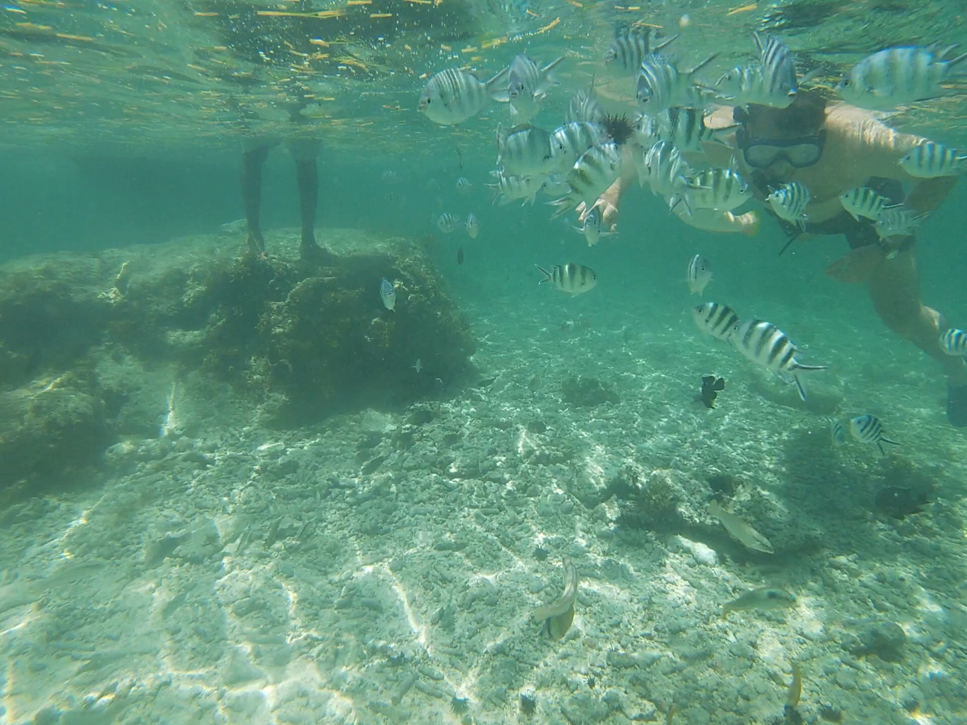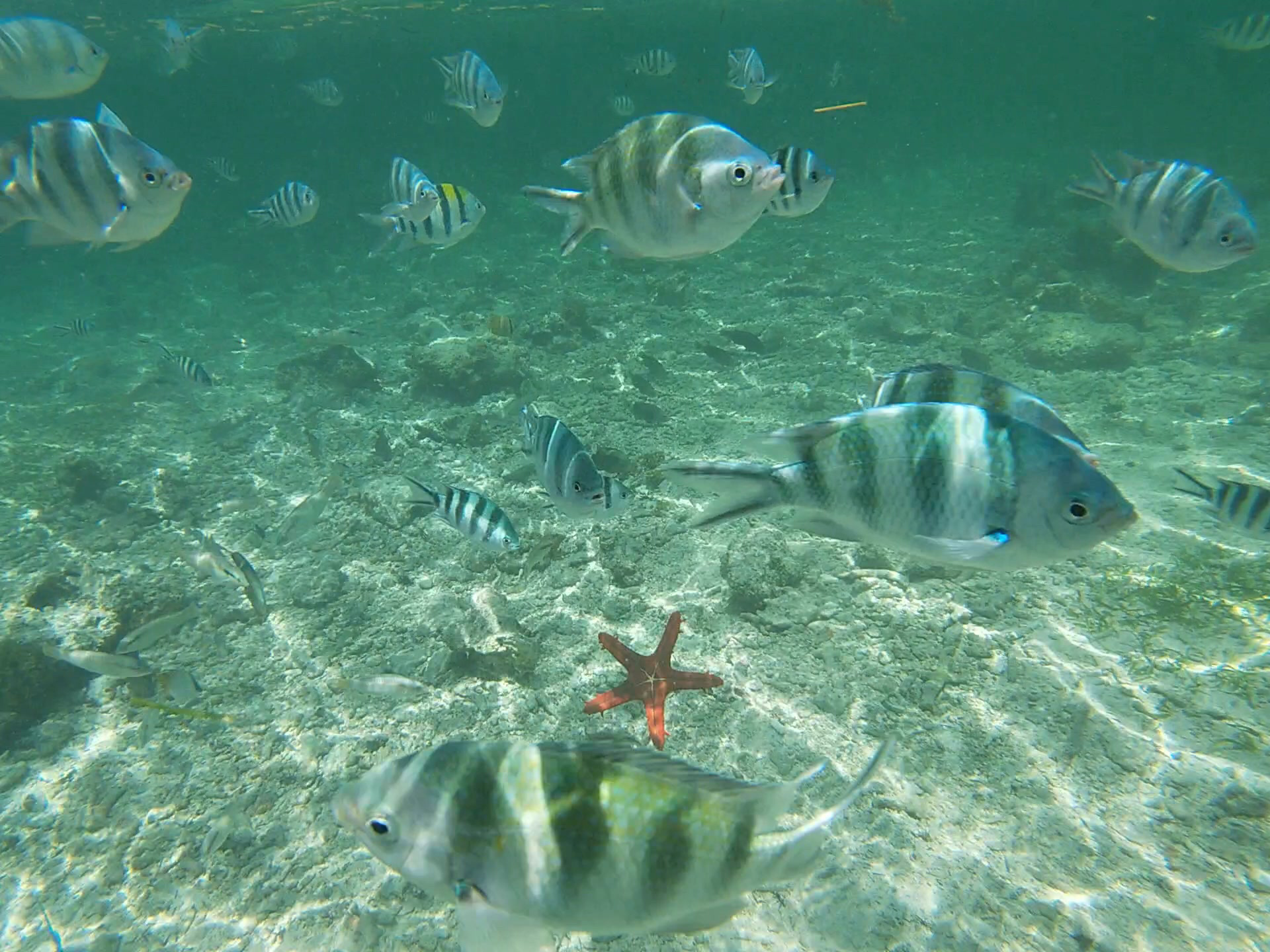 We spent about 20 minutes, slowly making our way out to what looked like a sandbar to us in previous days, but when we got there we realized it was the top of a reef that was being exposed each day by the moving tides. In our water shoes borrowed from the hotel we walked along the reef for a bit and the guide pointed out a star fish to us which was quite large and heavy. We also found one that was black with bright red spikes on its back – did not look like someone to mess with down there. We also saw lots of sea urchins and different kinds of coral. Then it was time for snorkeling next to the reef where the water was a little deeper but still just up to our chests. We put our faces under and saw lots of fish in many different colors. The guide smashed up some sea urchins and threw them in the water to attract more fish and gave pieces to us to feed the fish from our hands. We swam around for a while checking out the fish, starfish, and other sea life around the reef and Fred got some great videos on the GoPro. When the current started to get stronger and we found ourselves drifting further from the boat it was time to make our way back to the shore. The tides were coming in and the reef we had stood on just a little while before was now covered by the sea. Besides… we were treating ourselves to a massage that afternoon and we had to get back for that. The massage was relaxing and true to the spice island we smelled heavily of cinnamon and spices after from the oils.