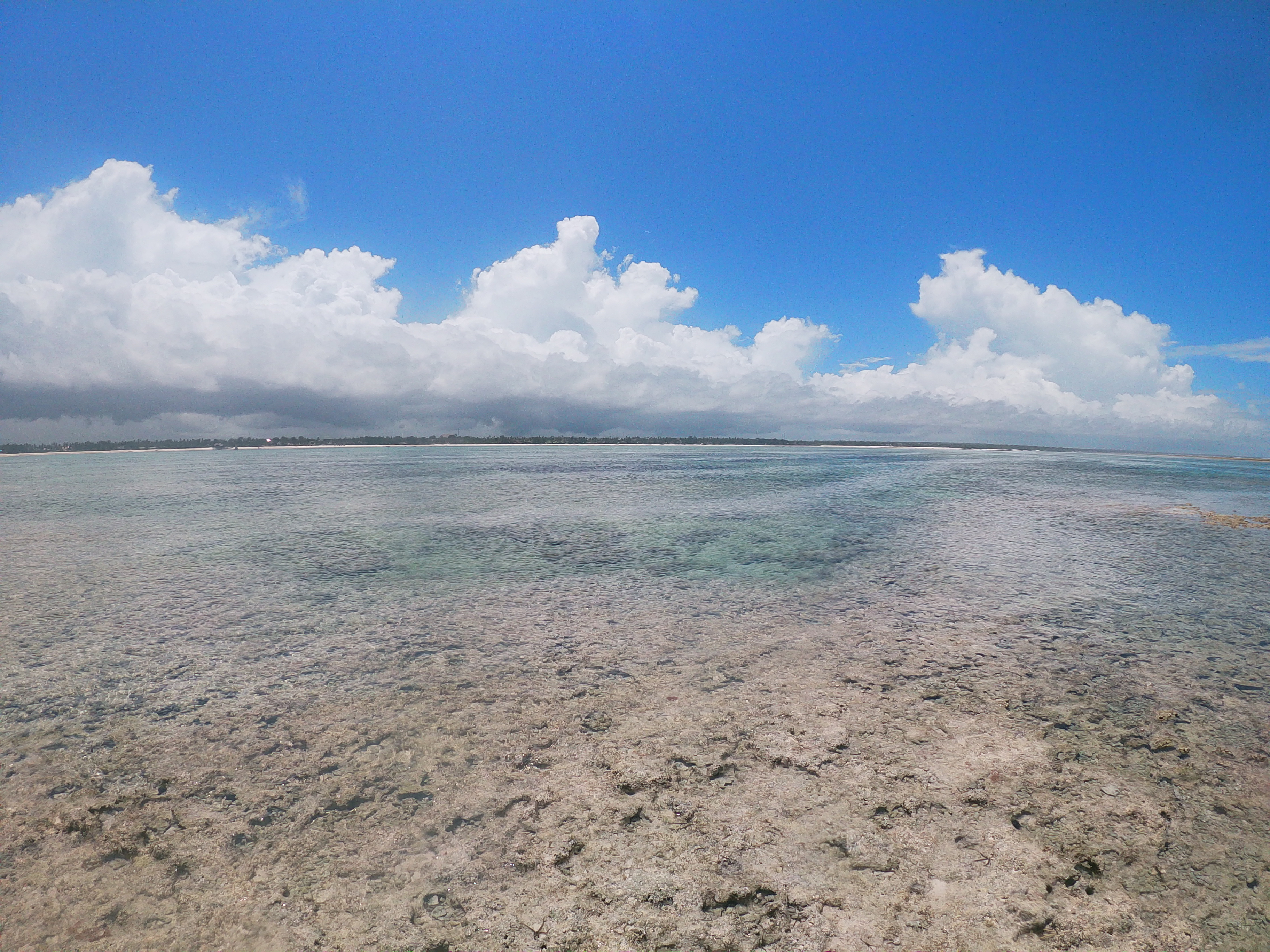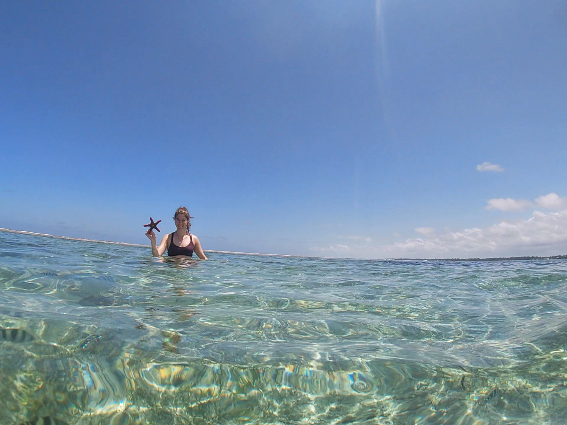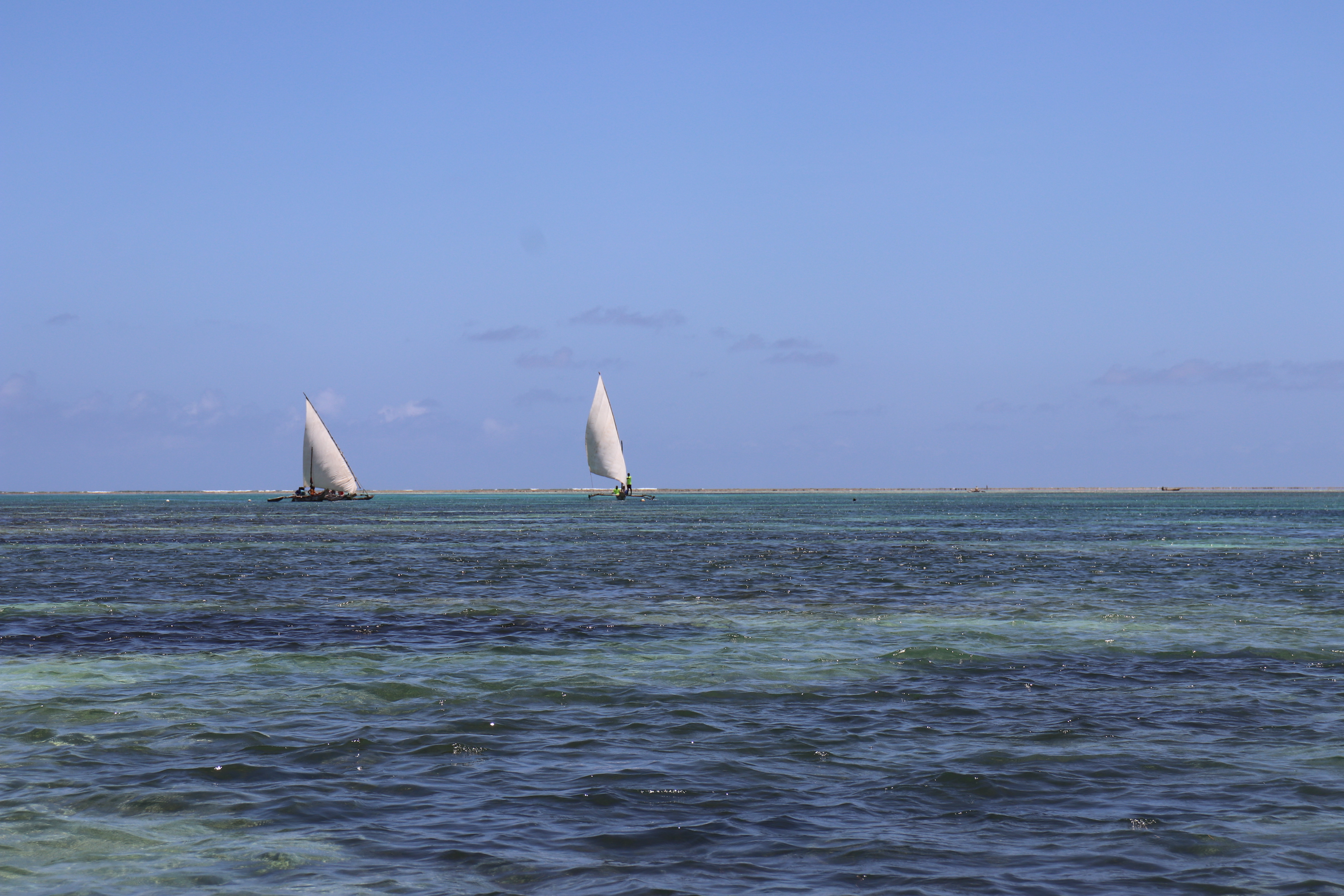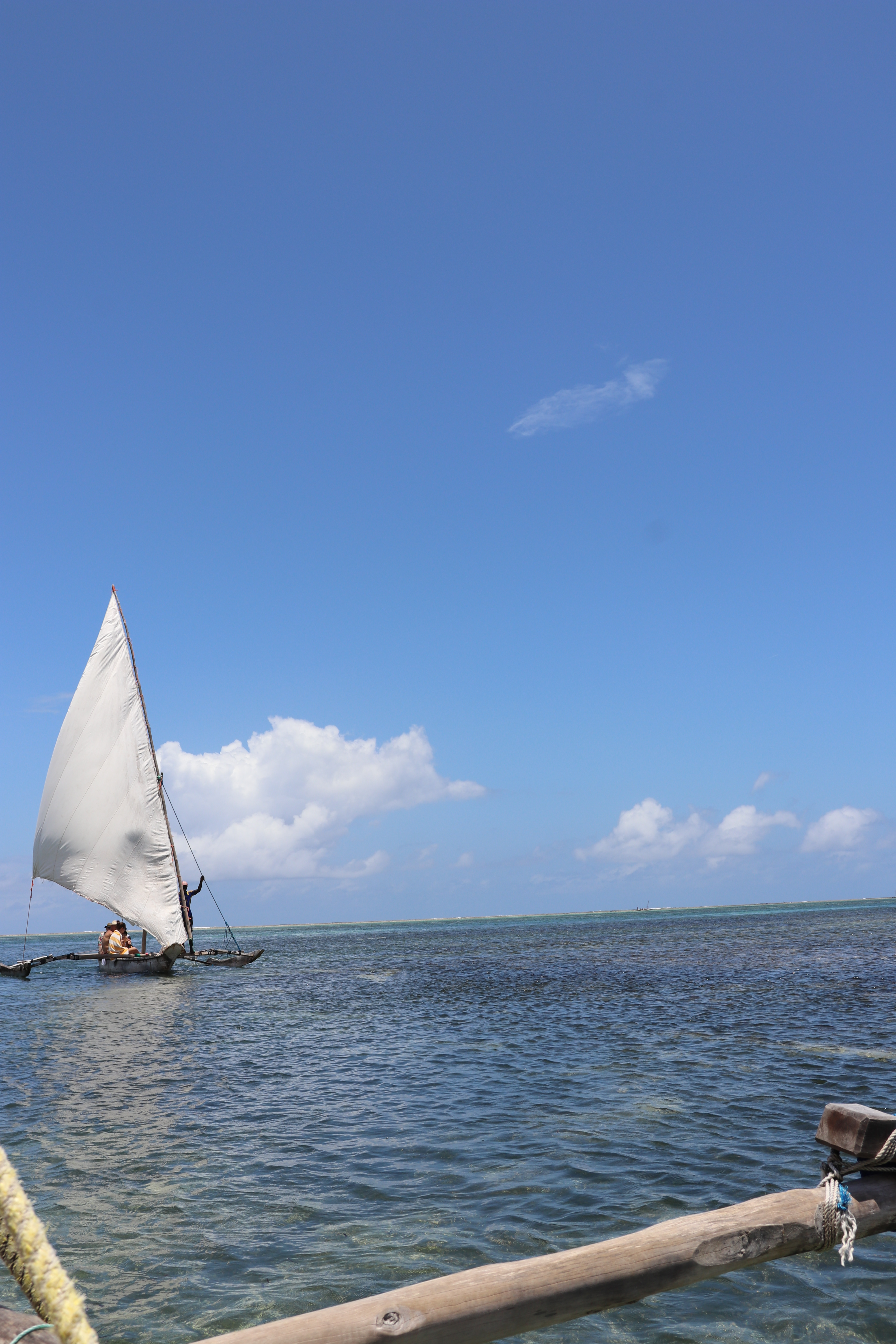 After some more lounging and swimming on the second day we decided the next day to go for a snorkeling adventure. We were met at 12:00 and picked up by a dhow boat – which is a traditional boat used by fishermen in Zanzibar (as well as tourists going snorkeling). Since the tide was pretty far out at this point we had to walk a bit on the moist sand to meet the boat. The construction of the boats are really unique and made from local wood. The part where you sit is skinny and looks to be a hollowed out tree trunk and there are pieces of wood attached on both sides by branches which help balance the boat. And the sails are also made out of long branches- however we used these only on the way back – on the way out our guides (one in the front and one in the back) took us out to see by using branches to push off the sand below us. Since it was the time the tides were out we were really mostly just in a few feet of water below. Comping back later though it was really interesting to see how they used the branches and a series of ropes attached to maneuver the sail.