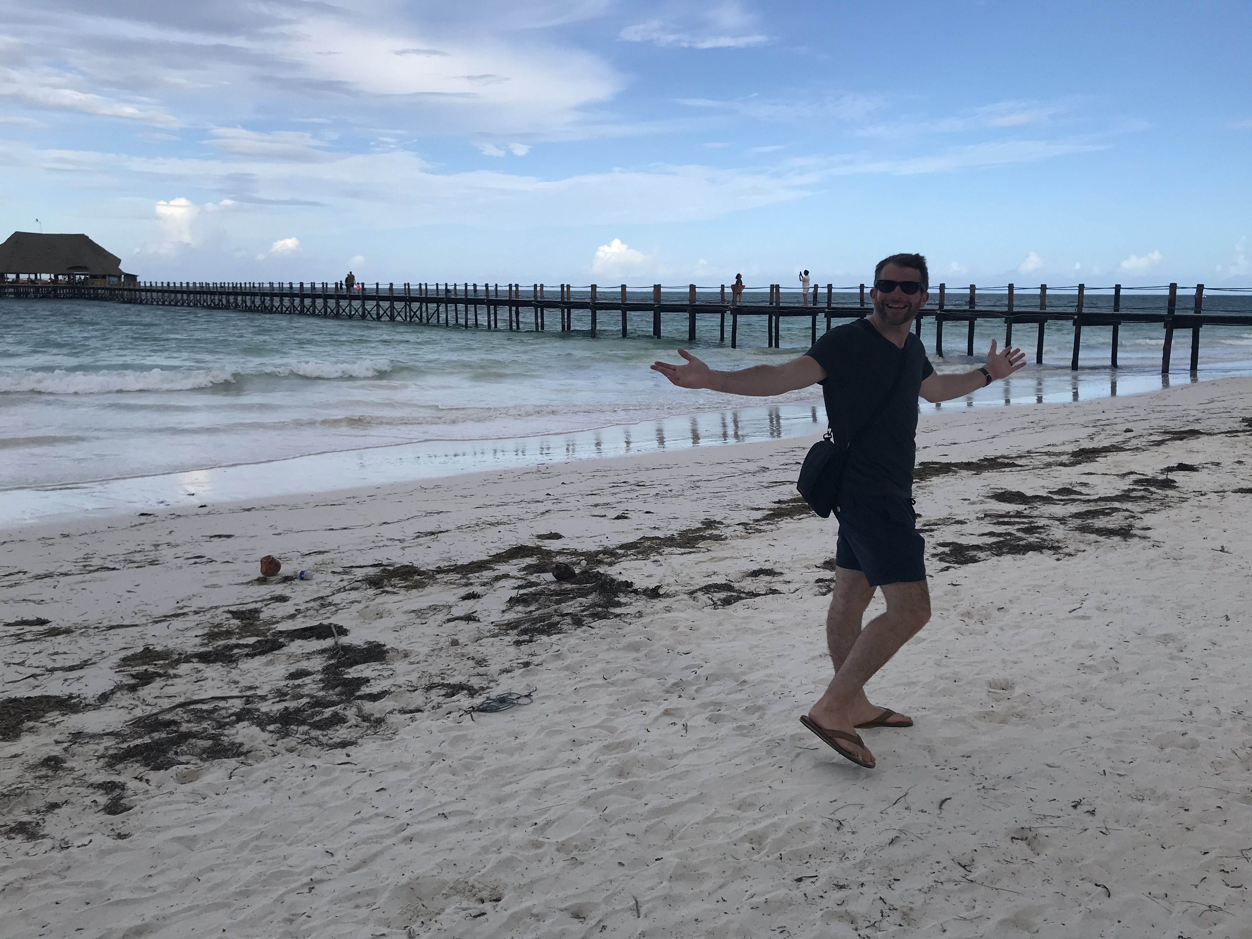 Once able to get in our room we switched into bathing suits and headed to the lounge chairs on our hotel’s private beach. It was so nice to sit and relax in the sun, just watching the people walk by and the tides move in and out. The tides are one of the more interesting we have ever seen. In the mornings they go nearly a half mile out and by the evening they have come all the way up to the beach where we are sitting. And every day it happens the same. The tides shift so far over the course of the day. You can especially see it in the below pictures using the pier as a reference point. At the end of the pier there is a restaurant where we had lunch one day and also enjoyed some sundowners while watching the water flow by.
