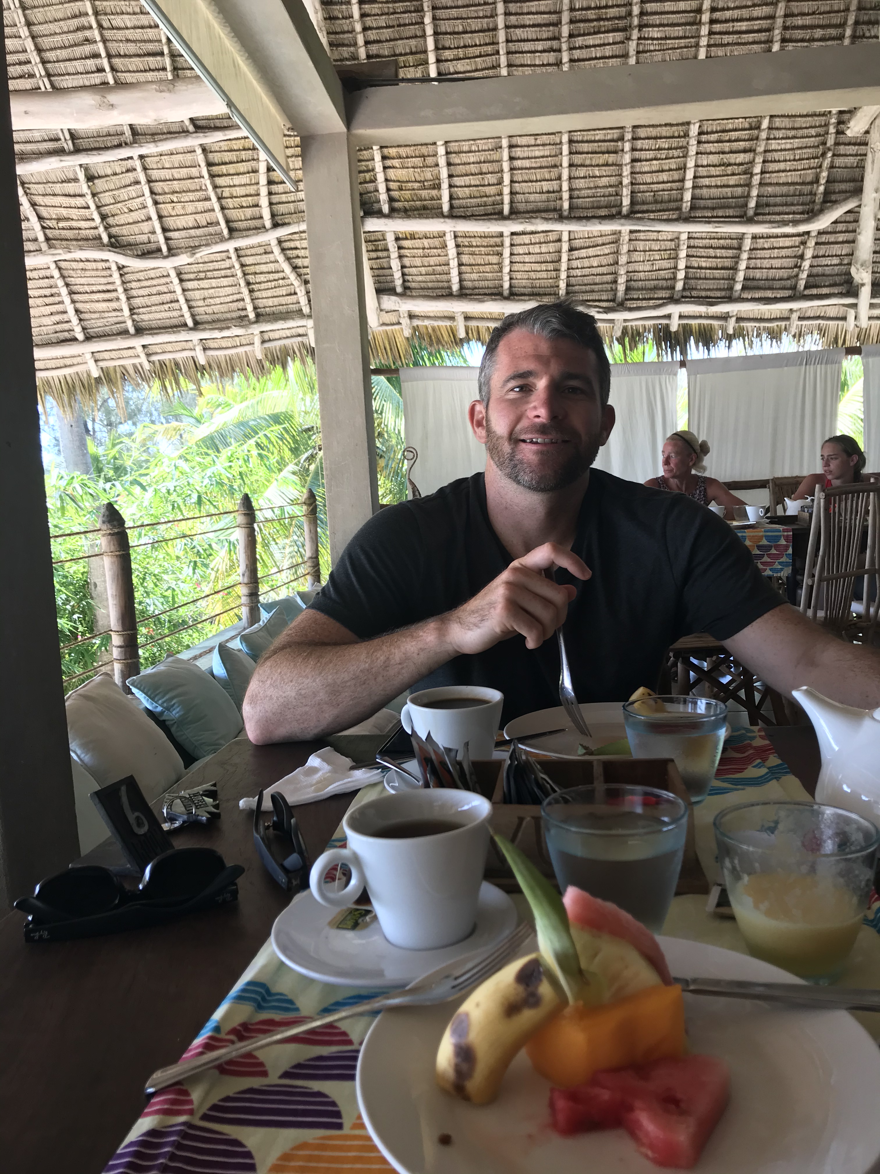 We arrived at the Mvuvi Beach Resort and were greeted with delicious fruit juice and wonderful smelling local flowers. Mvuvi is Swahili for fisherman. Since we had arrived earlier in the day (it was about 9:45 at this point) we were taken to the restaurant to enjoy breakfast and had our first view of the white sands and crystal blue water. We sat for a bit and enjoyed a delicious breakfast of eggs and avocado and some of the freshest fruits we had tasted (banana, papaya, pineapple, watermelon, passion fruit, oranges).