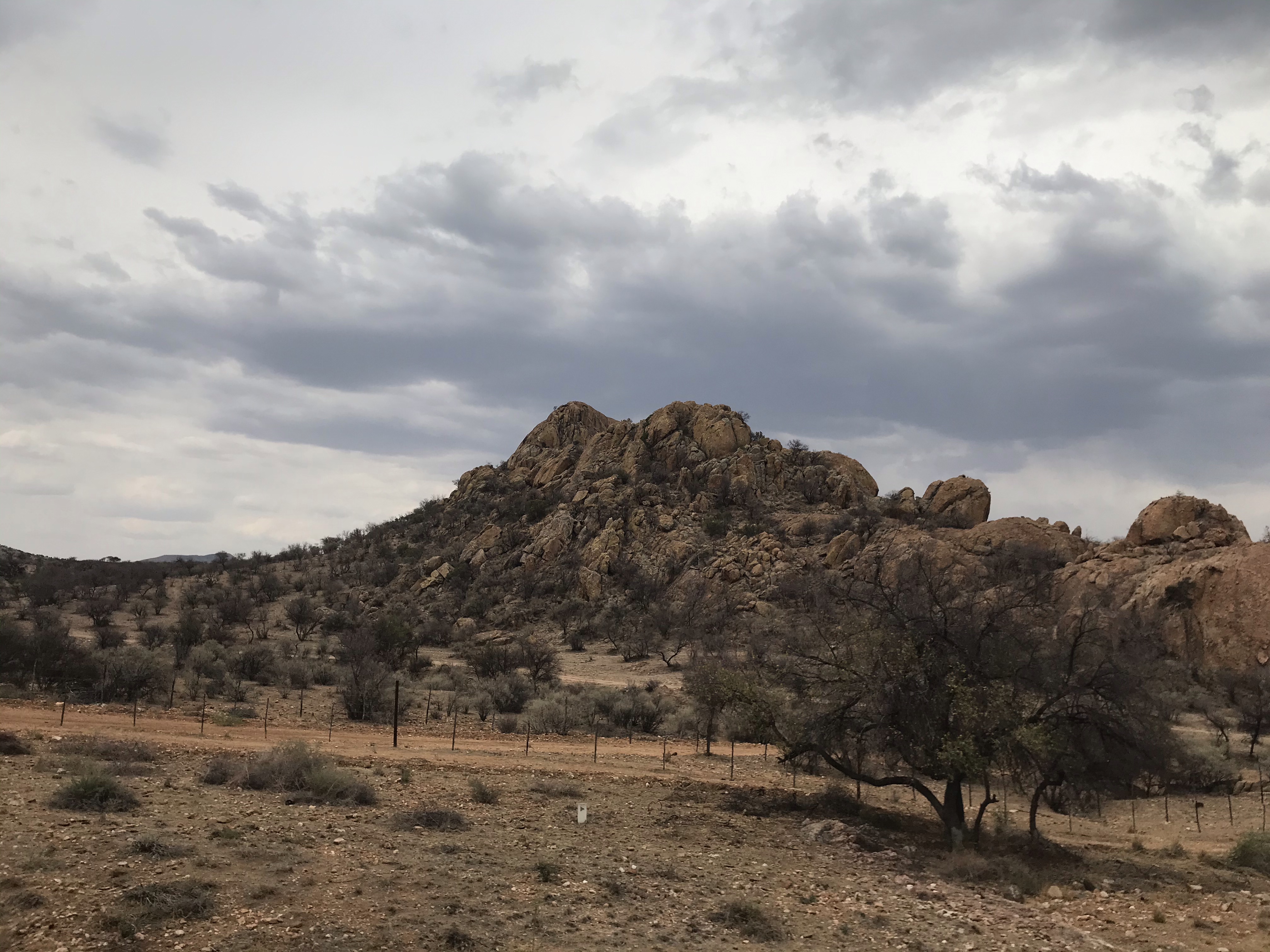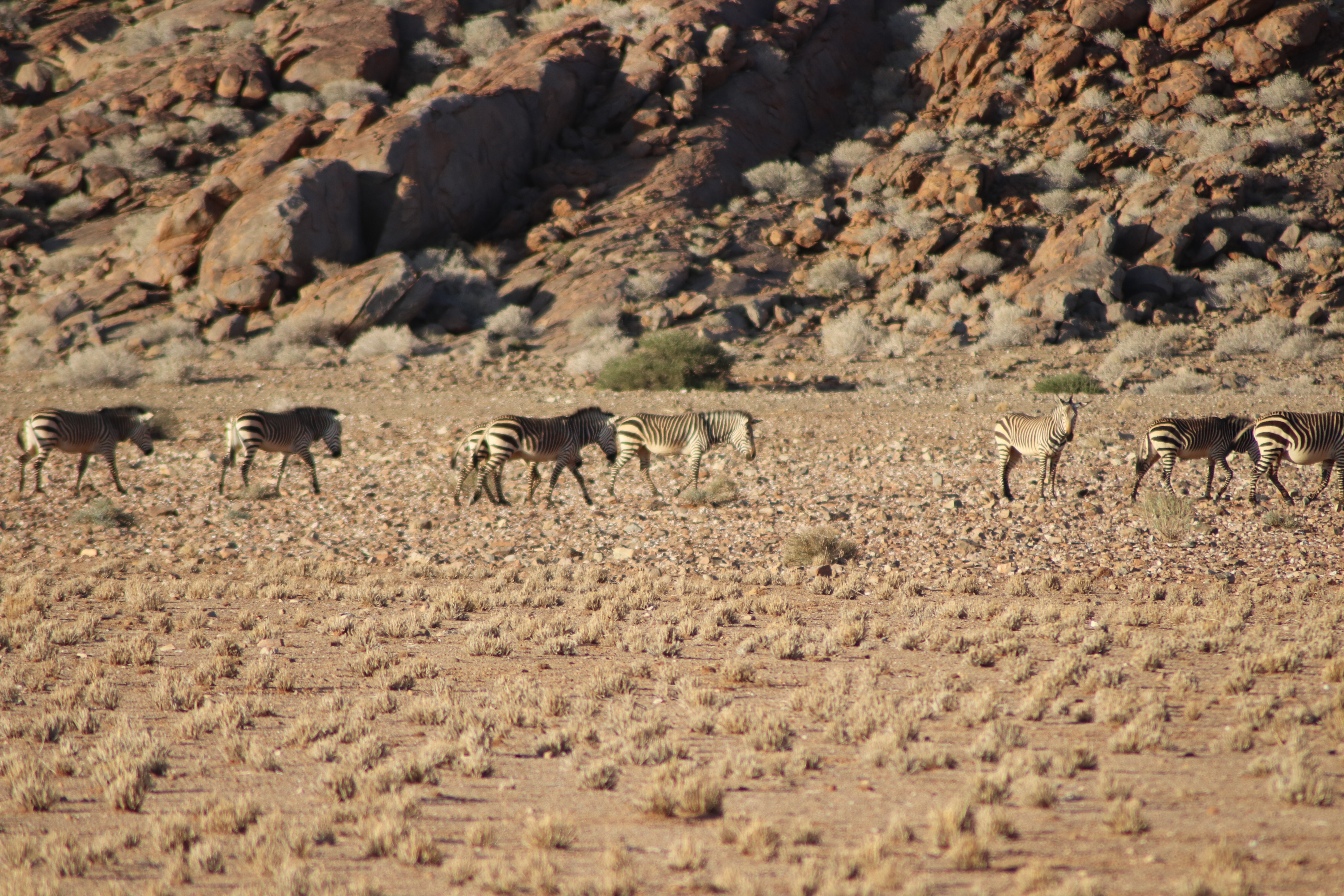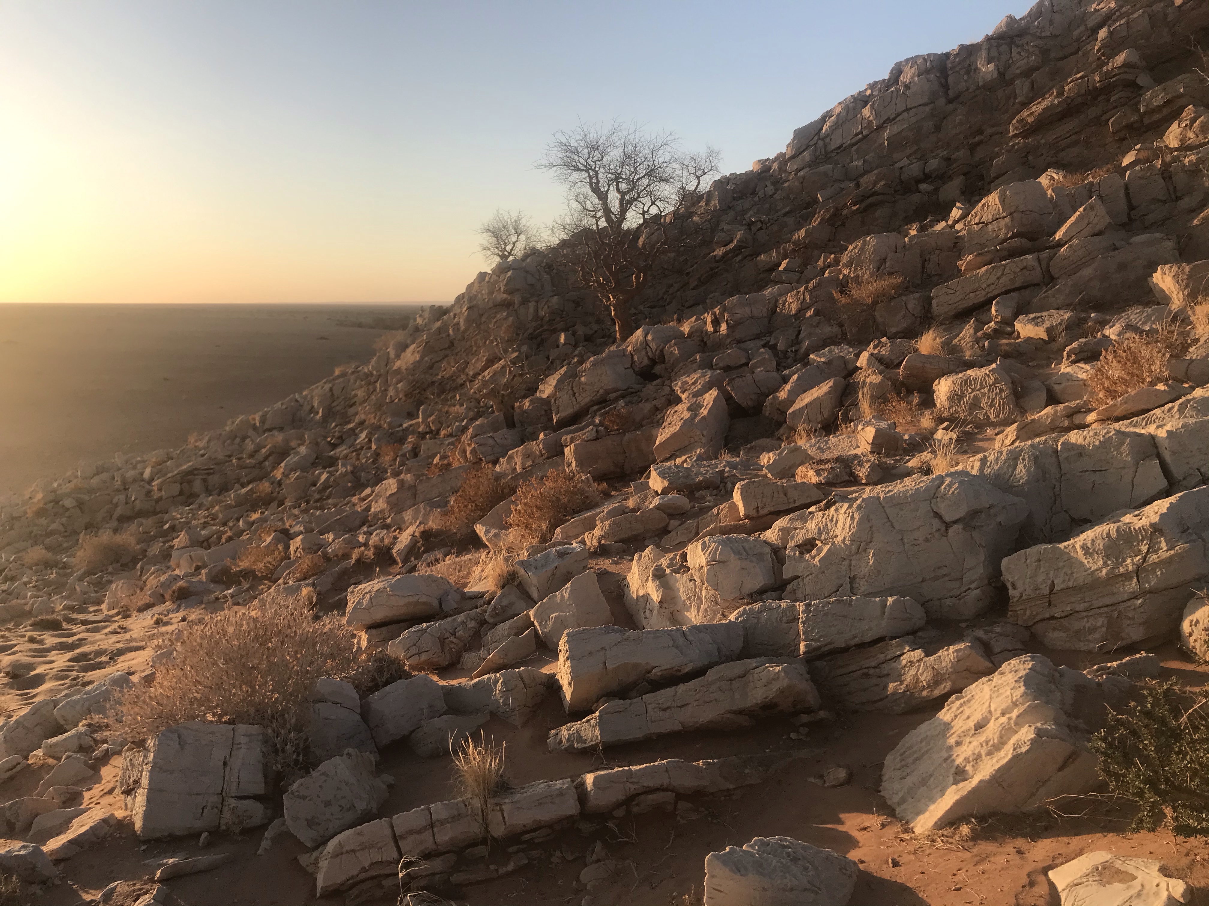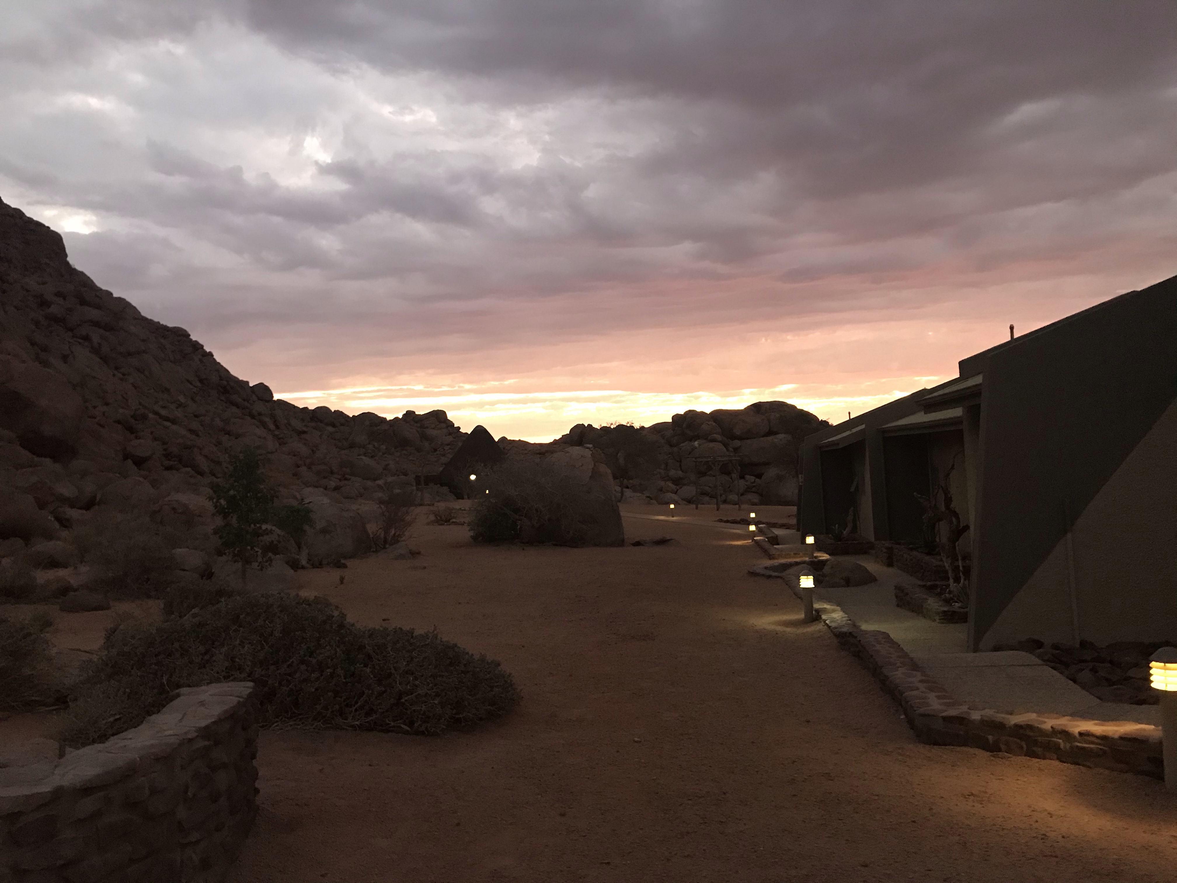That evening we went for a sundowner drive on the property of the lodge which is quite large. We drove 15km from where the lodge was to watch the sunset and still had not reached the end of the property. Along the way we had another few spottings of Namibian wildlife – more oryx and springbok and our first view of a pack of mountain Zebras. We watched them for a while in the distance but it was also clear they were watching us. Finally we came to the Marble Mountains which were mountains on the property that were in fact made of marble. We learned that due to the extreme heat and cold over the years the marble could not be mined due to their fragmented state. So as we began our sunset watch, we found smashed pieces of marble to sit on, sipped on a sundowner drink, and watched as the sky filled with reds and yellows and purples in front of us as the sun went beyond the horizon. We returned to the lodge by twilight where we had another delicious dinner. While we were sitting eating on the patio, two wildebeest came up out of the darkness the watering hole just a few feet away for a drink. It was another reminder that we were really sleeping and living among the wildlife over the past days.