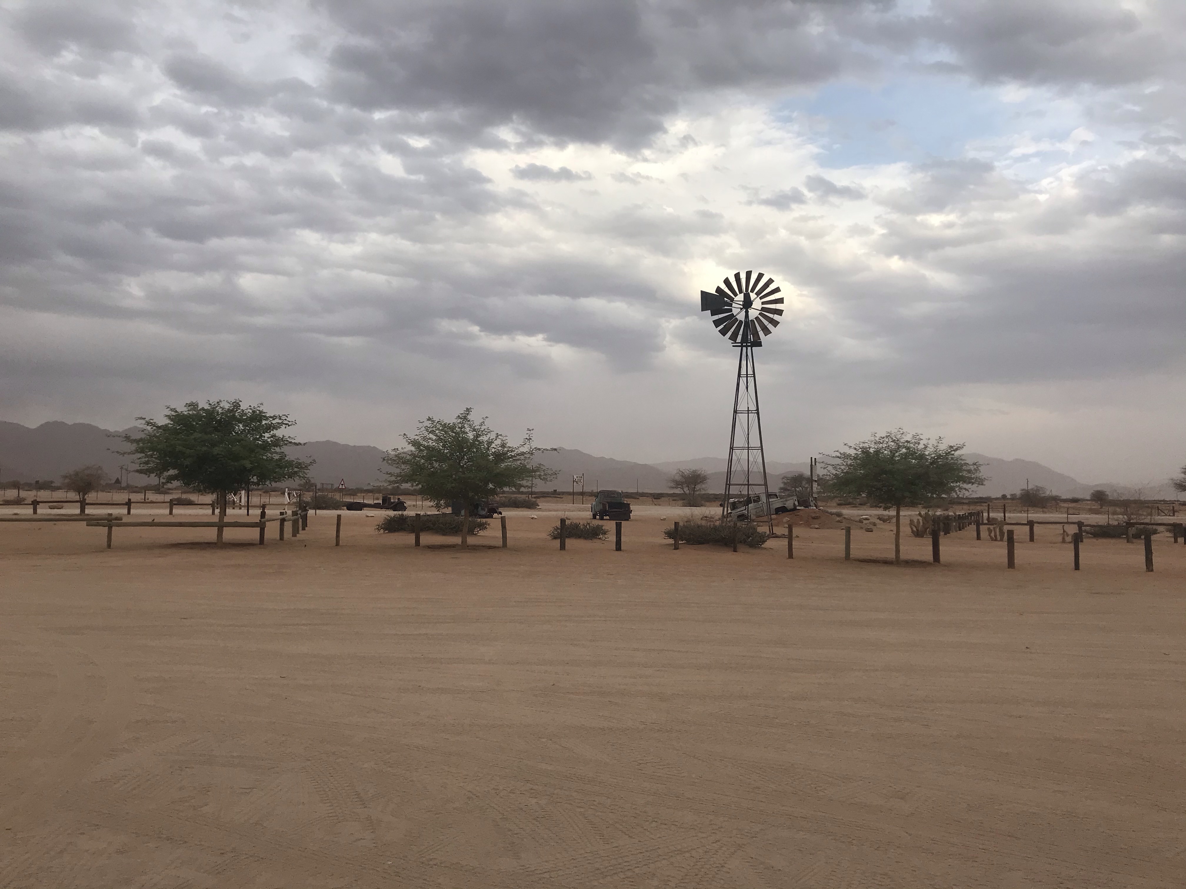 We re-met Berron and the rest of our group after lunch and set off in our vehicle on a 4-5 hour drive bouncing around mostly gravel roads to the lodge we are staying in the next two nights in the desert. There are four others in the group besides us – 2 from Australia and 2 from Austria. Along the way we saw a lot of interesting landscapes and made a few stops in the desert, including at Spreetsgoogte Pass, which is one of the steepest and most beautiful passes in Namibia, overlooking miles of mountains and sands. We also stopped at a town appropriately called Solitaire which had a gas station, general store, lodge, and very few houses. One other stop along the way was to learn about nests built by the weaver birds – which are a type of sparrow that build these massive nests out of twigs that they live in for years and years. There was really not much civilization on this drive – a few farmhouses here and there, but not much else. Agriculture is a big industry in Namibia which consists mostly of beef because the soil types and climate make it difficult to grow a lot of different crops. The other major industries are mining, fishing, and tourism. We also saw our first glimpse of wildlife – springbok, the national animal of South Africa, and the oryx which is the national animal of Namibia – both of which are types of antelope.