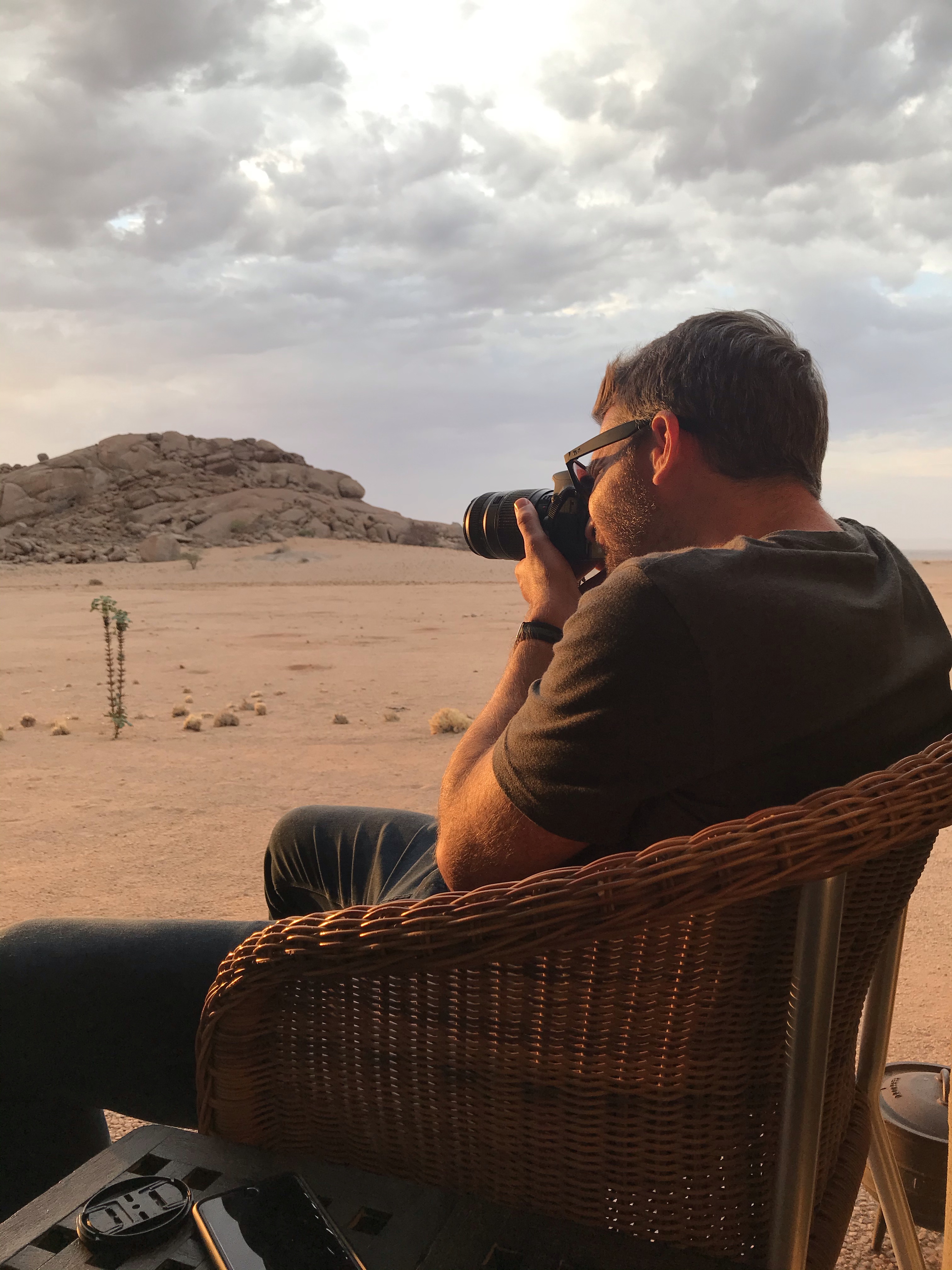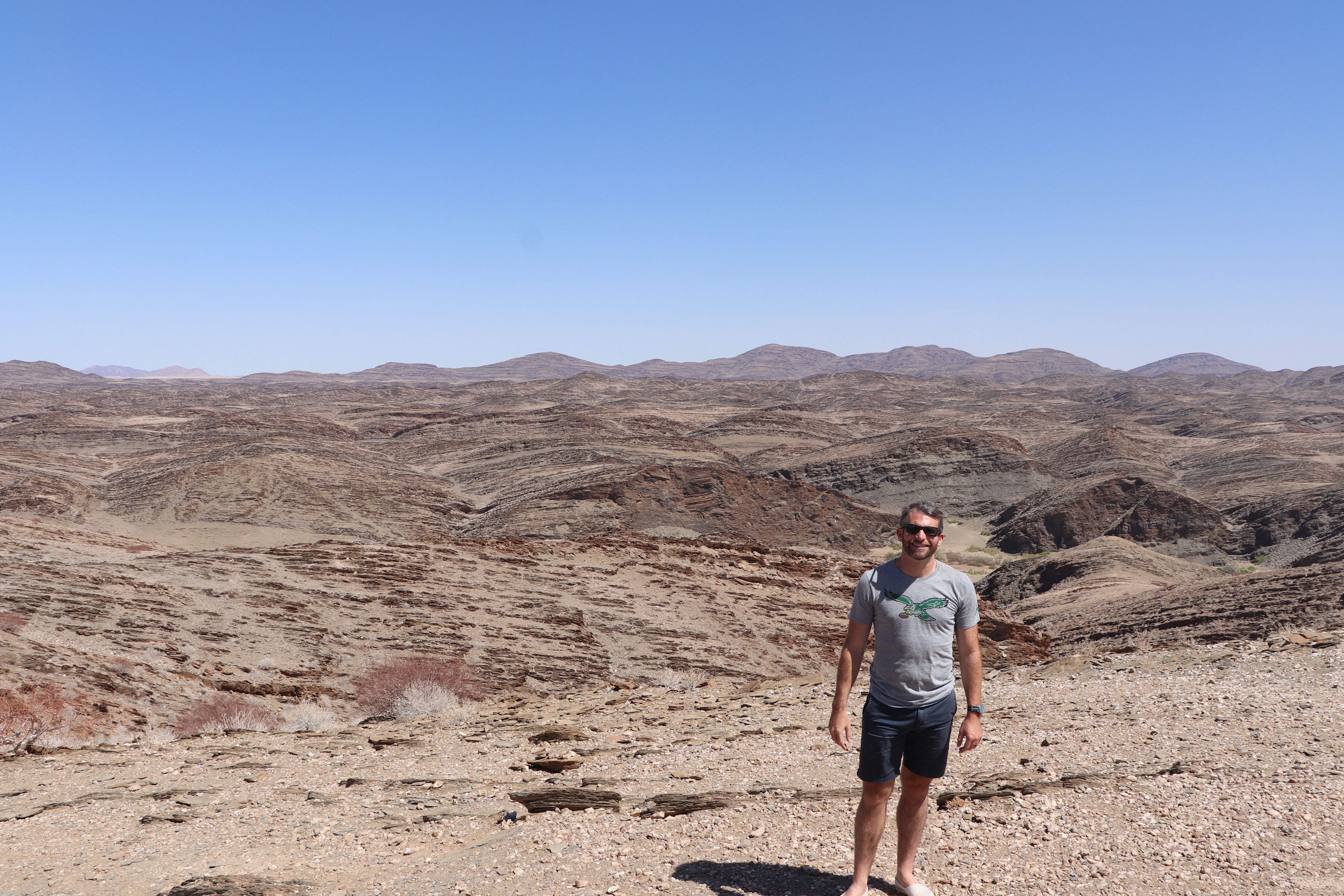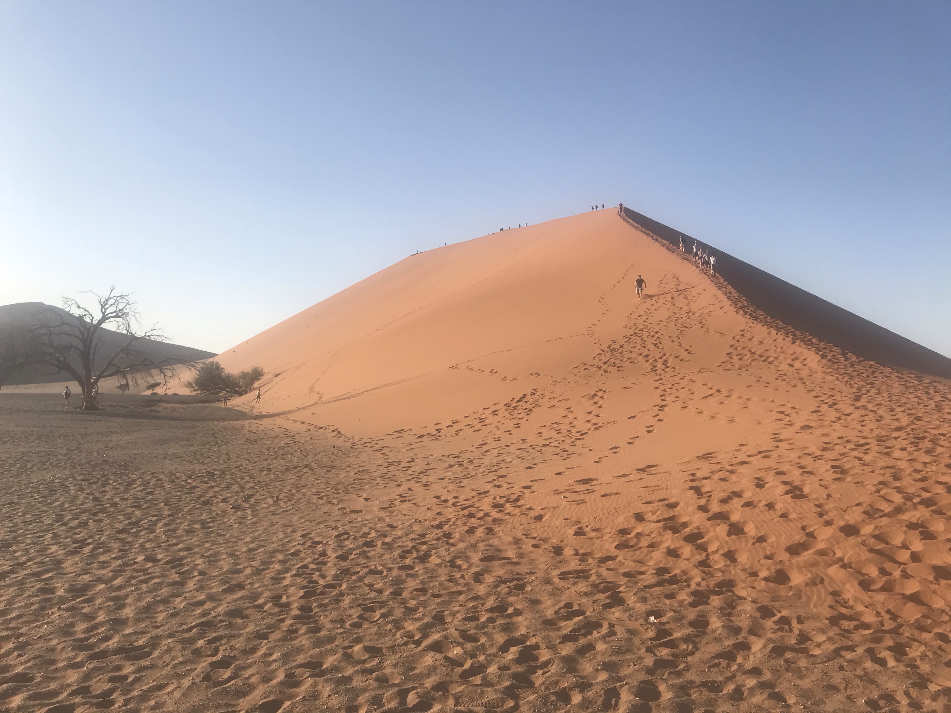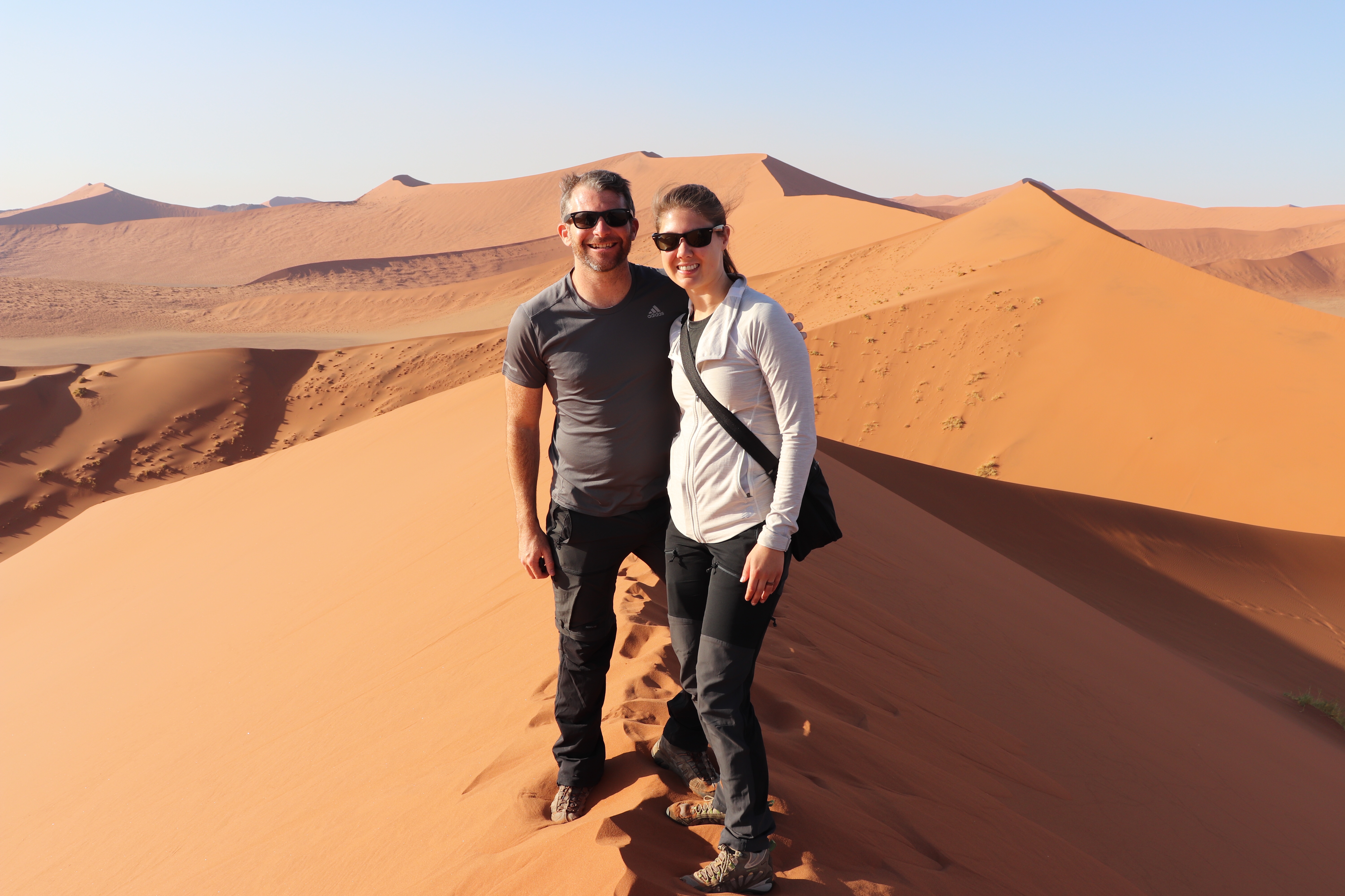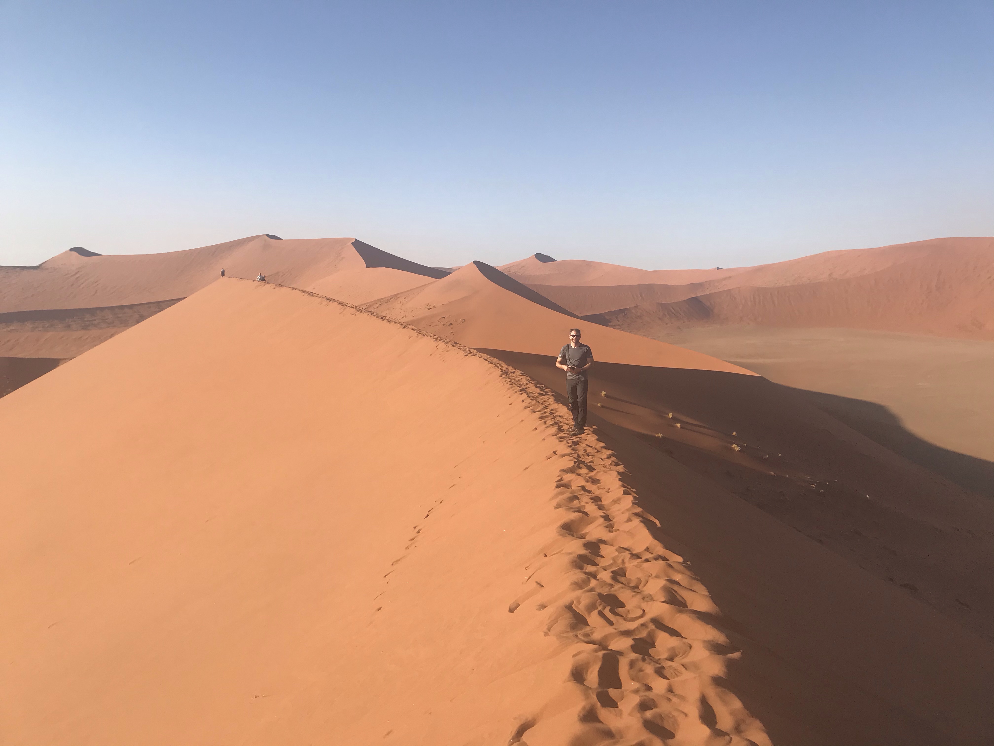 We came to kilometer 45 along the road and saw the (aptly named) Dune 45 next to it – the 200m dune we would have our hand at climbing. We thought we had left behind hiking as the sun came up in Tanzania, but the climb to the top of the dune was really spectacular and worth the early wake up. It was a bit tougher on the legs than the the daily hikes we had done recently in that we were climbing through sand the entire time, sinking in a bit with each step. We made our way to the top along the crest of the dune in about 30 minutes and enjoyed the magnificent views in every direction along the way. Coming down is a much easier affair and you have a few options. You can take that same path or you can go for a run / tumble / slide down any point you wish. Fred went for the slide but with the thick sand it was hard to get too far and he ended up astronaut walking the rest of the way. Later in the day as we passed back by the dune on our drive out we could see all the footprints, tumbles, and slides had been wiped away in the sand by the wind.