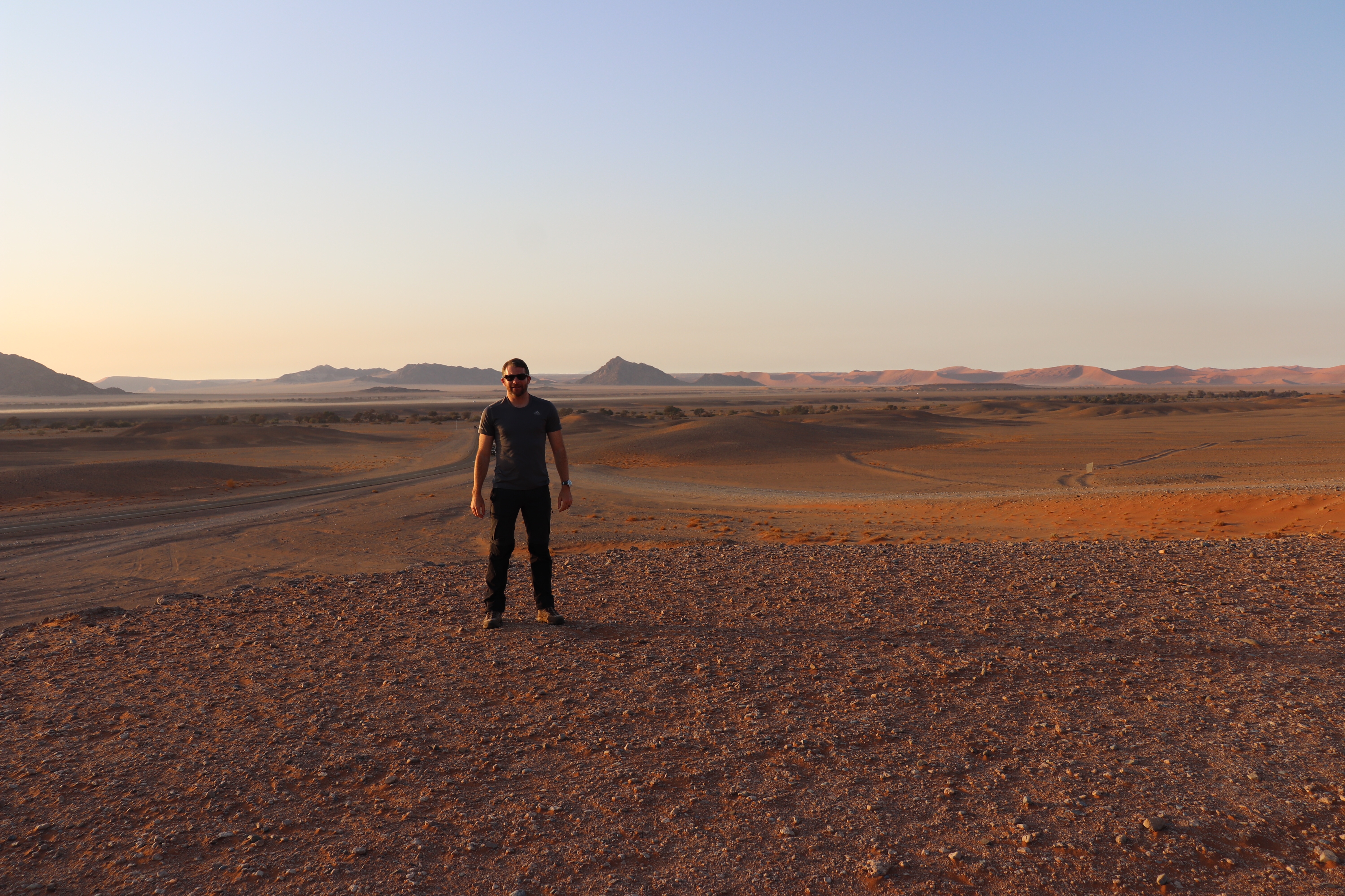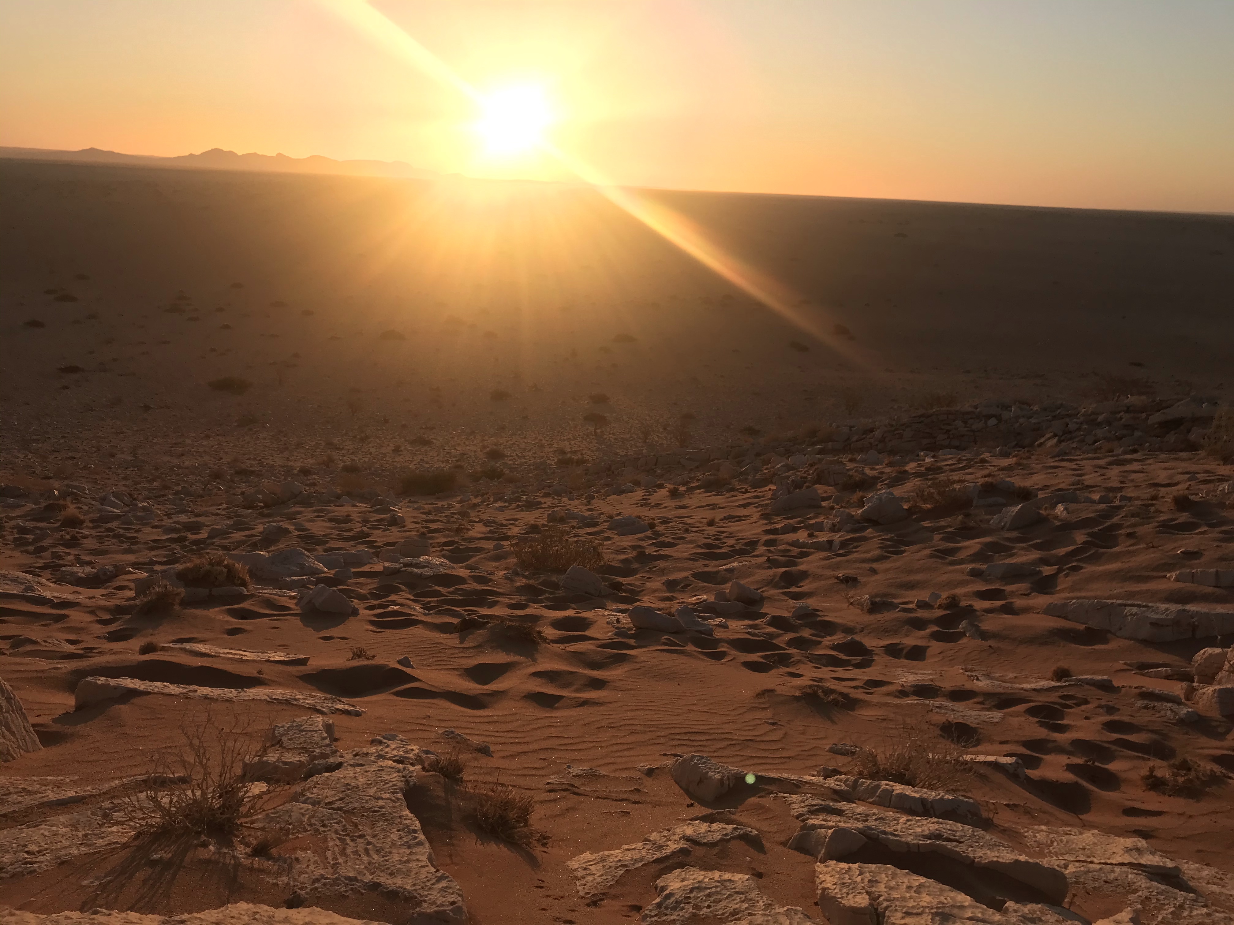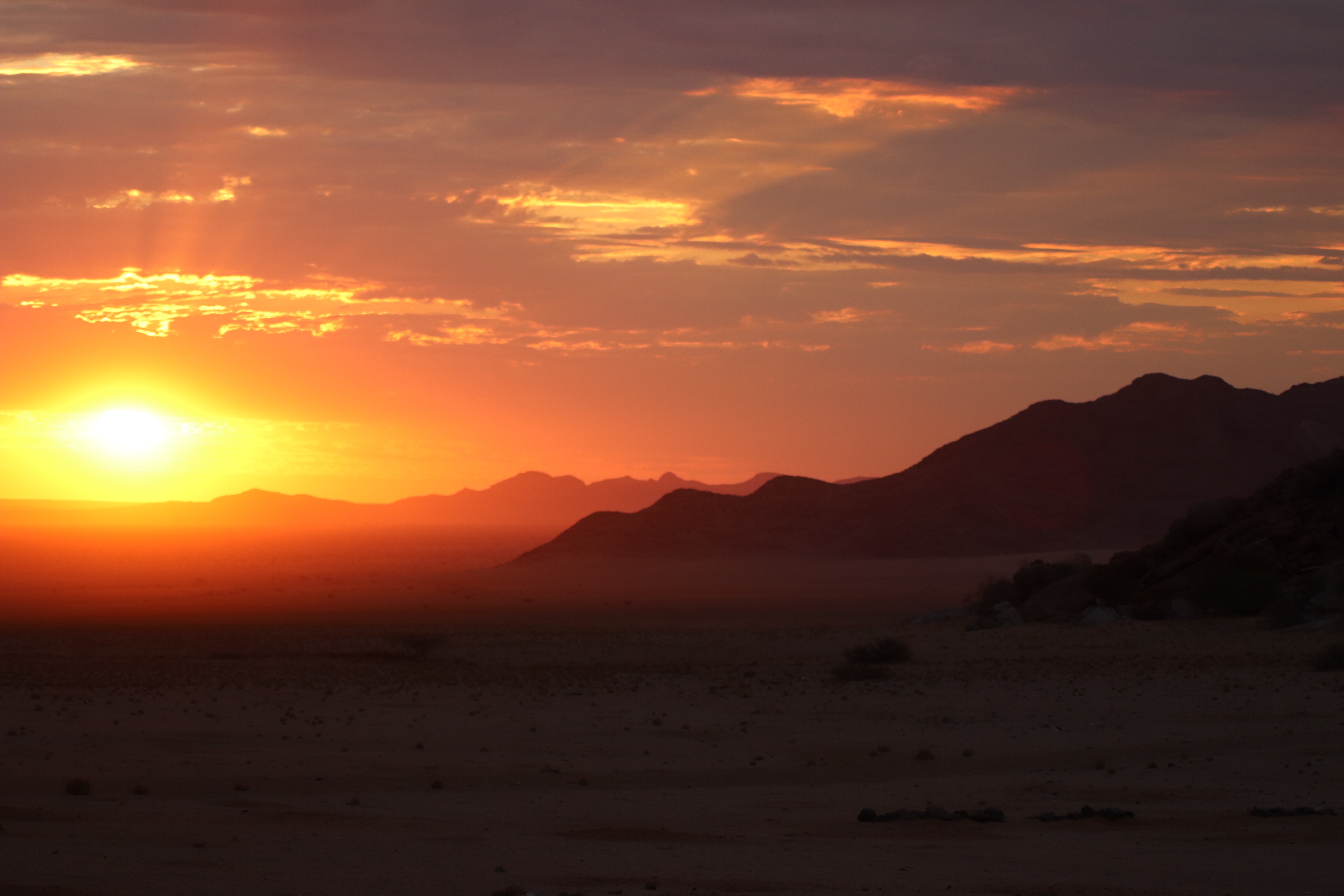 We arrived to the lodge and were shown to our rooms. As soon as we opened the curtains we saw that our patio had an incredible view out to the desert ahead. With any luck we might see some animals wandering by over the next few days. We sat on the patio and watched as the sun went behind the clouds and the horizon, lighting up the surrounding area in beautiful colors. Our hour of free time after checkin ended quickly and it was time for dinner where we moved back to the lodge our new friends and guide. The meal consisted of butternut squash soup, oryx and polenta (yes that same oyrx that is the national animal and we saw earlier that day), and a delicious (and probably very local) beef filet. We would have a very early wake up call tomorrow – 4:15 to be exact – and headed to bed quite early. The next day we were headed for the sand dunes in Sossusvlei, about 2 hrs drive fr the lodge. The key was getting there just after sunrise before the sands and dunes were too hot and the desert heat rolled in and also prior to the dozens of tourist drivers after gate opening at 6:15AM.
