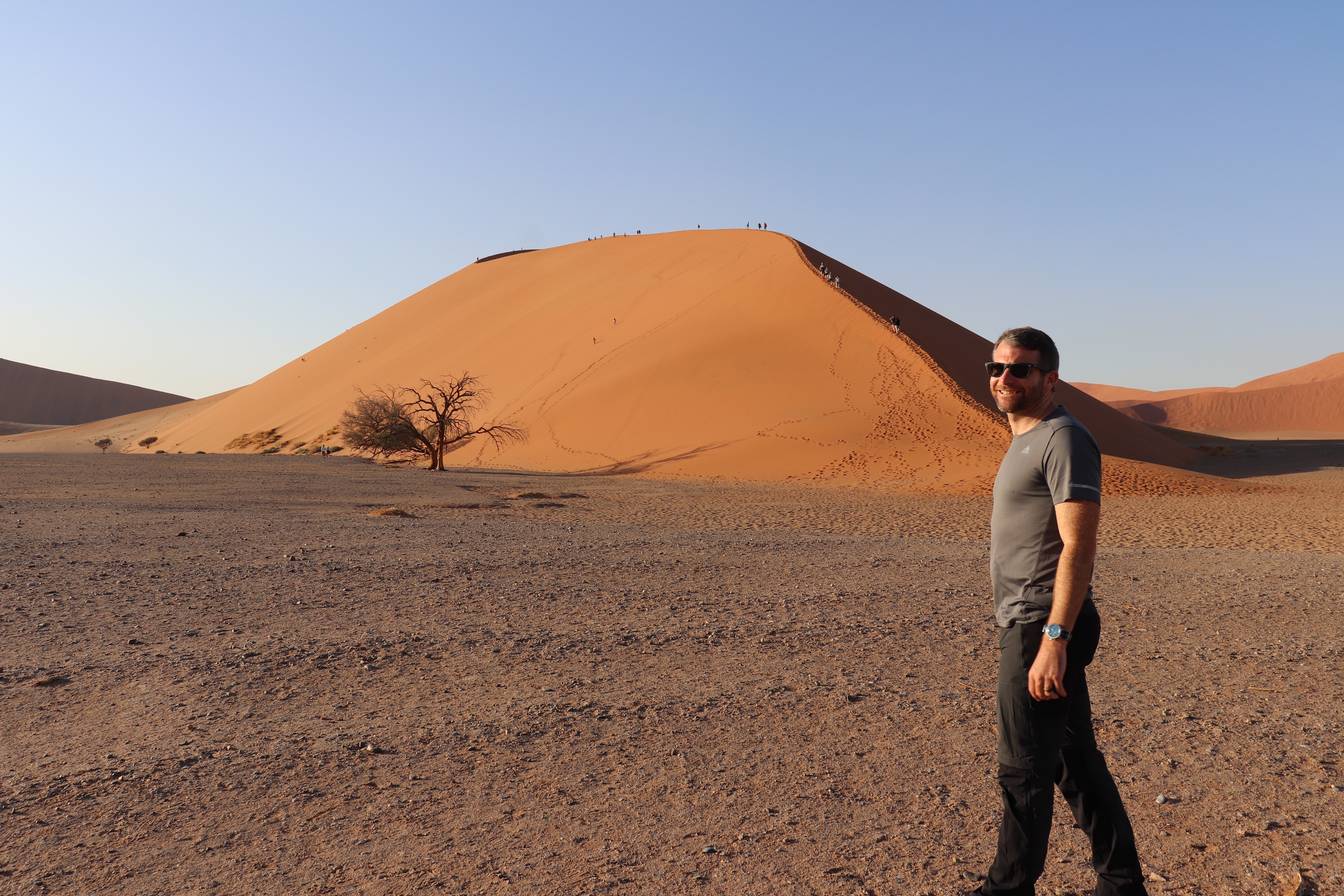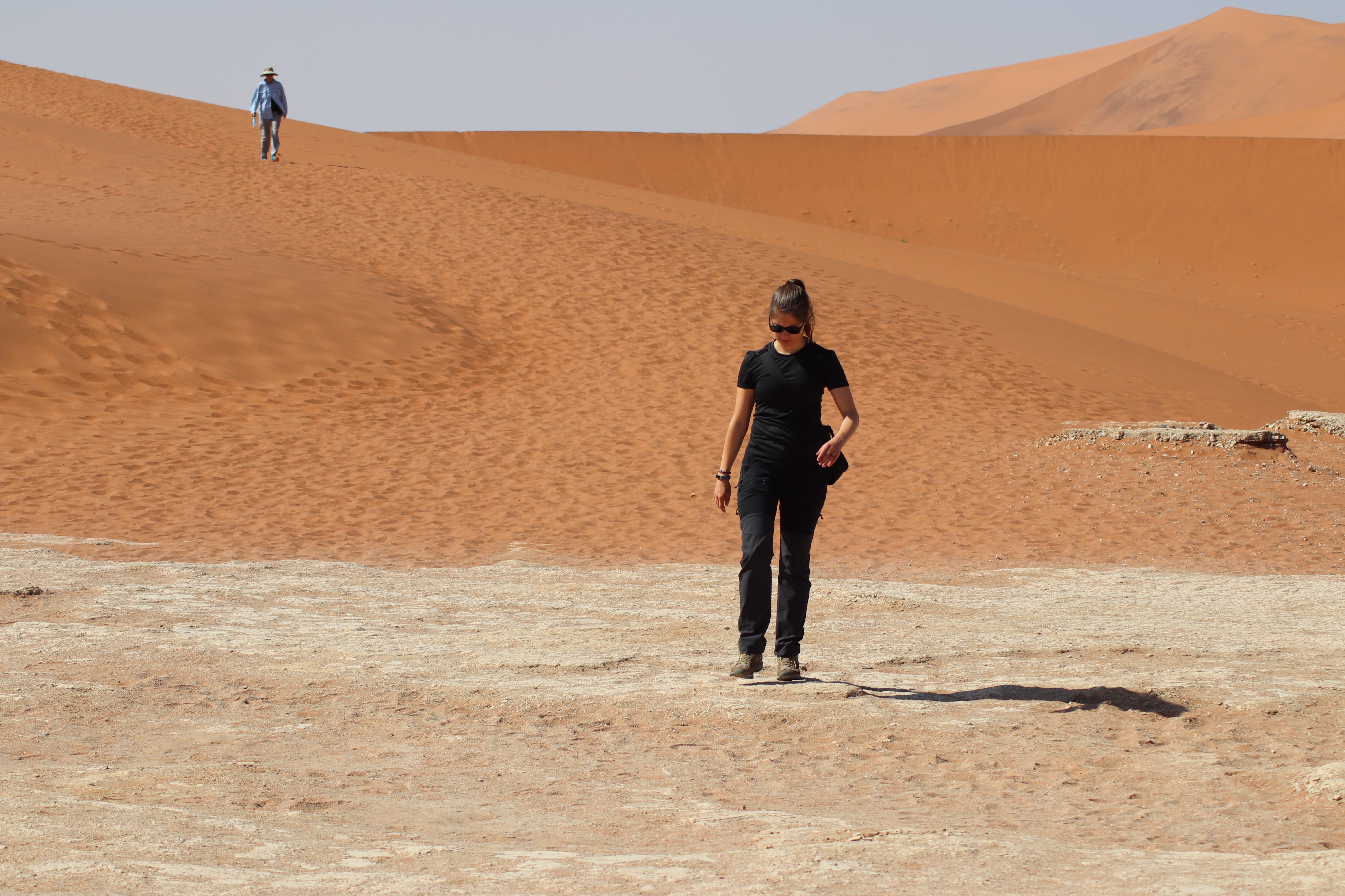 Then it was time for a picnic breakfast under one of the massive camel thorn trees which are found in the park. These are one of the few trees that can survive in the desert because their roots are so long they can stretch under the ground up to 60m long to find underground water sources and are not dependent on rain. After breakfast we saw Sossusvlei (cue Fred singing Phil Collins all day) which is the river bed that marks the end of the Tsauchab River, which no longer flows all the way to the Atlantic as it is now – and has been for years – blocked by the dunes. We could really feel the heat now and made a quick stop at the Sesriem Canyon before making the drive back to the lodge.