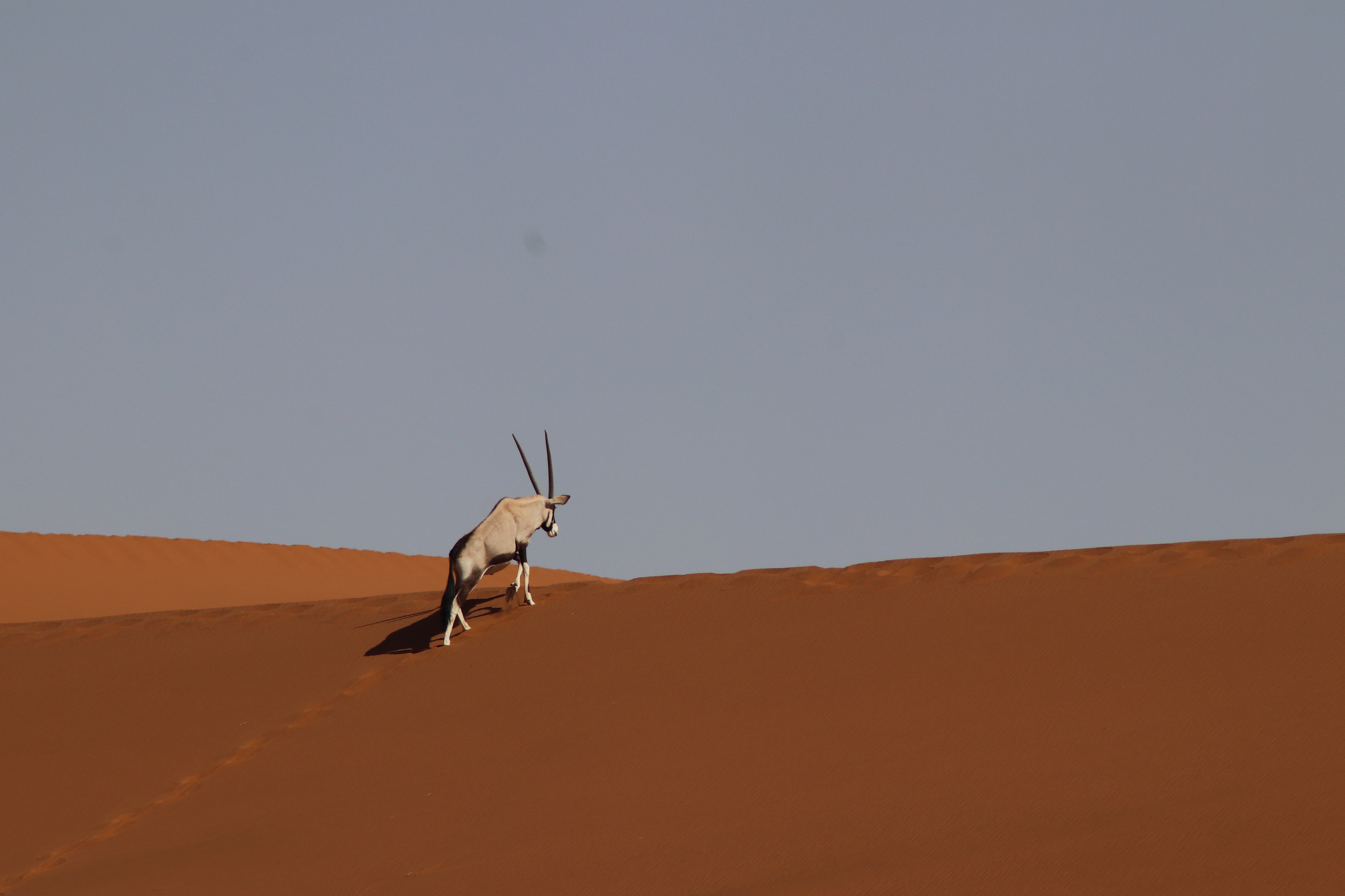 The path through the main part of the park is tarred (since there would be too much dust with so many cars traveling on it) but soon it was back to off-roading time – this time sand instead of gravel. Only 4×4 cars are allowed past this point – we could understand why when we saw a smaller vehicle being pushed as it was stuck in the sand. We bounced around much more in the car on the sand but luckily we didn’t have too far to go, and soon approached the tallest dune (350m tall) which is also know as Big Daddy. Our guide told us it typically takes 2-2.5 hours to reach the top, and we watched as people were starting to climb it even as the heat was rolling in. Our destination however was next to Big Daddy and we walked for a bit through patches of the dunes to reach Dead Vlei. This is an old dried up water bed that has not had water from the river in hundreds of years and has dead trees that are all 900+ years old sitting all throughout it. While we were walking through an oryx came by and we paused for a bit to admire and catch some great pictures on its slow walk.