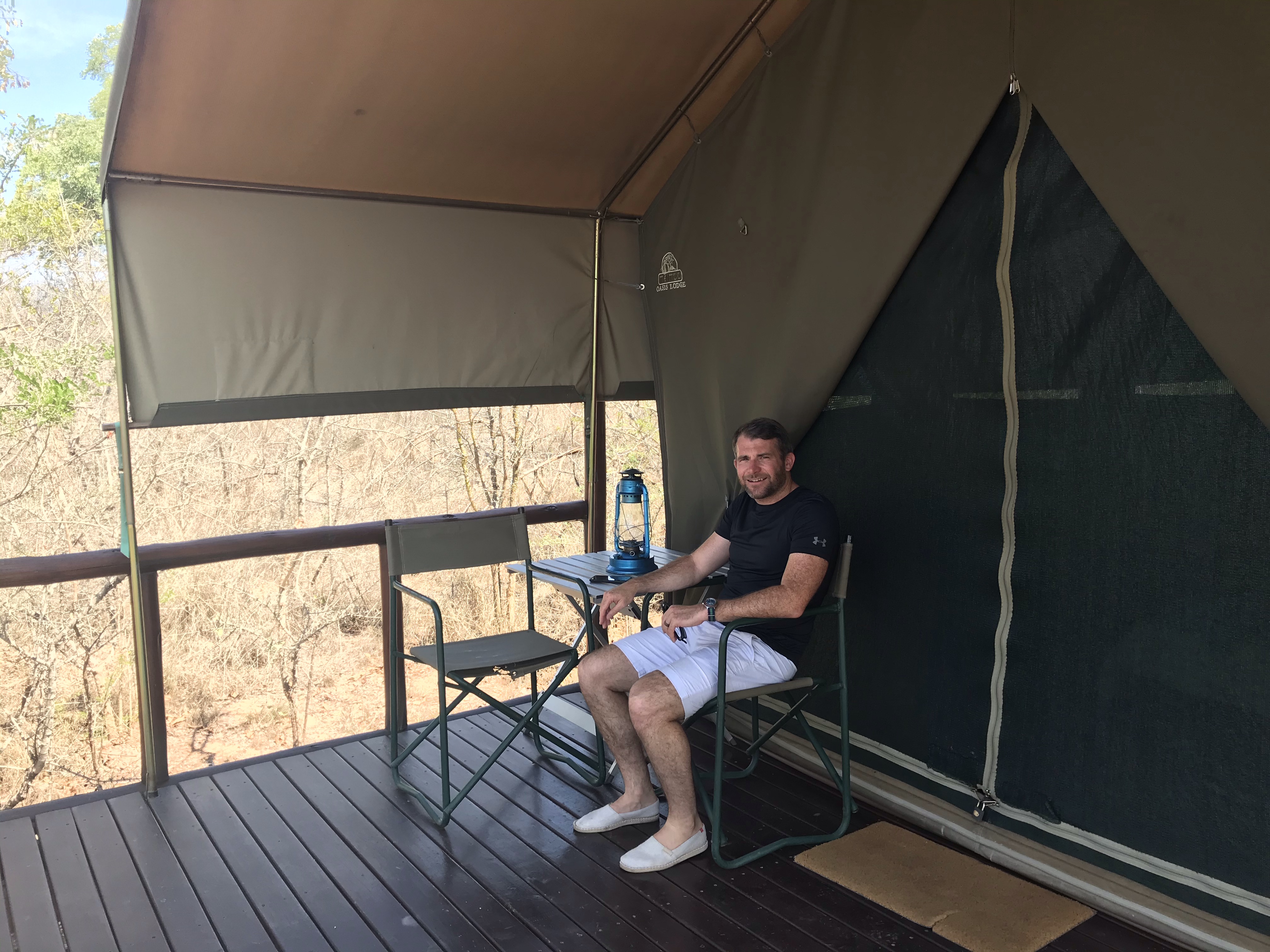 It took us approximately 6 hours to reach our safari camp – a 5 hour drive from Johannesburg plus a one hour stop for lunch along the way at a local African fast food meat joint. We arrived and met the guides who would be with us at the camp for the next few days – Drikus, Sinead, Richard, and Leonard (the head of cooking and maintenance). We had a quick tour of the common areas of the campsite – the ‘lapa’ dining area, which was a covered open area where we would have breakfasts and lunches; and the ‘boma’ area around the campfire where we would enjoy our dinners under the stars. Following the intros, we then went to drop our stuff in our tent and get ready since we would soon be heading off on our first game drive. Now when we say “tent”, that term is used a bit loosely. Yes there are canvas walls, netted windows, and zippers to get in and out, but we also have a bed, dresser, toilet, sink, shower and running water and electricity. Oh…and air conditioning. Not so bad. After our week in Kilimanjaro sleeping on the ground in a small orange tent with no shower and a plastic box as a toilet (and we thought that was a luxury) – this was a nice upgrade. However this tent does still come with the bugs, spiders, and little lizards and, this time, lots of frogs keeping us up at night. The camp contains 8 of these tents, which are built on wooden structures. We even have a nice little deck facing out into the wilderness.