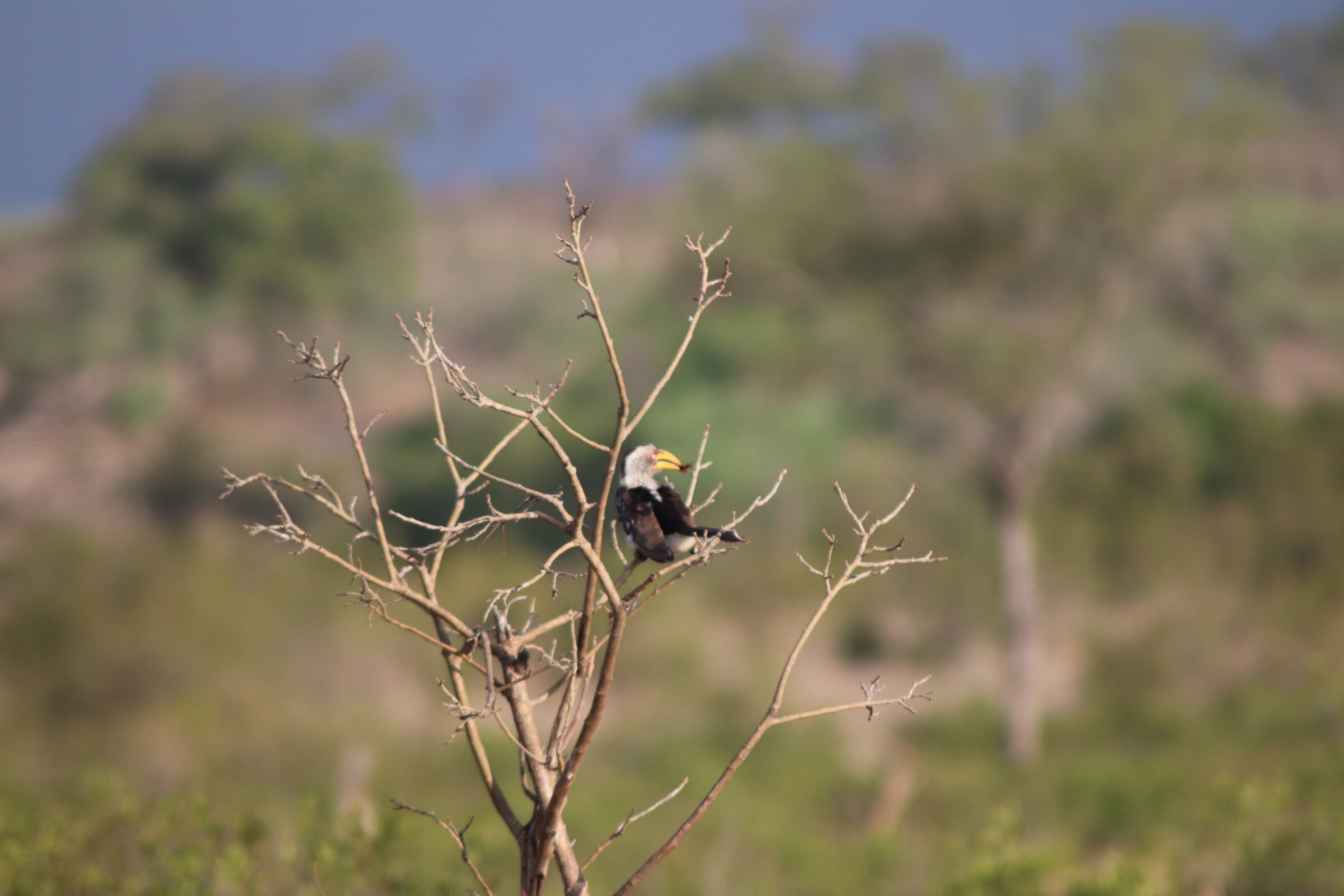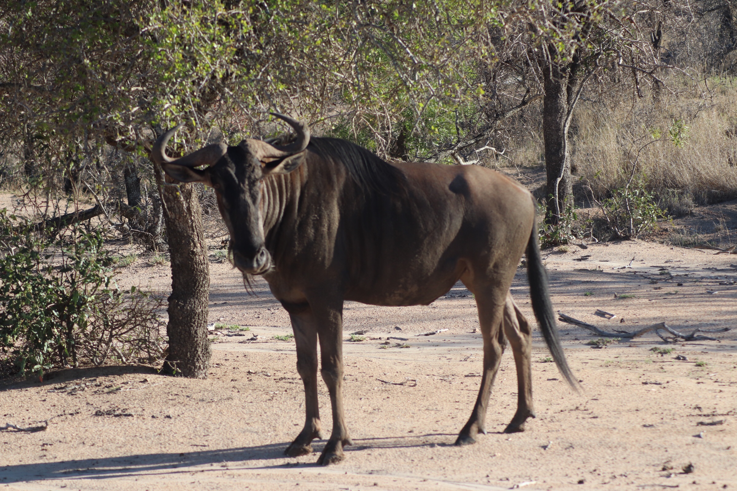 You could feel some anticipation in the car as we set off and everyone’s eyes peering across the horizon wondering when and what the first animal we would spot would be. It took some time and we were a bit nervous 35 minutes in with little seen, but our luck would soon change. We turned a corner and a group of about ten blue wildebeests was directly in front of us, only about 20 feet from the vehicle. It felt surreal seeing these massive animals so close. The group sat and grazed as we watched the group which included a very pregnant female. Our guides jokingly refer to the Wildebeest as the Frankenstein of the bush – because it has the face of a goat, body of an antelope, horns of a buffalo, stripes of a zebra, and other features similar to other animals. They are also one of the fastest antelopes in the bush, but we never experienced this as they never appeared under attack. Soon after the wildebeest rendezvous, we saw a steenbok which is on the other scale of antelope being one of the tiniest antelope and looking a bit like Bambi. We first thought it this was an infant, but these small antelope only get to be about the size of a baby deer. Next up was a water buck – which is another one of the larger antelope in the park. At the same time, looking to the trees, we spotted the hornbill (aka zazu from lion king), a fairly common bird we would become very familiar with over the next few days.