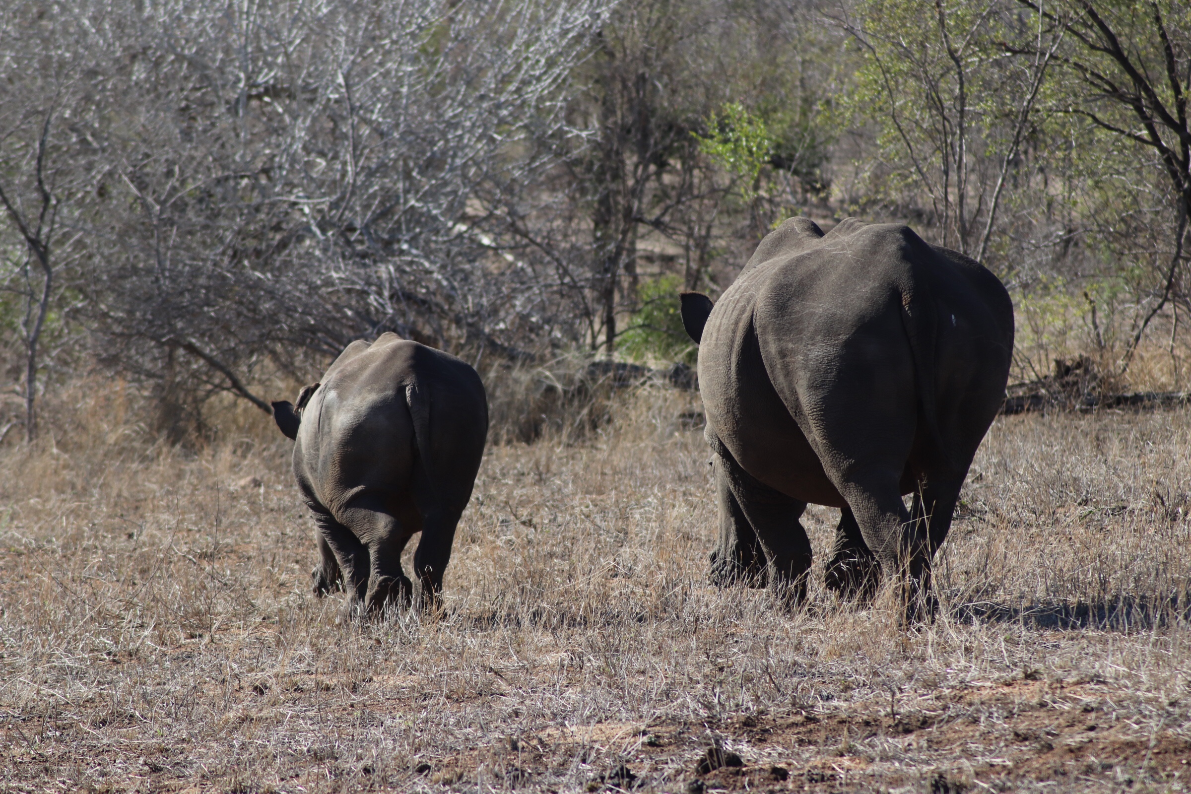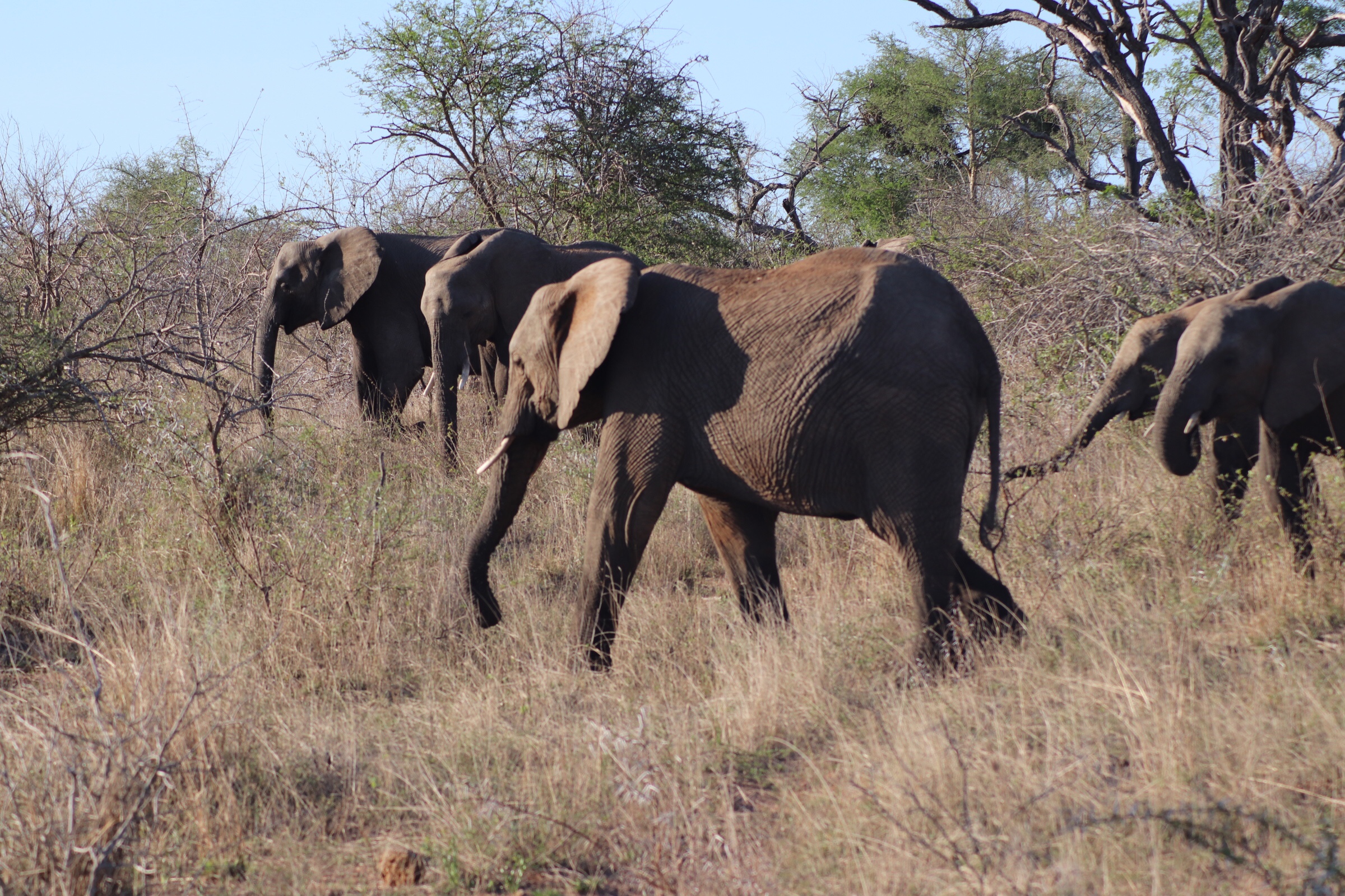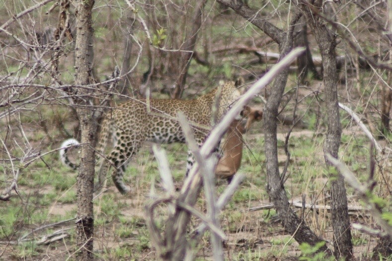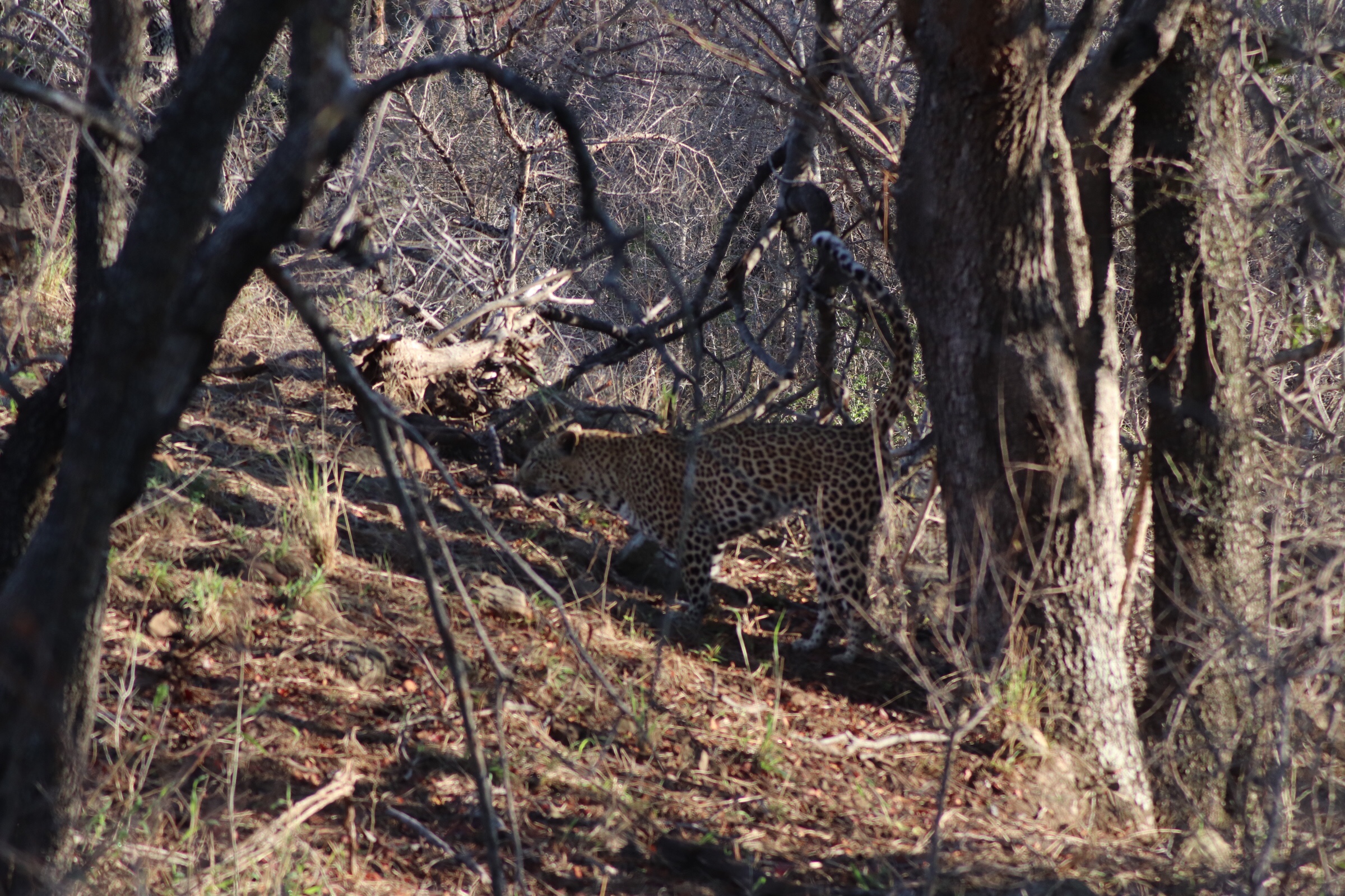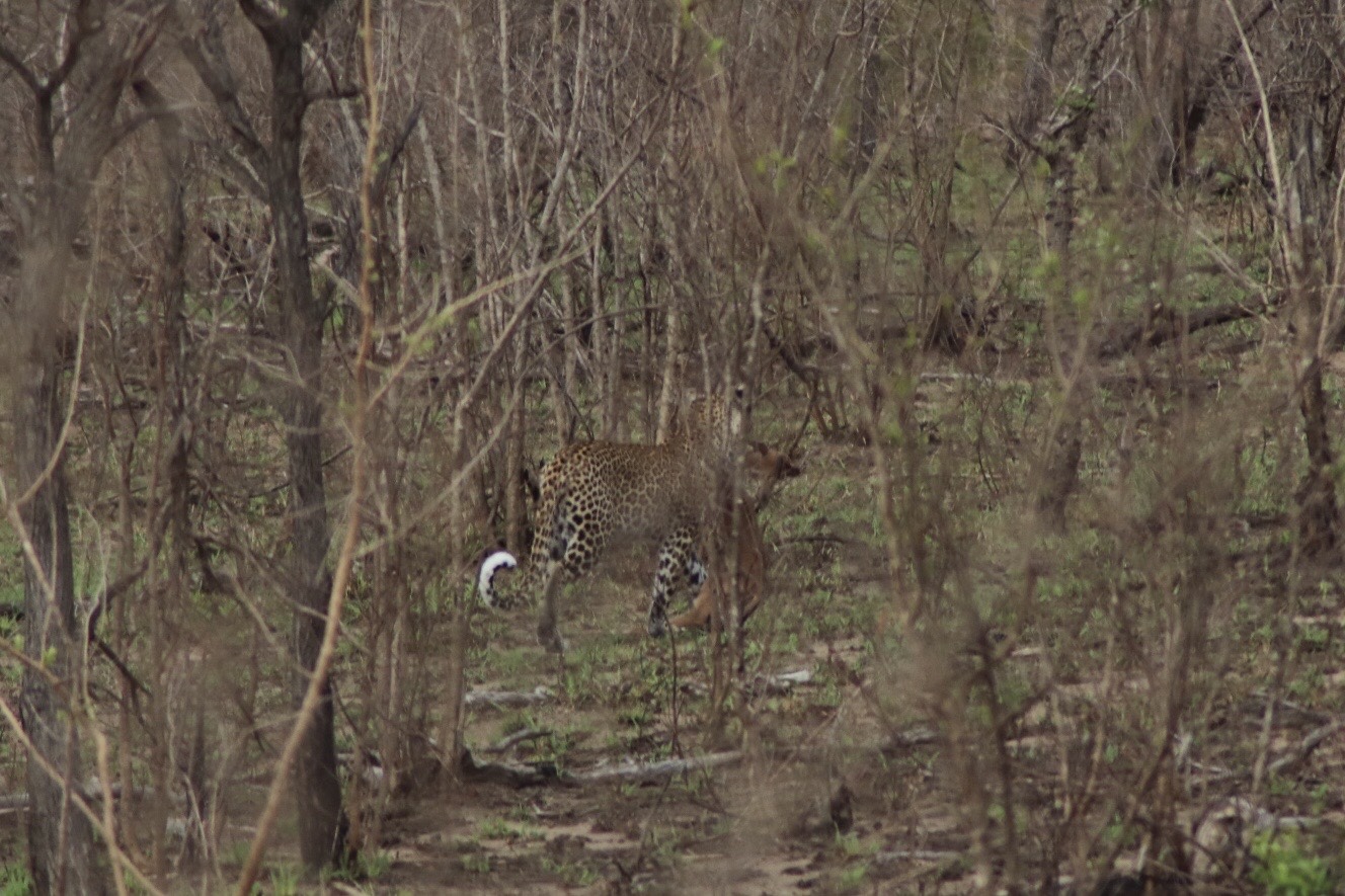 We checked in and passed through the security check and gated entrance to the park and started to make our way along the road which unlike in Sabi Sands was more of an actual road. Kruger has a mixture of tarred and dirt roads. Eyes peeled, we scanned left and right across the roads to see what we could find. Sinead was taking us out today, and we were about to make a turn when she spotted a group of cars up ahead and said, let’s just check out quickly what they are looking at. What a good thing it was that we did – a bit off the road, a leopard was walking parallel through the thick bush. We could see it with the naked eye but when you zoomed in on it you could see how beautiful of an animal it was, covered in spots and moving swiftly along. It was a male and he was marking his territory, she explained to us. With the leopard sighting last night being in very thick grass and quite far from us and only able to grab little glances of it at a time, we were especially excited to see this one this morning. We watched him in the distance for a while and tried to follow him along the road as he walked somewhat further into the bush, losing him behind rocks at times and then finding him again in the grass, until he seemed to disappear from sight. It was a great way to start the morning.