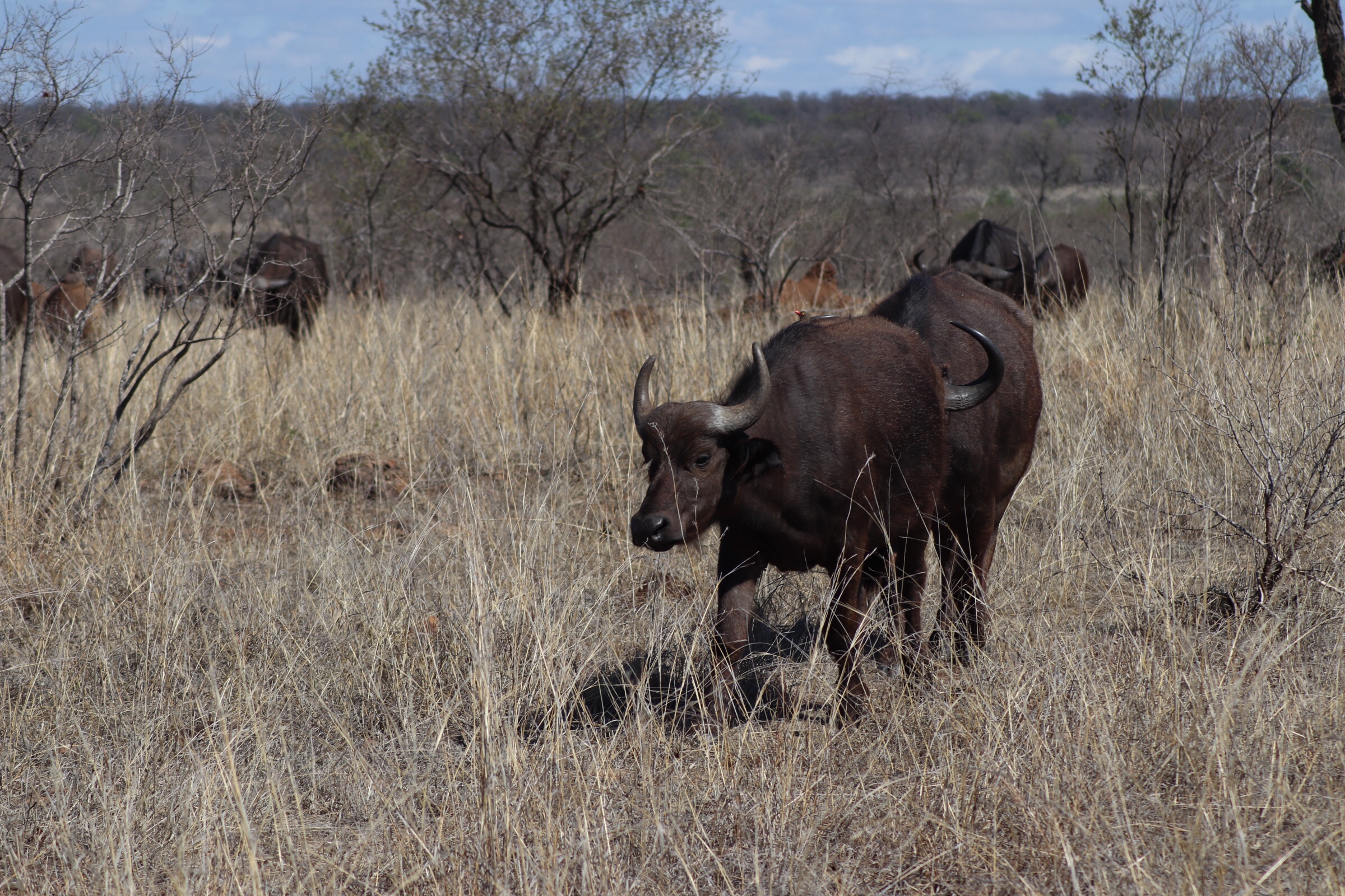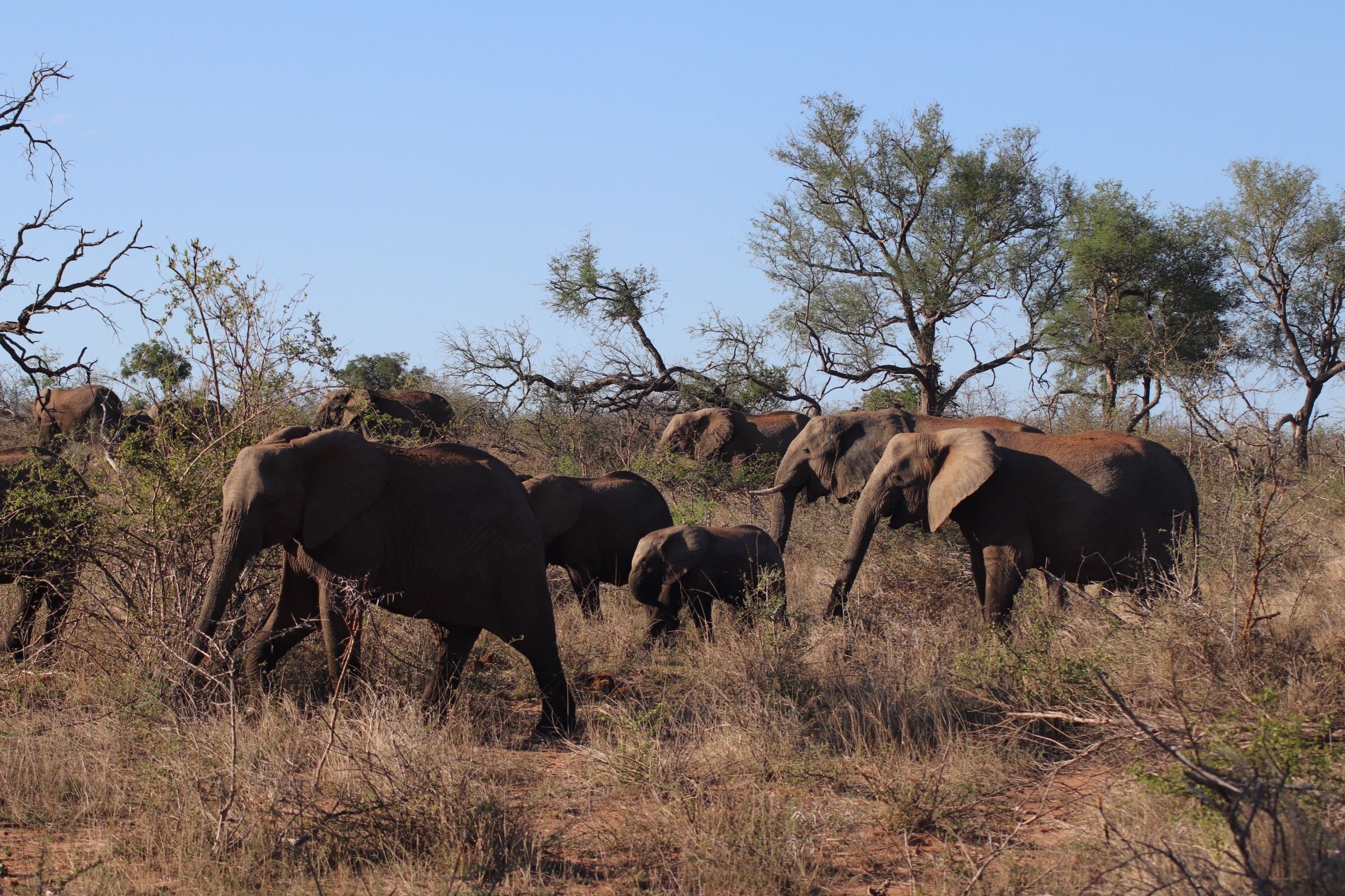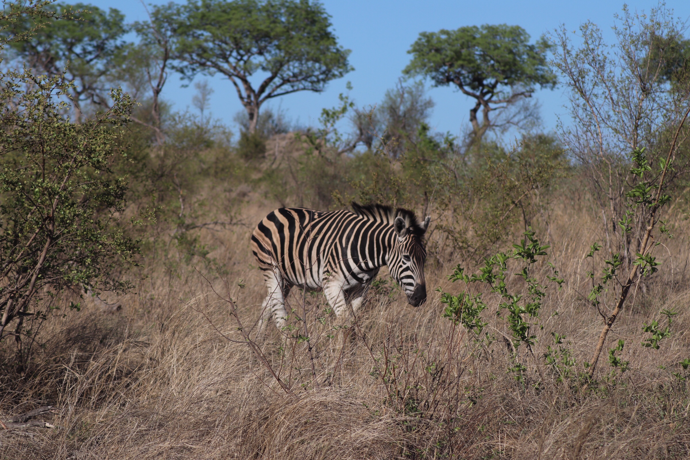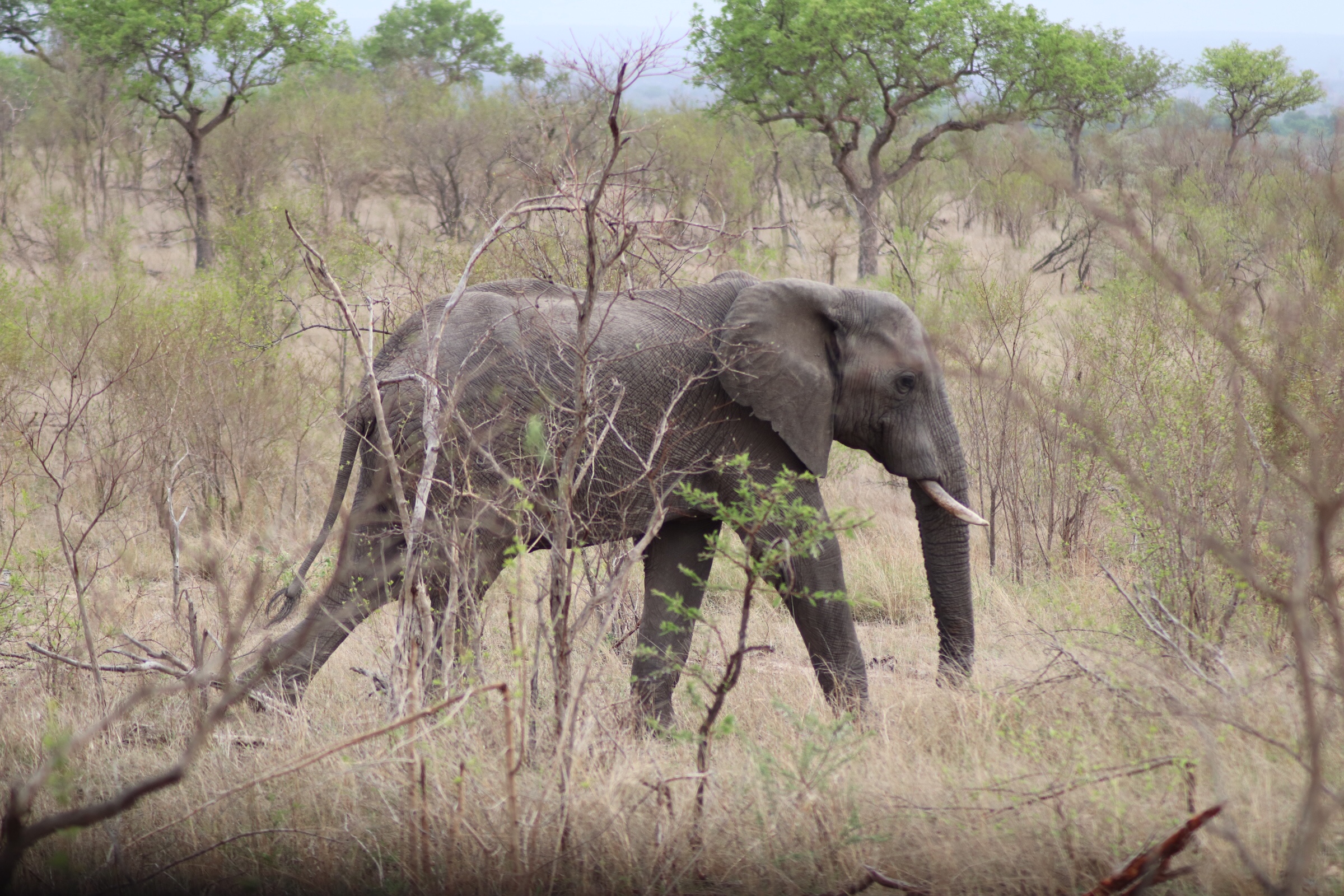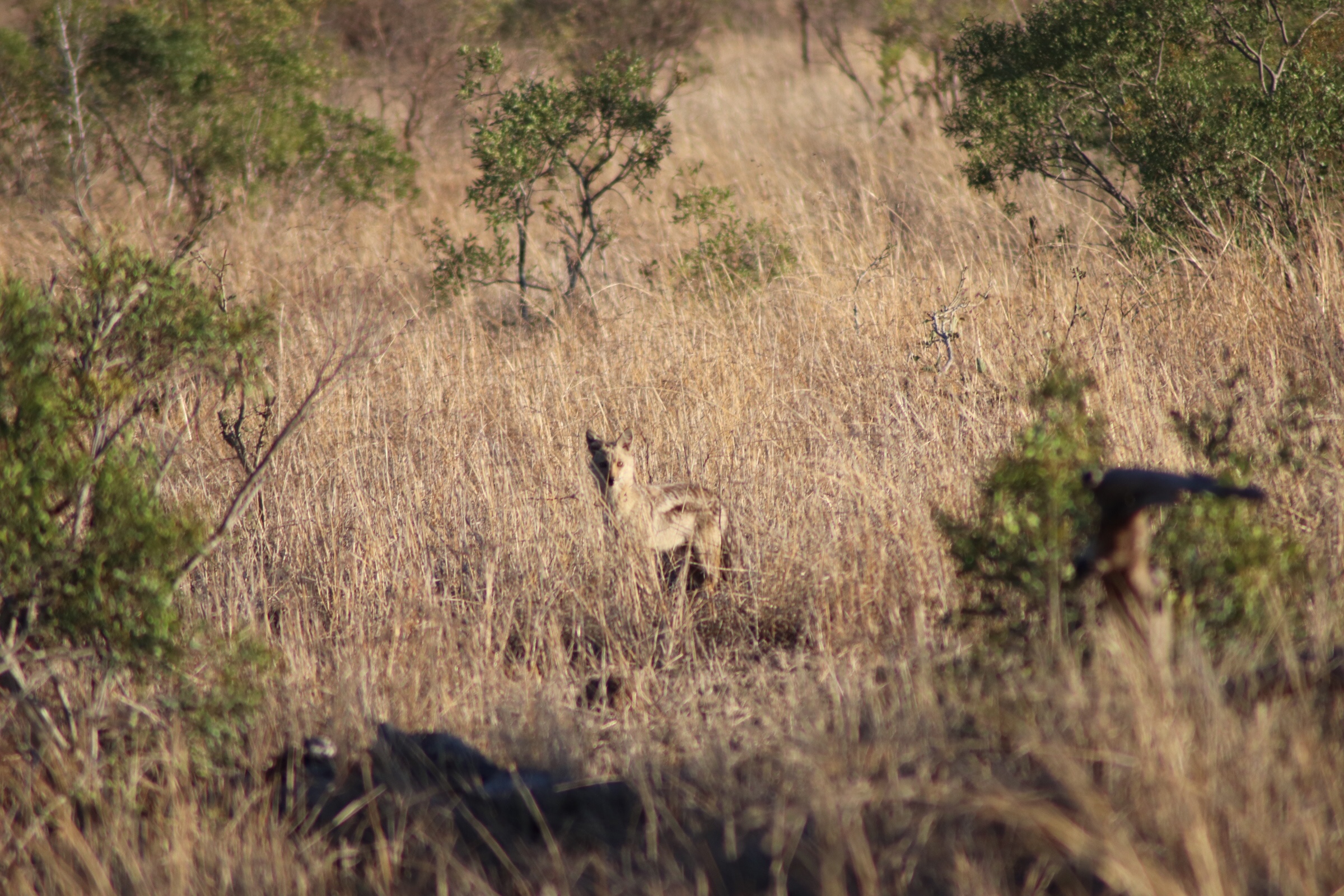We checked in and passed through the security check and gated entrance to the park and started to make our way along the road which unlike in Sabi Sands was more of an actual road. Kruger has a mixture of tarred and dirt roads. Eyes peeled, we scanned left and right across the roads to see what we could find. Sinead was taking us out today, and we were about to make a turn when she spotted a group of cars up ahead and said, let’s just check out quickly what they are looking at. What a good thing it was that we did – a bit off the road, a leopard was walking parallel through the thick bush. We could see it with the naked eye but when you zoomed in on it you could see how beautiful of an animal it was, covered in spots and moving swiftly along. It was a male and he was marking his territory, she explained to us. With the leopard sighting last night being in very thick grass and quite far from us and only able to grab little glances of it at a time, we were especially excited to see this one this morning. We watched him in the distance for a while and tried to follow him along the road as he walked somewhat further into the bush, losing him behind rocks at times and then finding him again in the grass, until he seemed to disappear from sight. It was a great way to start the morning.