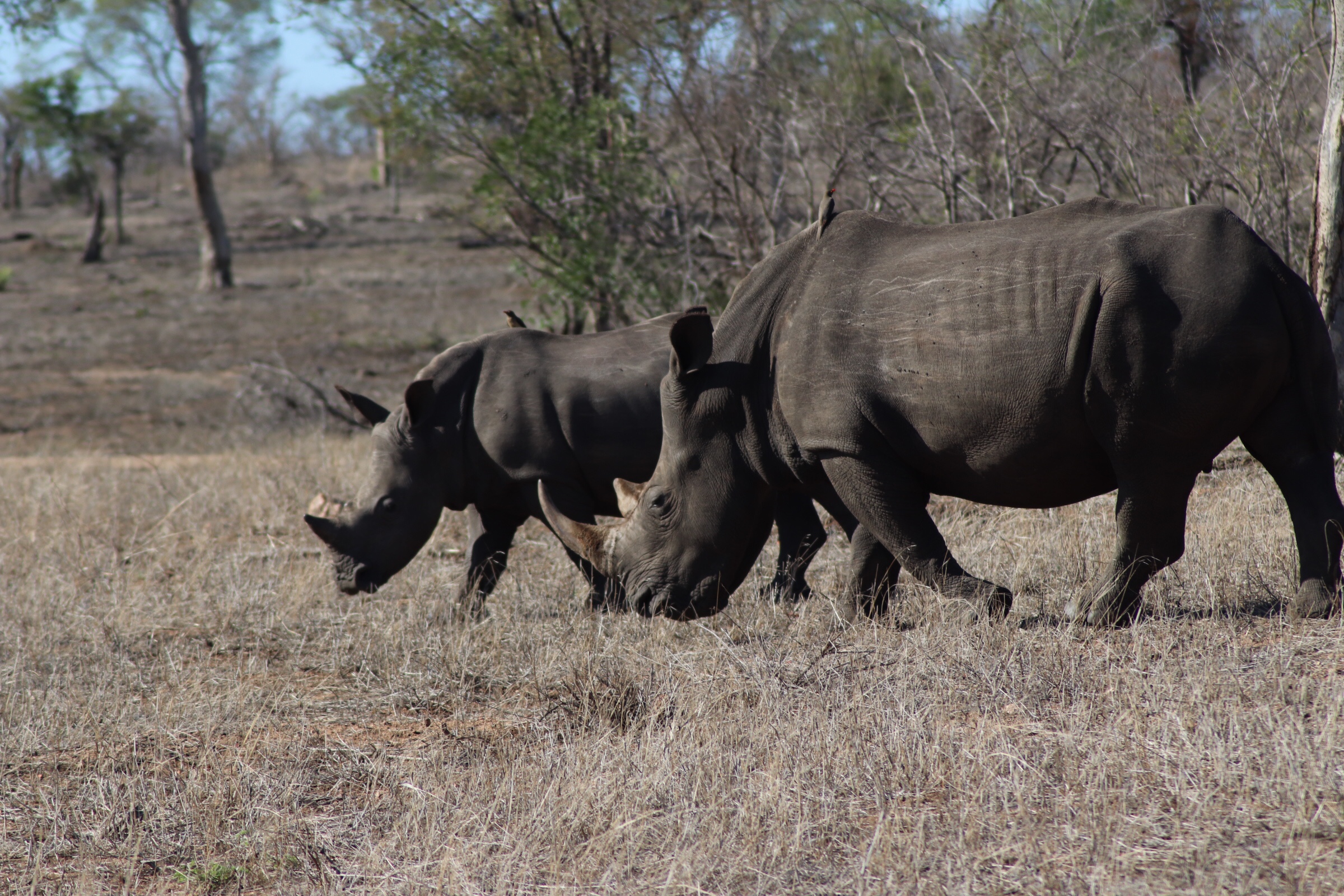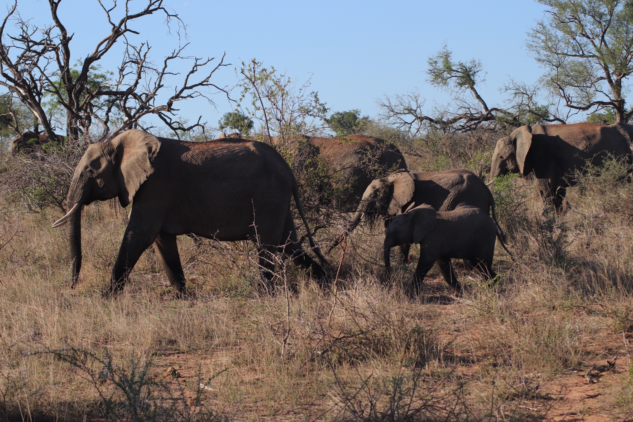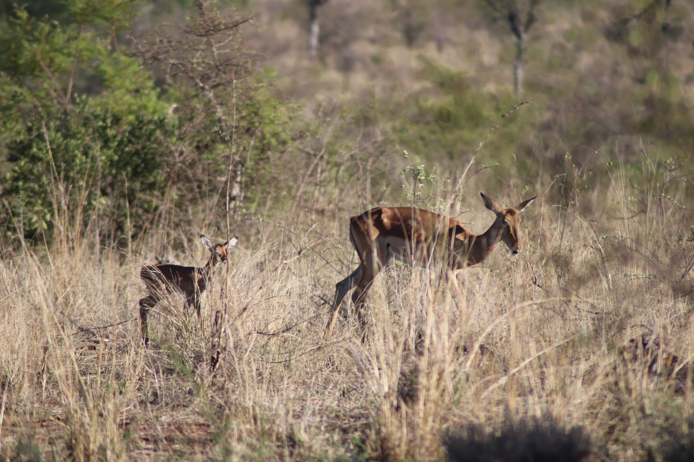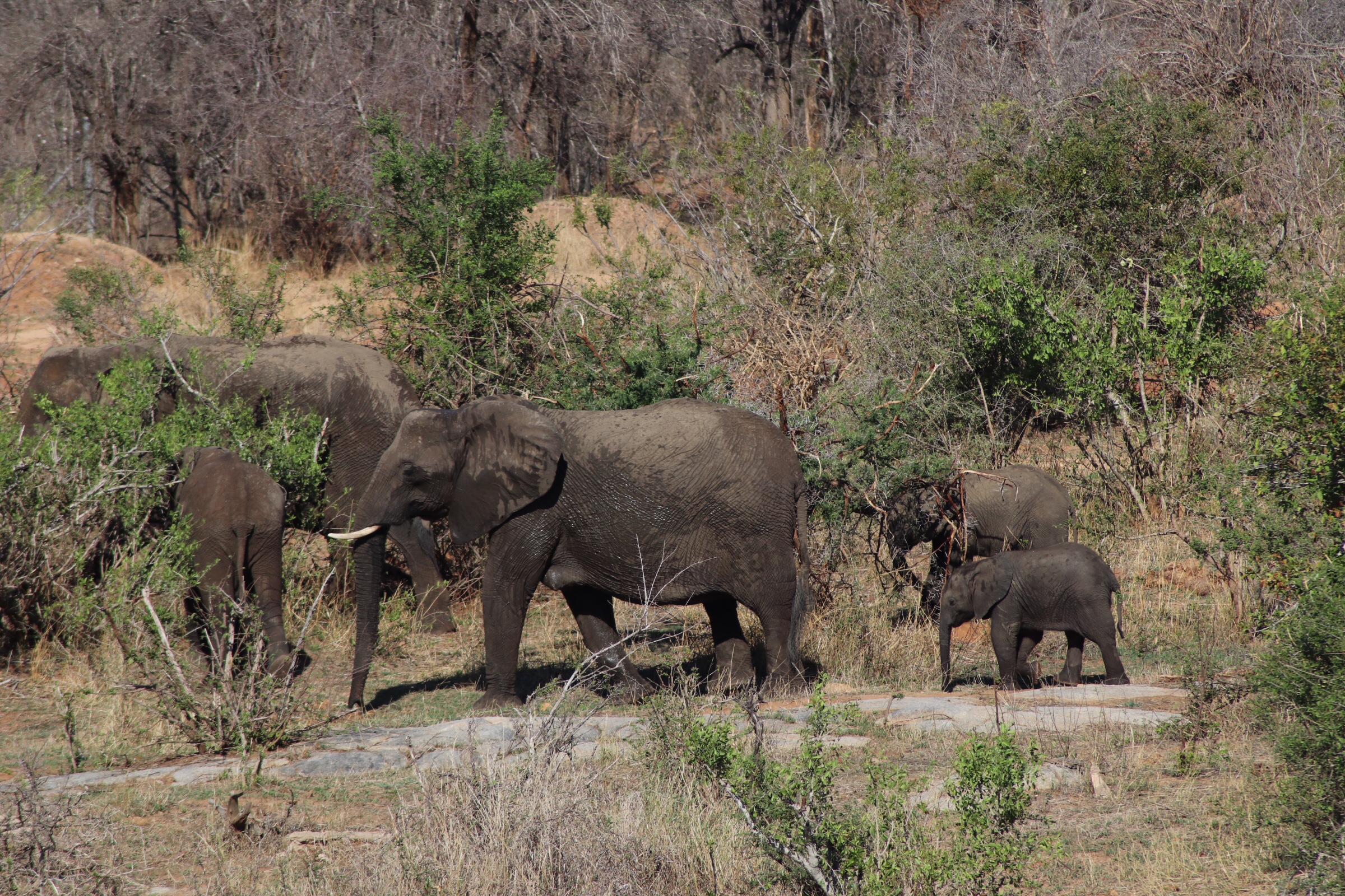 We checked in and passed through the security check and gated entrance to the park and started to make our way along the road which unlike in Sabi Sands was more of an actual road. Kruger has a mixture of tarred and dirt roads. Eyes peeled, we scanned left and right across the roads to see what we could find. Sinead was taking us out today, and we were about to make a turn when she spotted a group of cars up ahead and said, let’s just check out quickly what they are looking at. What a good thing it was that we did – a bit off the road, a leopard was walking parallel through the thick bush. We could see it with the naked eye but when you zoomed in on it you could see how beautiful of an animal it was, covered in spots and moving swiftly along. It was a male and he was marking his territory, she explained to us. With the leopard sighting last night being in very thick grass and quite far from us and only able to grab little glances of it at a time, we were especially excited to see this one this morning. We watched him in the distance for a while and tried to follow him along the road as he walked somewhat further into the bush, losing him behind rocks at times and then finding him again in the grass, until he seemed to disappear from sight. It was a great way to start the morning.