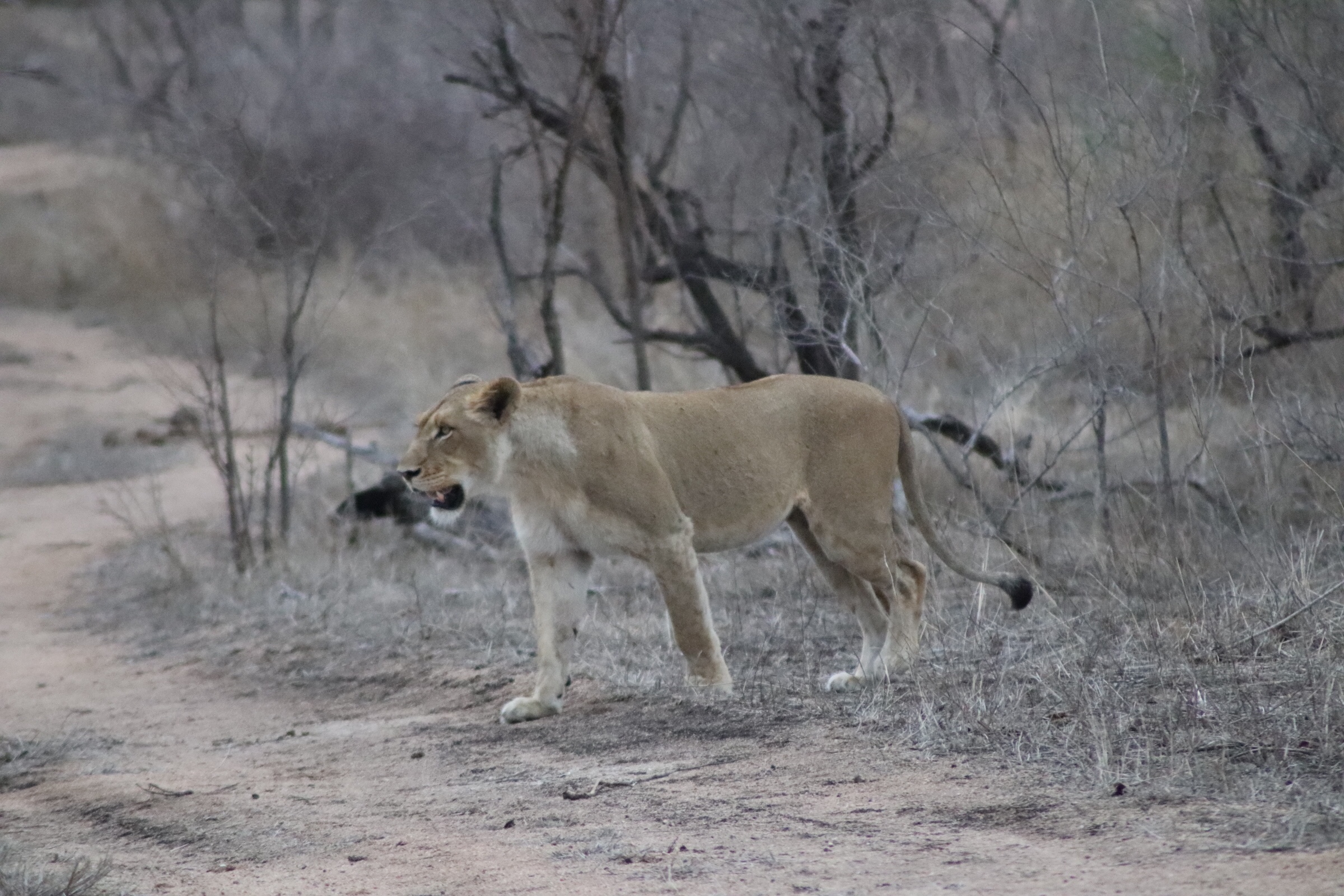 We were all in anticipation on the way back to the lodge, wondering if we would see our lion again. Unfortunately as we drove past, the carcass was gone. Either she had finished it, or dragged it behind the bushes just next to her and out of our view, or a pack of hyenas chased her away and finished it off. We still spent some time searching for her in the dusk, all of our eyes peeling through the grass hoping for another glimpse. Maybe she had moved on or she was sitting there looking back at us out of our view. We will never know. Feeling happy that we had such a good last few days, we headed back to the camp. The older French couple we had met and spent the last few days with invited us to share a bottle of wine with them and we sat chatting with them before dinner, hearing more stories of all of their retirement travels they had done and talking about the wildlife we saw. It had been a great 4 days. We had a delicious braai for dinner and headed to bed.