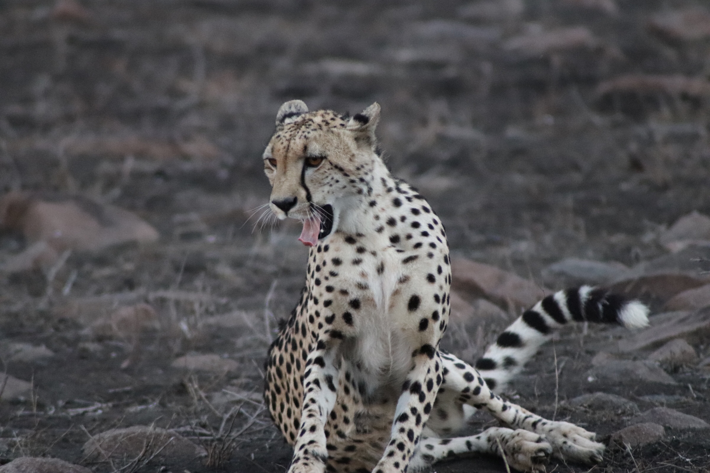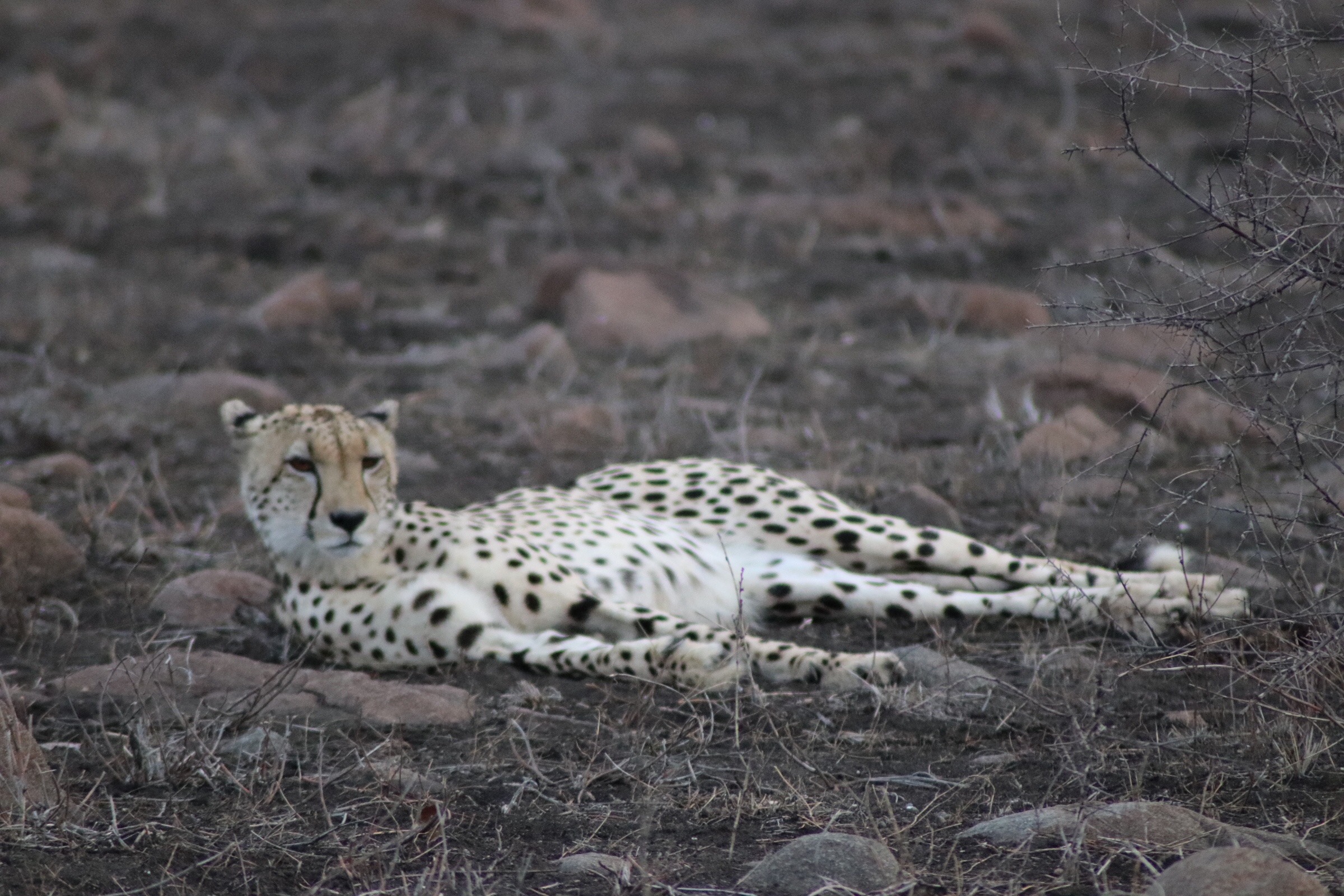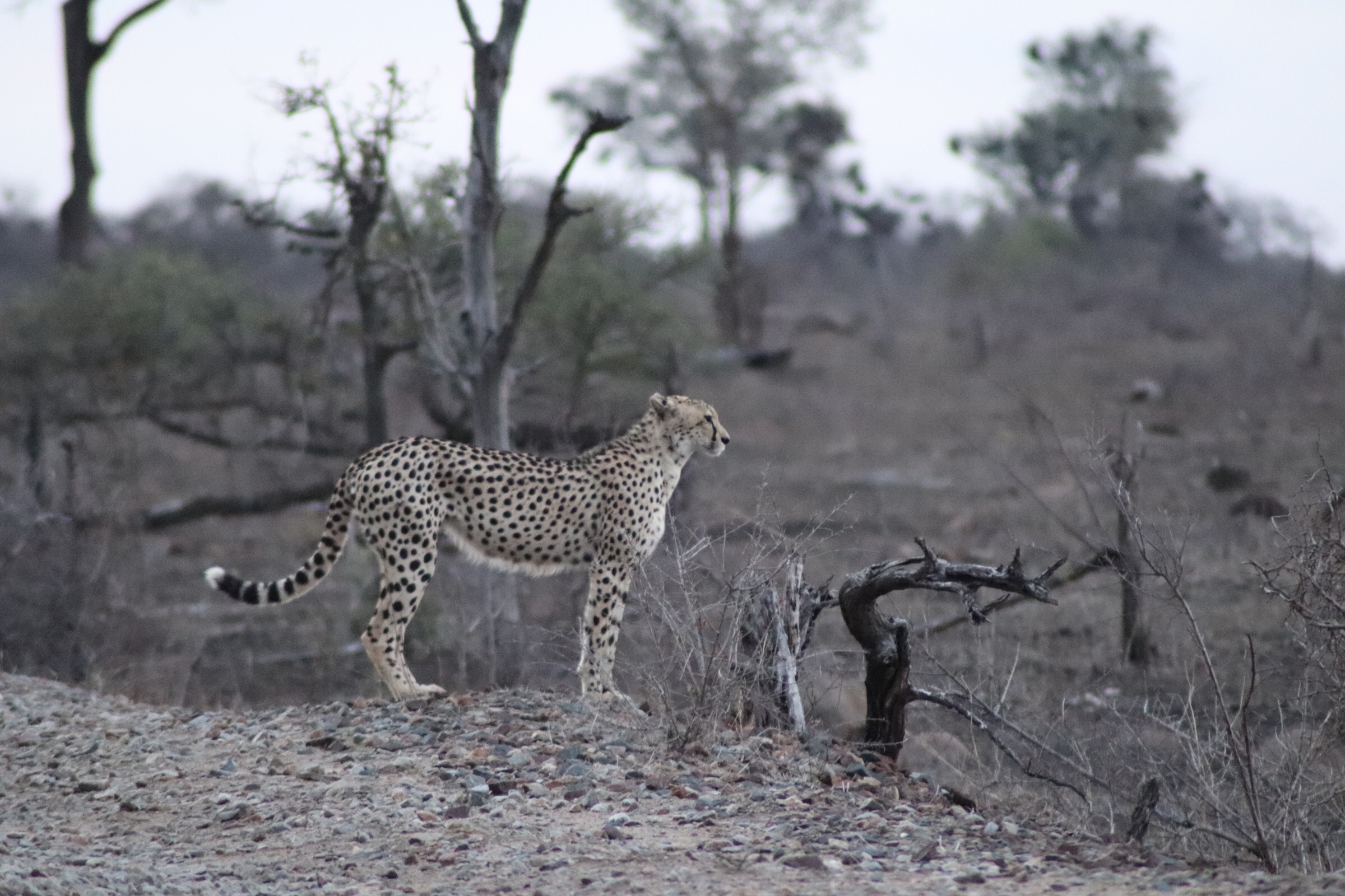 We must have watched the cheetah for nearly 30 minutes, following her and she walked a bit, and then laid back down, and then walked a bit more, and then laid back down again, But each movement was mesmerizing and we were constantly wondering what she was thinking and what she was looking around for. We decided to peel away and try and find the lion again that we had seen before. One of the other guides called in that she had stood up again. We got there just in time, to catch another glimpse of her as she wandered off the property and into the distance.