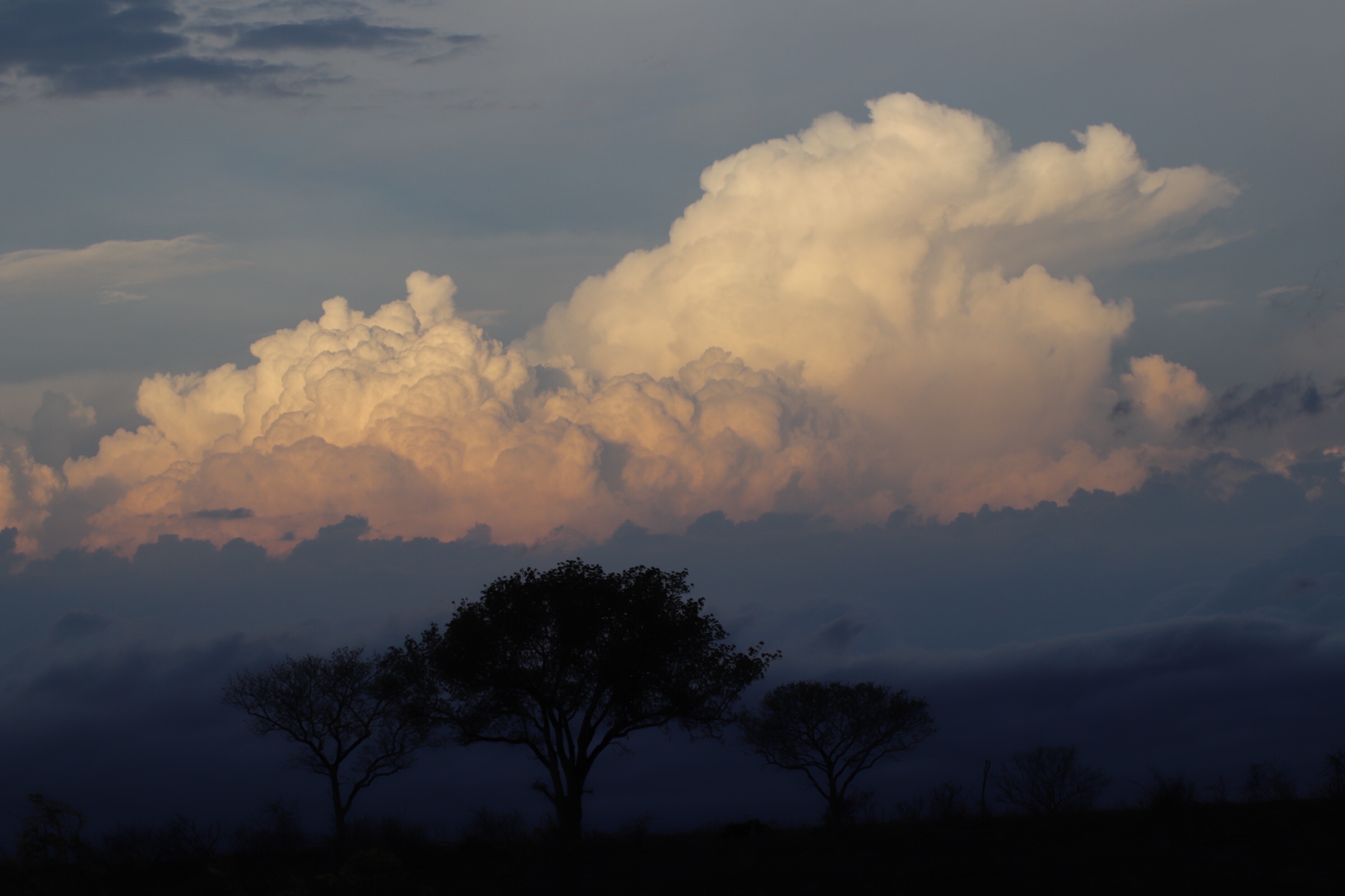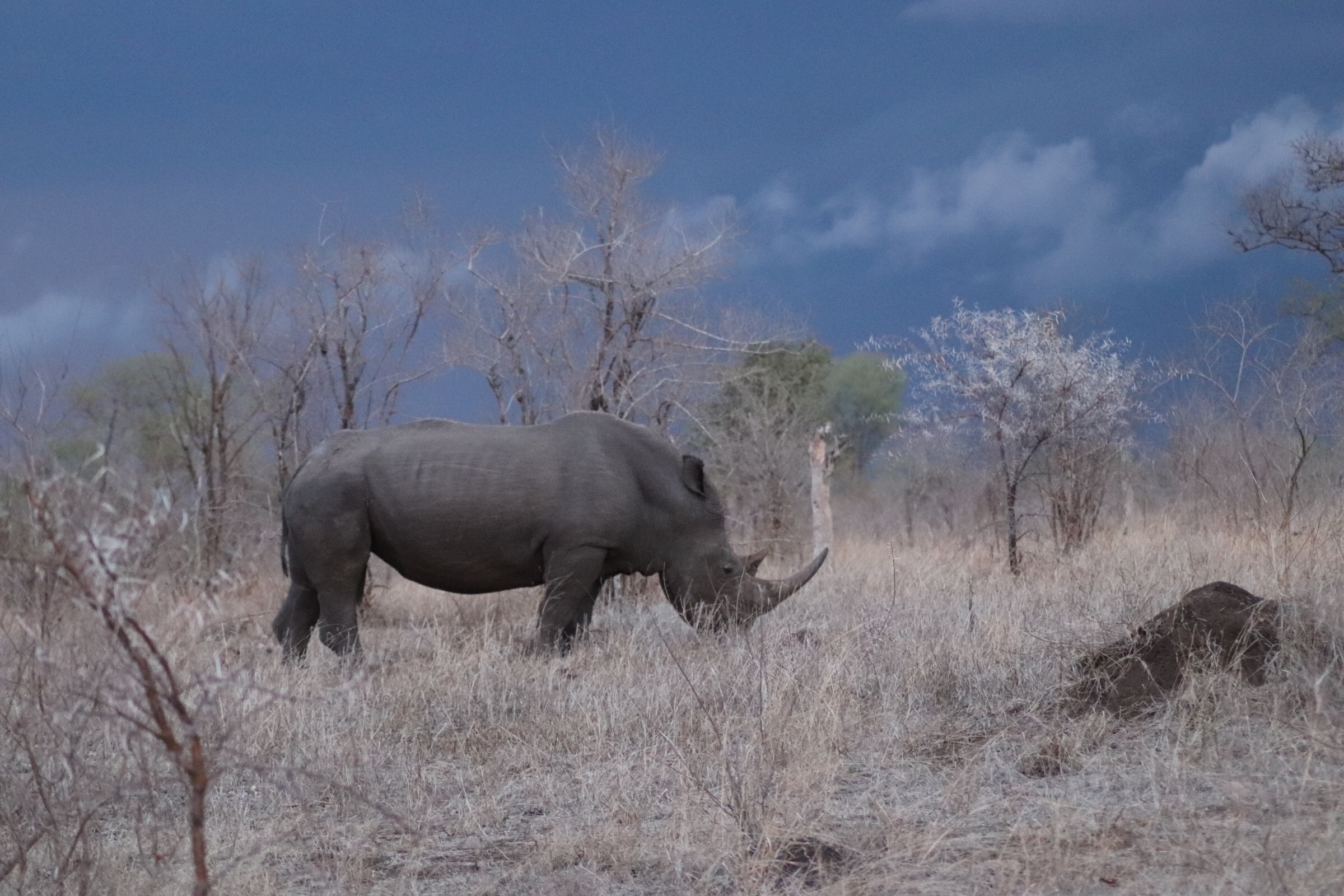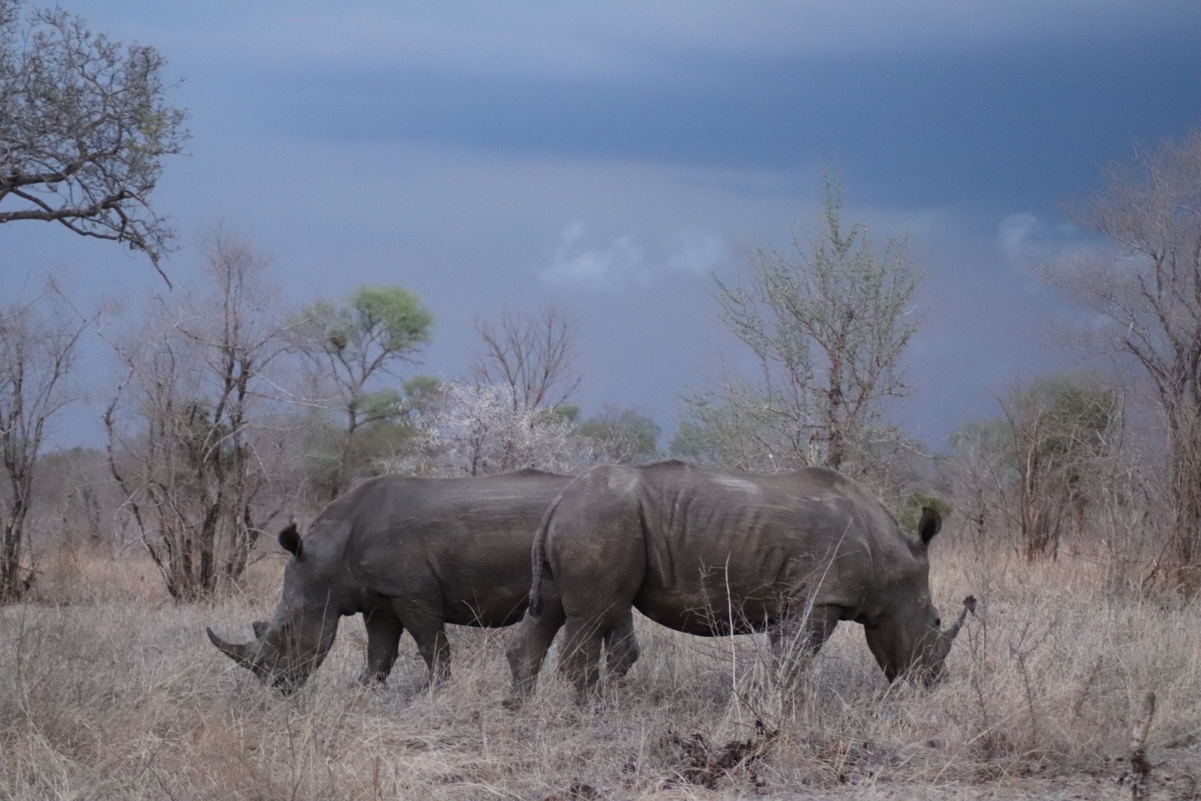 Now while all of this exciting animal viewing was happening, we couldn’t help but notice that there was some sky viewing we should also be doing as the wind was picking up, dark clouds were moving in quickly and we were seeing a lot of lightning bolts in the distance. Our guide said ‘hmmm those seem to be over our campsite right now and look to be headed this way – that can’t be good’ and we knew that we would probably have to call it quits early on our game drive today. But not before one last amazing sighting – three rhino, up close this time, looking picturesque against the green bush and dark blue sky. We watched them for a few minutes as the lightning in the distance picked up and the clouds got darker, when our guide finally said, ok I think it’s time to go before we get stuck in that.
