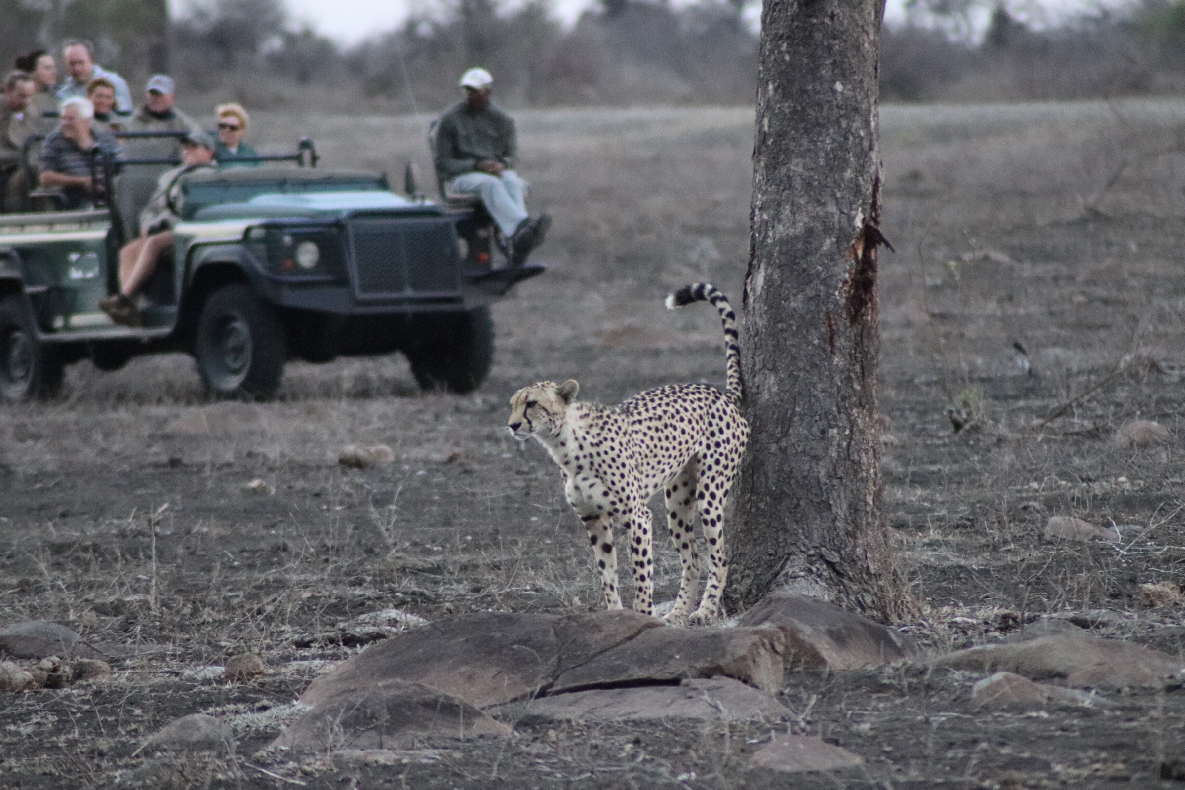 When we first arrived she was laying with legs out in front of her and her head up, looking around in all direction. They lay in a very different position than the other cats, and you could see her long, lean body and long legs and very clearly understand how they are the fastest mammal on earth. However, they can only run so fast over short distances before their body will overheat, so typically if they are chasing prey and miss, they will give up on it, sit and let their body temperatures cool, and then try again. But right now she was just lounging, looking around and enjoying the heavy breeze that was starting to pick up. We took a few more pictures over a 20 minute period of so and then we got lucky again. She finally gave us some excitement when she stood up and began walking around. We followed her in close pursuit as she gracefully moved along, scratching her back on a tree, yawning, and carefully checking out her surroundings. We couldn’t believe how close we were at times. If you look at the picture below with the other vehicle in the background it will give you an idea.