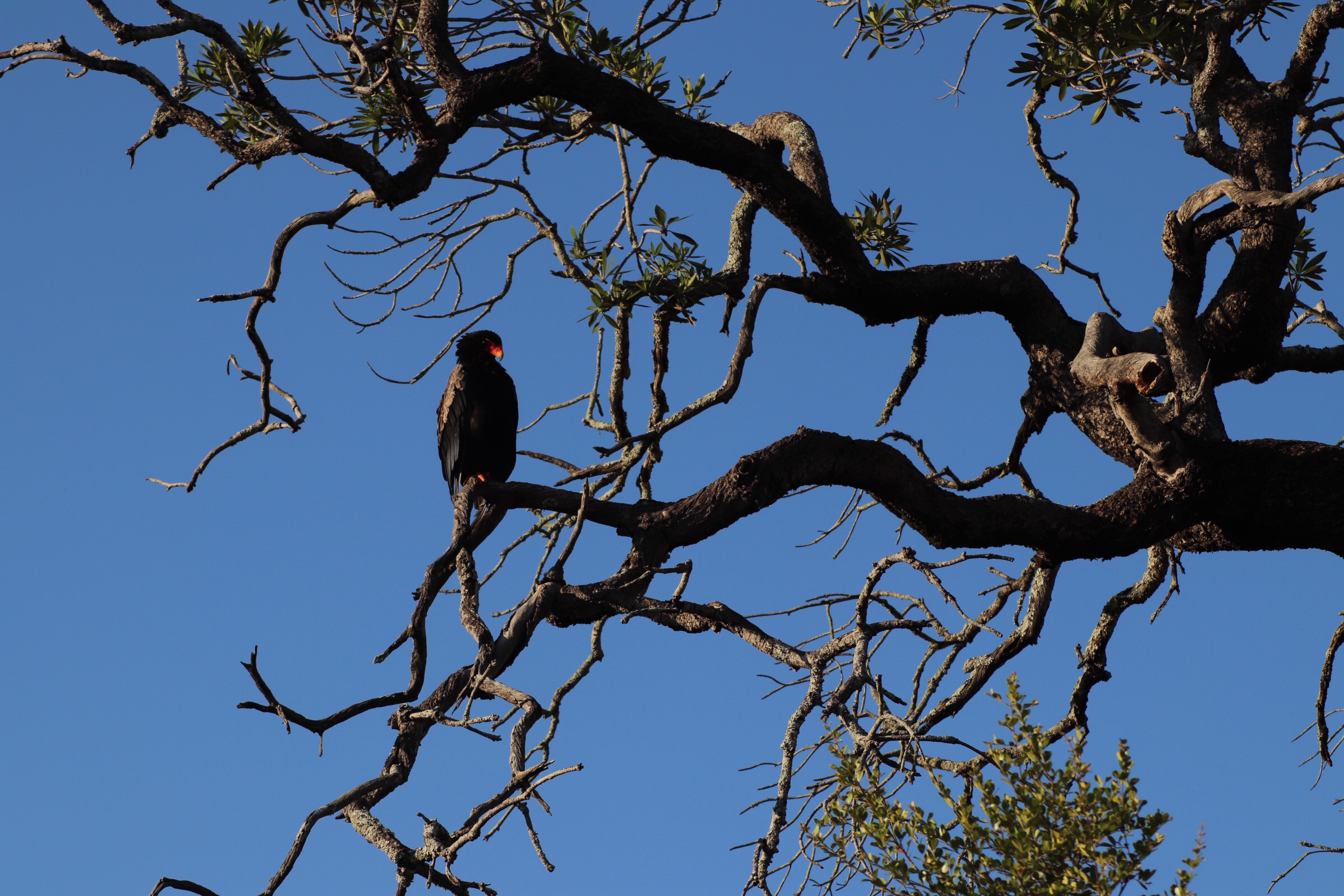 We were heading back into Sabi Sands this morning. The skies were certainly much clearer than last night and we set off as the sun was rising. The bush was very still for the first hour or so of our drive and it didn’t seem there were many animals around. Maybe the storms of the previous night kept them away but whatever it was we drove for a while without seeing much of anything on the ground other than two jackal (similar to a fox) running around, and one of the smallest antelope in the bush – the steenbok. We did see something high in the trees though as we watched an eagle resting, and would later in the morning see three more together.