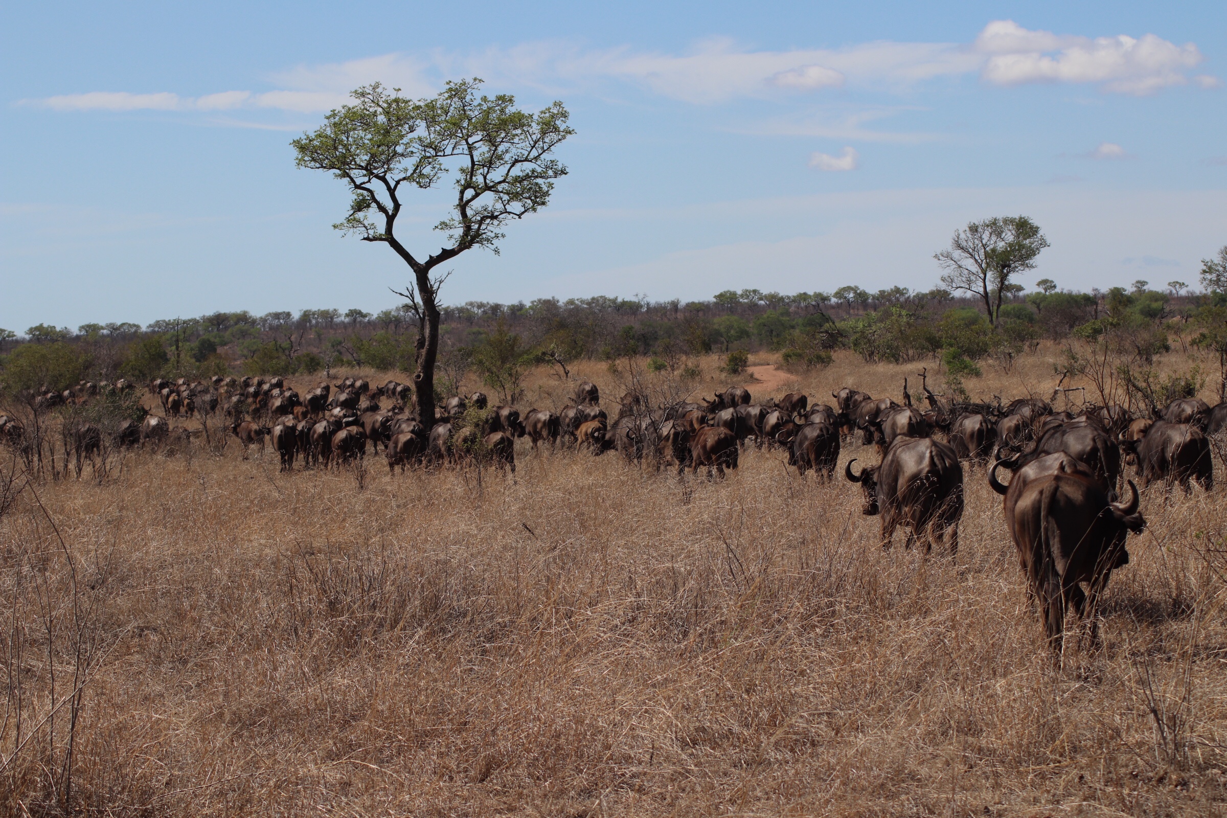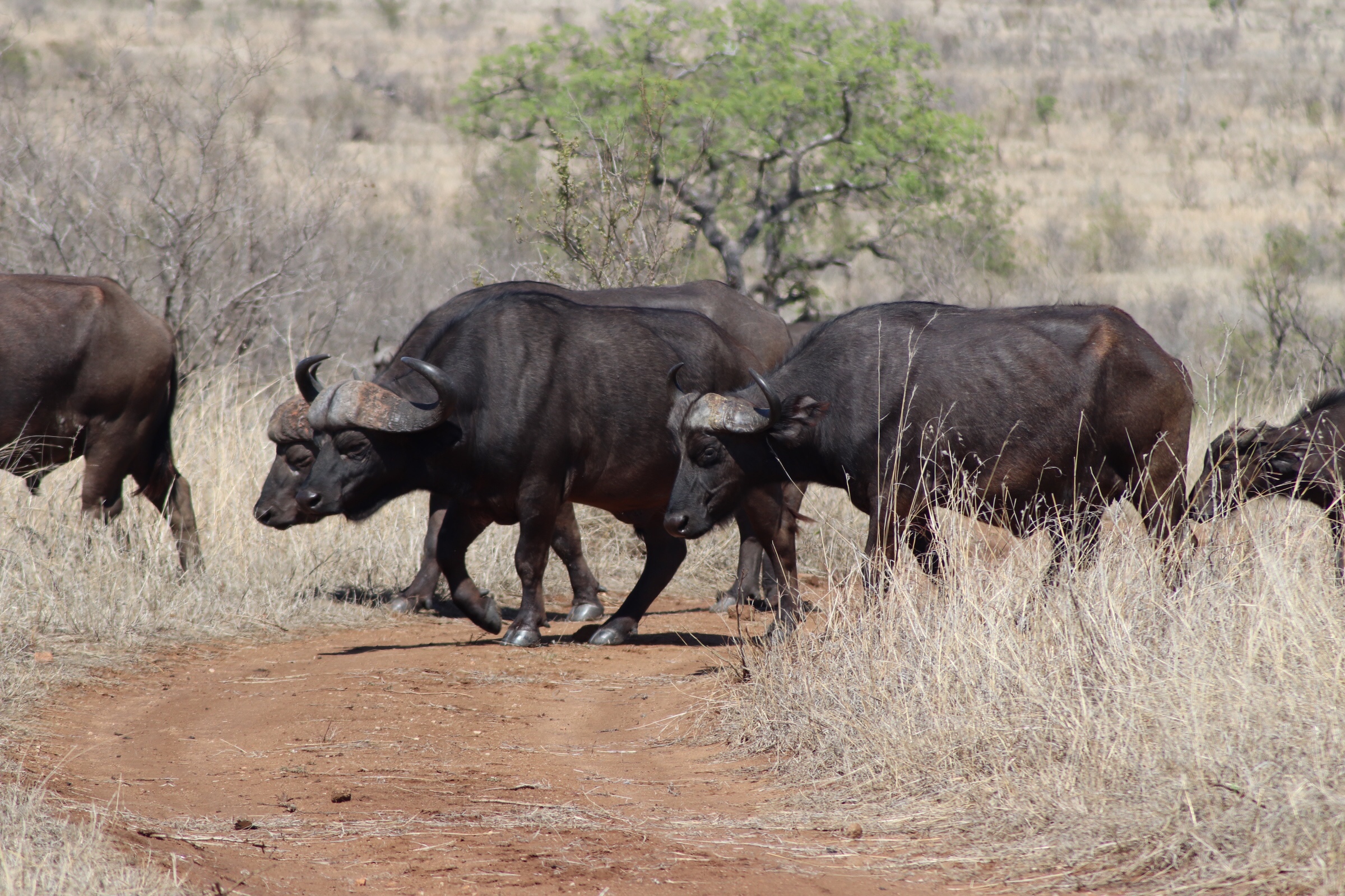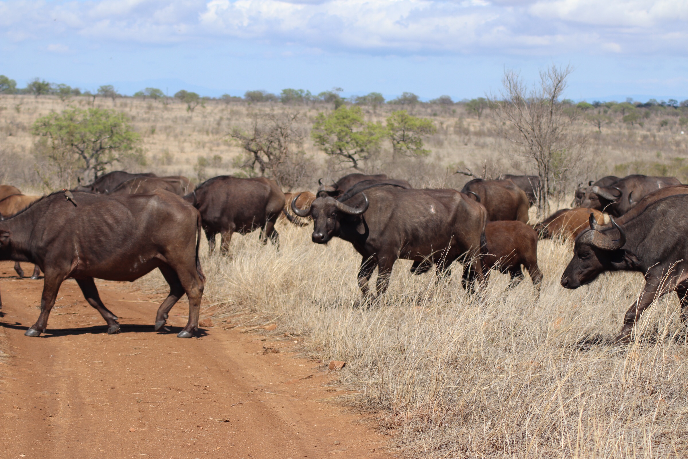 On our way back, a little disappointed that we hadn’t had as much luck today with the larger animals (at least compared to yesterday it seemed like we hadn’t), it suddenly changed as we were greeted with the most incredible sight and another big five treat – a gigantic herd of cape buffalo crossing in front of us. When we say gigantic – we mean it in terms of both the size of animal and the number of them. There had to be at least several hundred (our guide estimated 500-700) that were part of the herd passing across the path in front of us. They just kept coming up over the hill to the right of us and continuing off into the distance to the left of us. Every time we thought it was the last one coming up over the hill another would appear just a few seconds later. It had to be almost fifteen minutes that we sat there watching and letting them pass just a few feet from us and observing these incredible animals. There were males, females, and plenty of young ones (and really old ones). While males and females both have horns, the males have a much broader and tougher plate across the head than the females. They really were a sight to see. Some would stop and stare for a while at us before they passed (as we sat knowing these animals are very aggressive by nature and staring at you several feet away…). Others would wander past paying no attention. Either way, it was really incredible to see just how many there were and observe them as they moved along.
