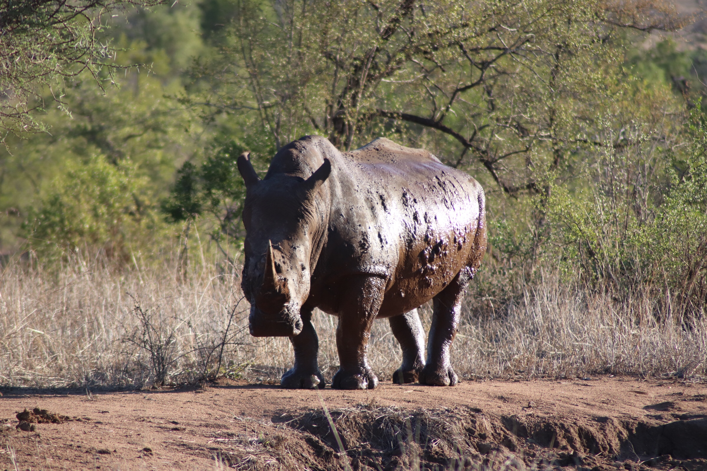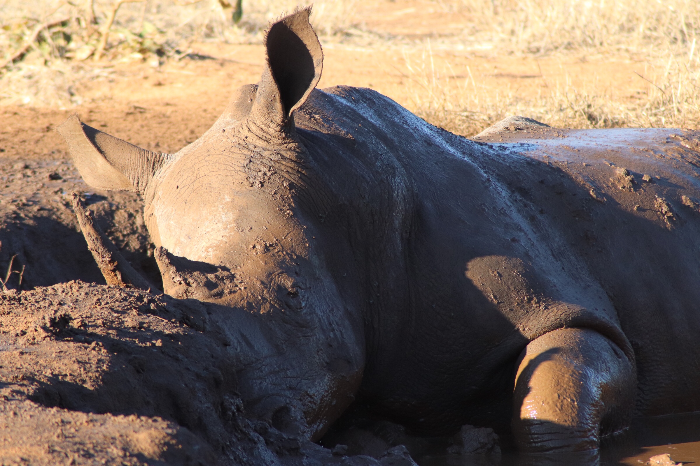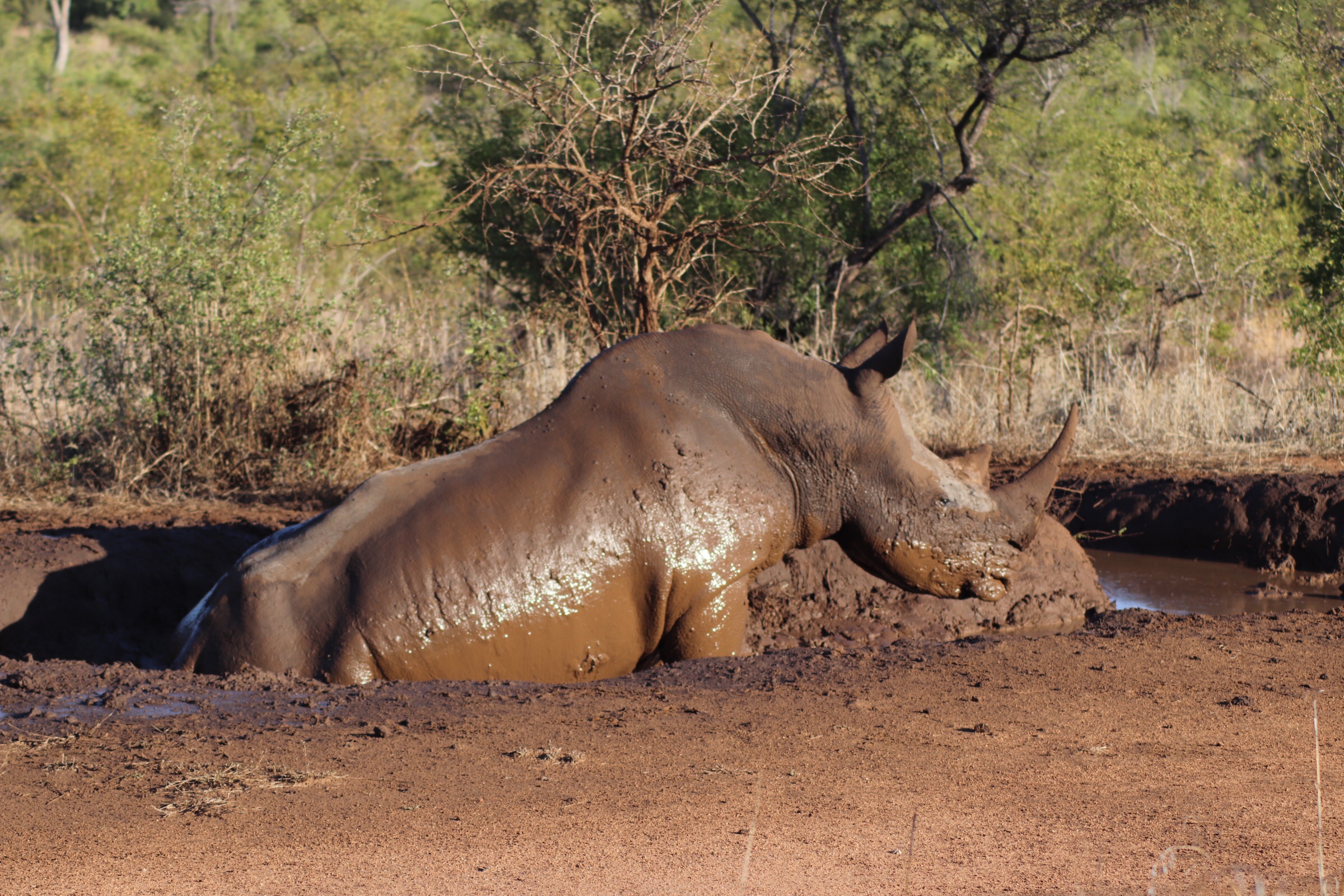 Driving along we came upon a really cool sight. Since we heavy rains the other night (and it had rained a few of the days prior as well) many of the holes along the ground were filled with water and mud. All of a sudden we came upon a large male rhino, lounging and sleeping in the mud. He was laying there both to cool down but also to coat himself, because it would cement in all of the ticks and parasites on his back which he could then rub off of him when the mud dried. We watched for a while from just a few feet away as he lay there, barely moving more than his ears and opening and closing his eyes. Totally relaxed and having the snooze of his life. Soon however he decided it was time to move and he stood up so we could see how big he really was. Sitting in a hole of mud it was deceiving – but this was a big, big rhino! We watched as he took slow movements up first on two legs, then the other two, then slowly coming out of the hole and walking just feet in front of our car. It was really special to watch especially because, tragically, the rhino population is slowly declining and is estimated to become extinct in the next 15-20 years. It’s sad to think that these creatures which are so peaceful to watch (mostly – one did charge a bit at a safari car the other day…) are being eradicated by poaching. They estimate there are around 5000 left in Kruger Park – which is home to 2/3 of the rhino in Africa. We sat and watched a while longer thinking about how it might be our last chance to see one in the wild.
