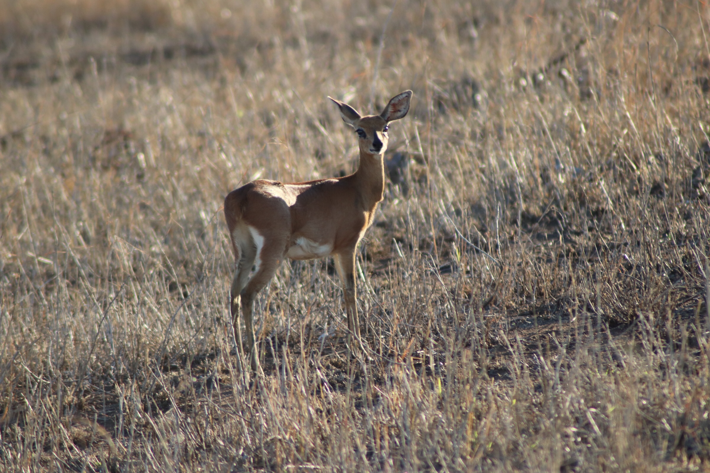 Back on the intended route we continued along, passing newborn impala and watching them try to learn how to walk on their infant legs. We once again saw the smallest antelope in the bush – the steenbok – this time both a male and a female. In this species the male is smaller than the female. We watched for a bit as these mini antelope courted one another. We watched beautiful birds in the trees and saw tall giraffe moving slowly along our route. We also passed two of the ‘ugly five’ – wildebeest and the vulture (the others being hyena, warthog, and one other type of bird).