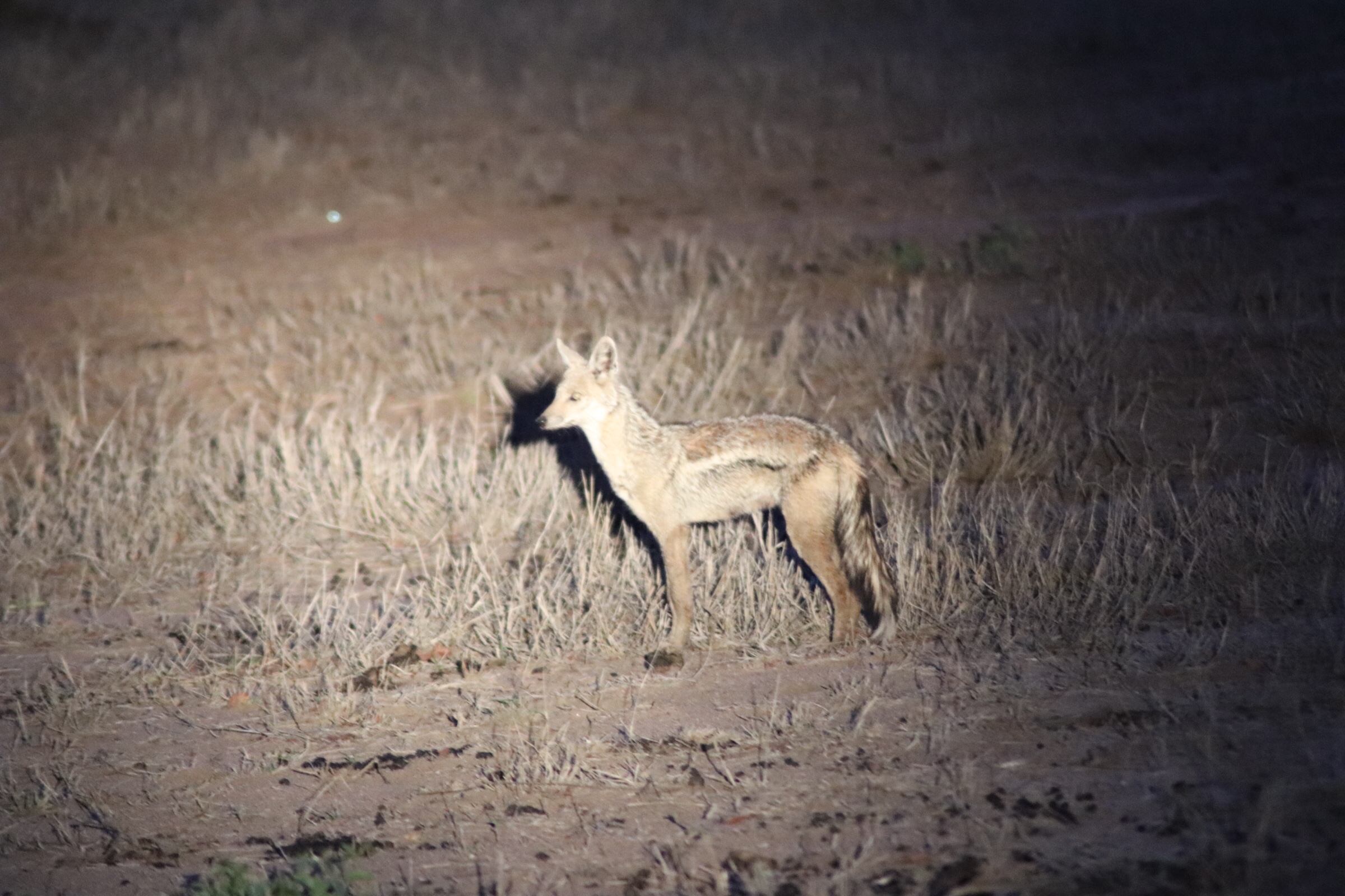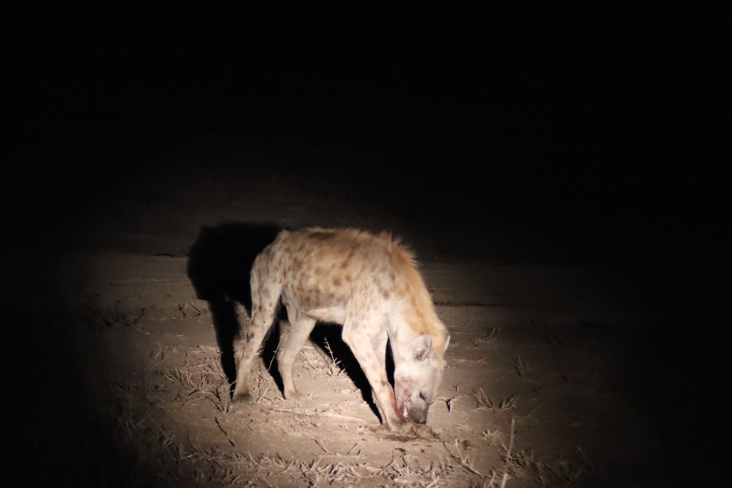 We made a quick check on the leopard after our sundowner stop but he was still lounging in the tall grass below his kill and barely in sight. Since the skies were dark we decided to move on and start the night portion of our drive, with our guides shining the spot light around hoping to catch a glimpse of some night animals. We saw hyena and jackal in our spot light (the hyena was very close to the leopard kill – hoping to catch a falling bite) and saw the eyes of many creatures in the bushes surrounding.