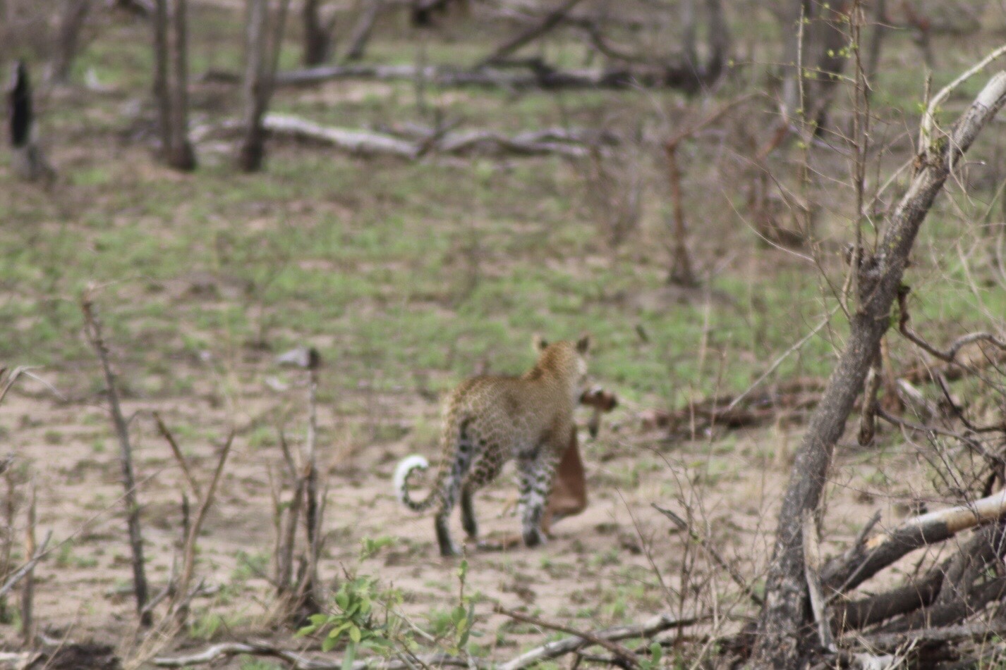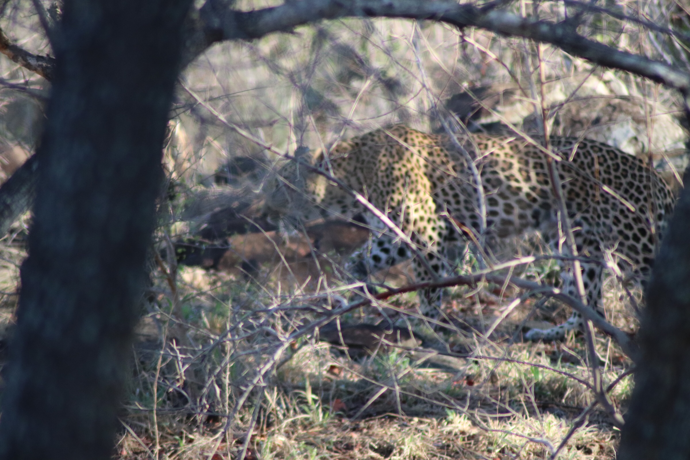 With that we headed back to the lodge. Just after turning off the main road and onto the dirt roads leading to our camp we came across a half eaten animal carcass just past the fence on the side of the road. We knew that it had to mean one thing – there was a predator in the area and he or she would be back for its kill at some point. Maybe it was even sleeping in the bushes next to it. We spent some time closely scanning the area but saw nothing and with the fence along the road couldn’t advance further.