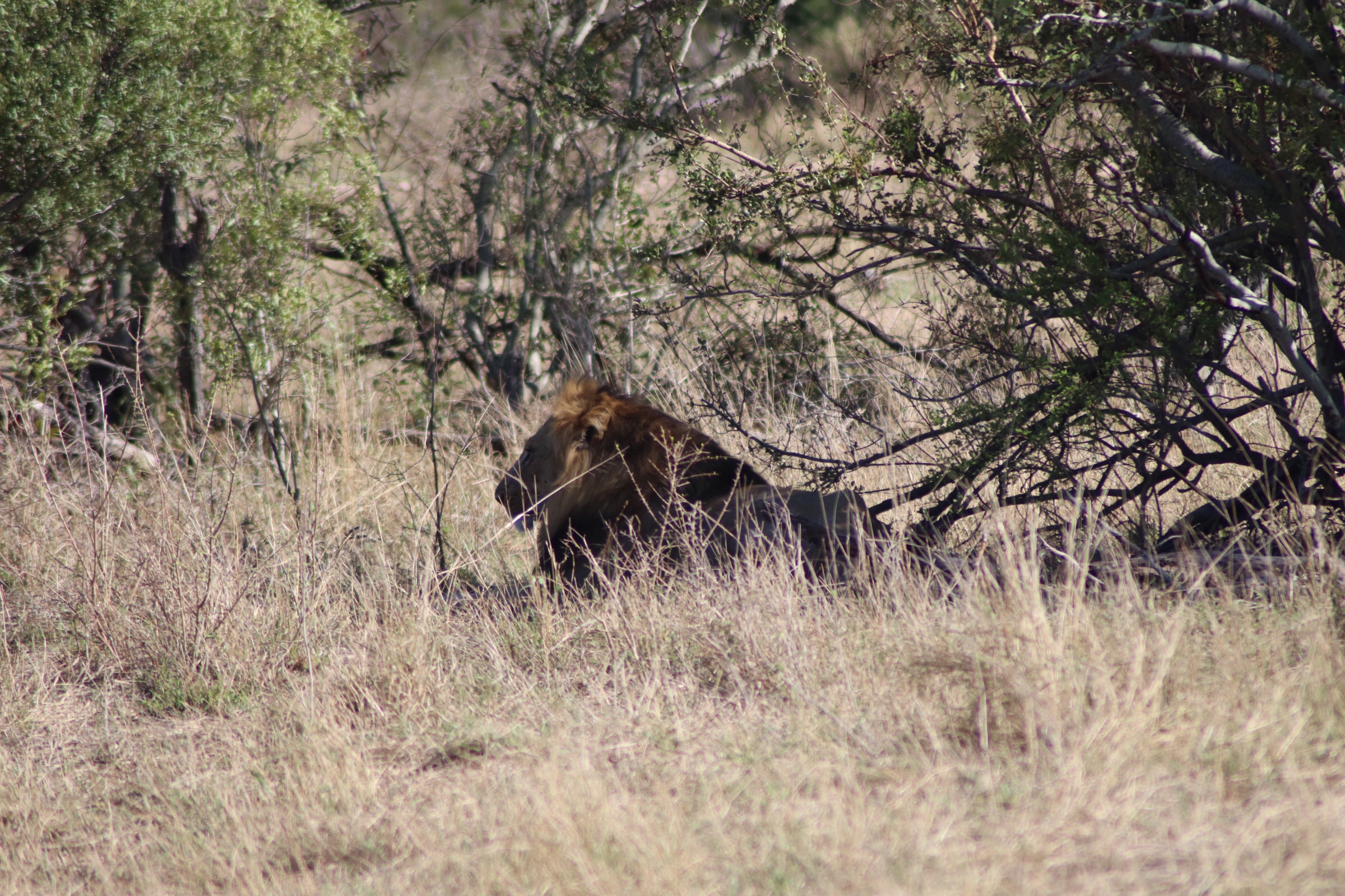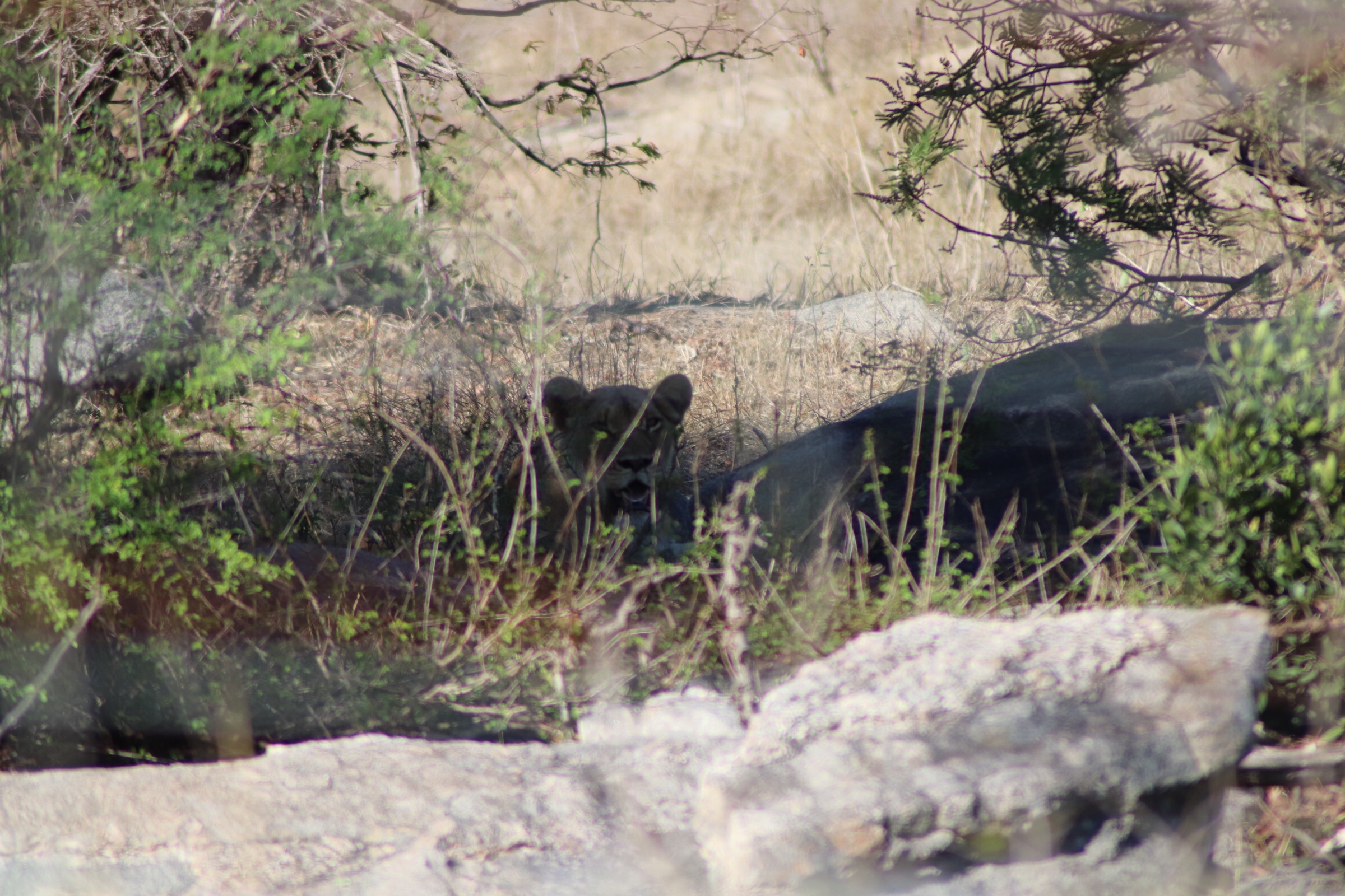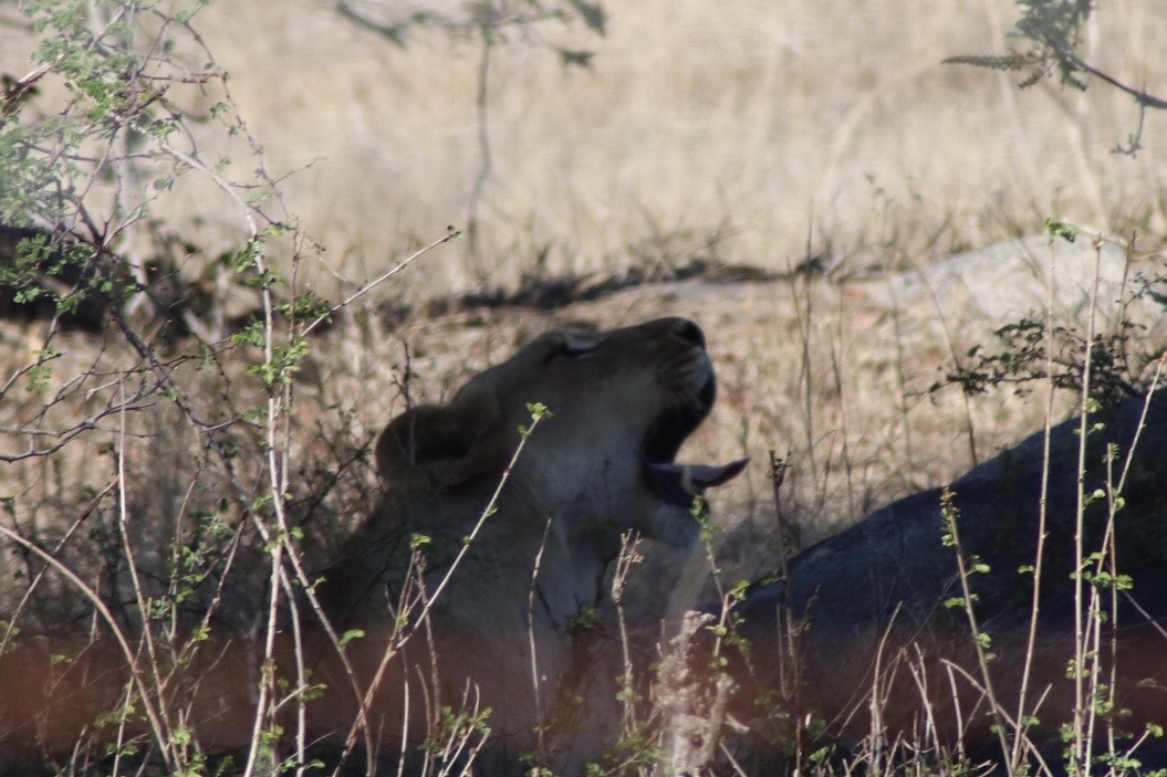 After lunch it was back to Kruger, but first we would make a stop at the kill we had seen on the way and hope we would find something more there. We pulled up to the spot and there it still was – the lovely dead something. Everyone’s eyes were on the tall grass and looking through the rocks to see what we could find. We knew there had to be something close. Seonaid maneuvered the car into a few different positions so we could have a look from different angles and pulling forward she cried out ‘I see ears!’ We all looked closely and you could see it was a lion, the ears nearly blended into the grass, when she suddenly raised her head looking straight at us. Another lion spotting, and a female this time. We had to look closely to find her and we couldn’t see much more than her head rising above the grass but she was there and staring back at us. We watched her for a while as she yawned a few times and looked around at us. At one point she even moved and we got a good look at her before collapsing behind the brush and out of our view. We took the best pictures we could through the fence before moving on.