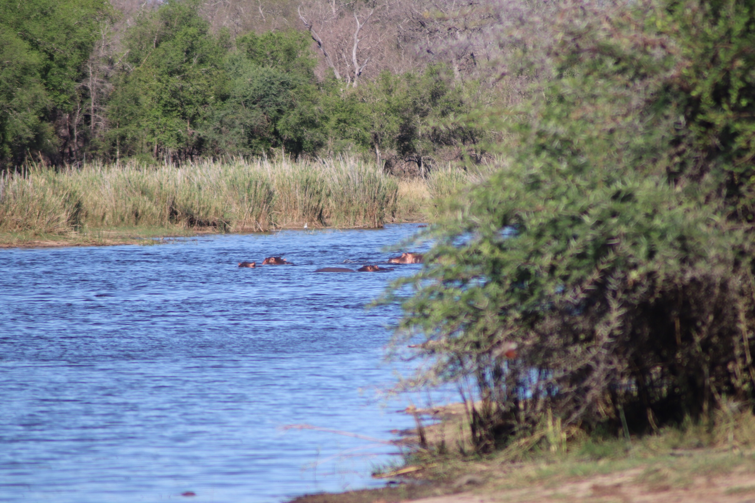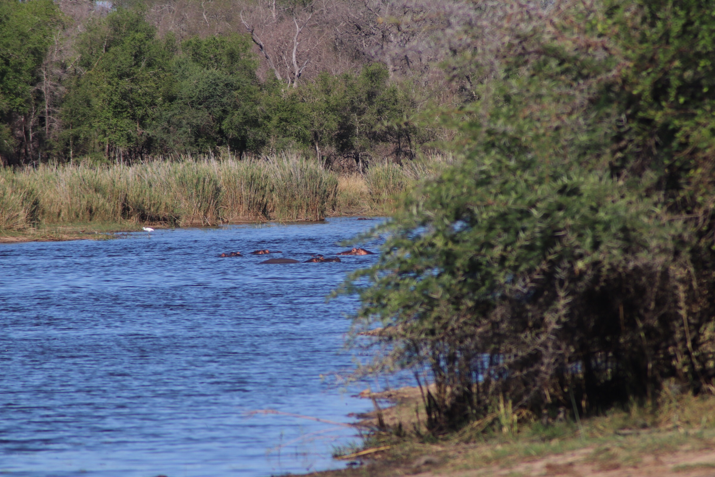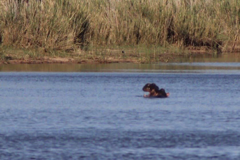 After resting and lunch we headed out at 3:00 with Drikus this time, a bit earlier this time since Kruger closes earlier and we had to be sure to have enough time for a good game drive. The drive started slow and you could sense some frustration with Drikus. Maybe some animals were still having their afternoon nap or perhaps the extra water from the storms had something to do with the inactivity. After we continued for a while without coming across much more than antelope, we stopped at a viewing blind along a lake to see if anything was around the water. We sat for a while, watching lots of birds, and then noticing off in the way way way distance (so far you could barely see it through the camera zoom) little pink/brownish heads bobbing in and out of the water. From a distance it almost looked like rocks (and there was one right next to them that made it difficult to differentiate) but you could see them coming to the surface and going back under, never more than a few inches above the water. We had our first hippo sighting! We sat patiently for a while, hoping they would make their way across the lake closer to us, or emerge from the water so we could see more than just the tip of their snout or ears, but it seemed they only wanted to stay in that one spot, barely bobbing in and out of the water. We left the lake, hoping we would get a closer look at some other hippos traveling along the road that was next to the river.