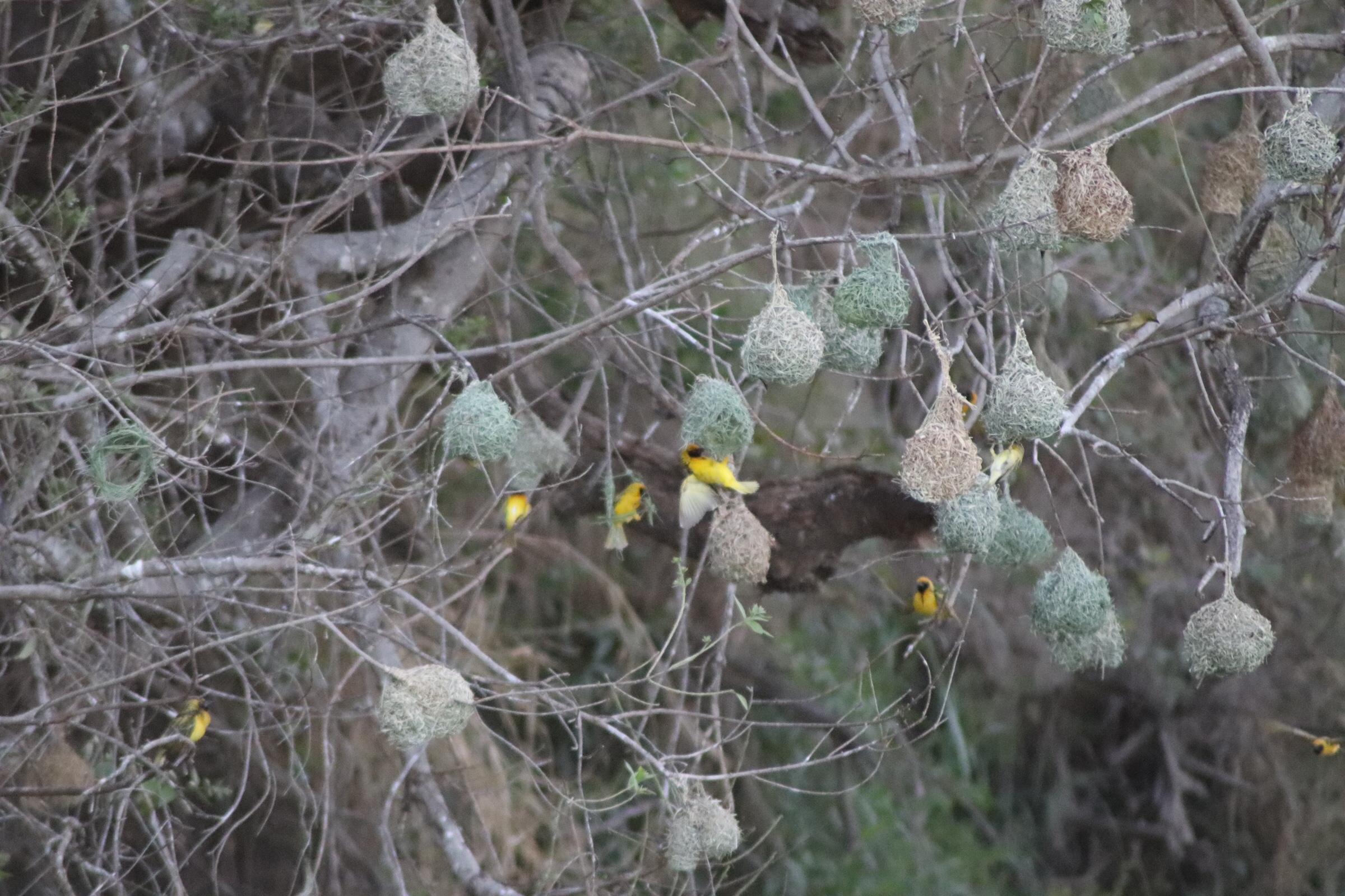 Continuing along we watched a group of monkeys for a bit as they were playing around and eating from the bushes. We learned and saw an interesting feature on these monkeys. (We will let you see if you can figure that out yourself from the pictures). We saw a bush buck, another of the antelopes in the park, and a group of water buck with the white rings on their behinds as they were grazing along the river. We also spotted a pair of crocodile eyes in the river. Although we never saw more than that – from the shadow underneath the surface you could tell it was a big one. We also saw hundreds of yellow birds making nests on a tree (and making lots of noise and commotion). Even though the animal sightings were minimal for much of this part of the drive, the scenery in the golden hour lighting was beautiful.