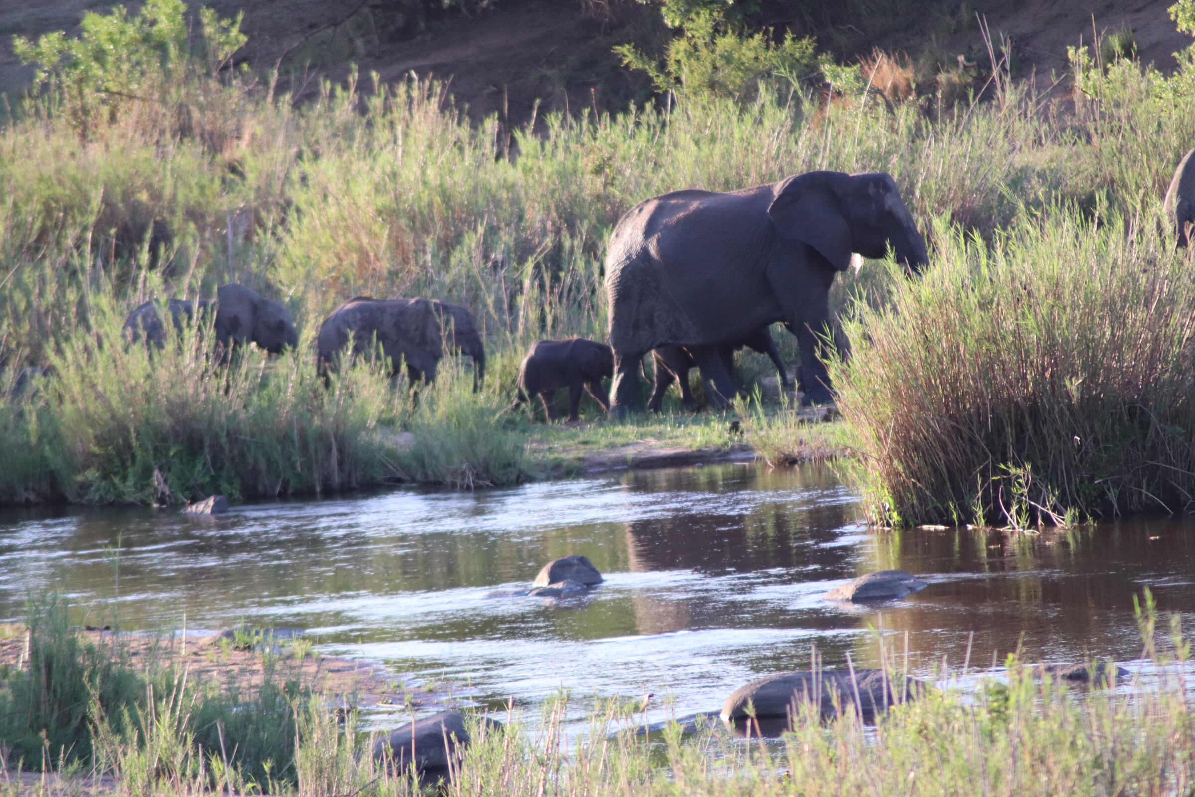 With that we headed for Kruger and between passing the first entrance gate but before even getting to the area with the check in, we took a look out at the river and saw a herd of elephants in the riverbanks. We watched them until they were out of view, and then a glimpse in the other direction and in the distance we saw buffalo and hippo in the water. We hadn’t made it fully into the park and already 3 of the big five and hippo. We hoped that was an omen for a successful day ahead.