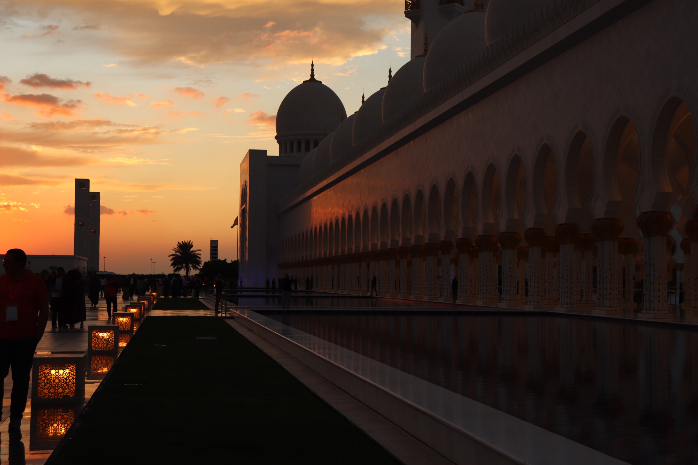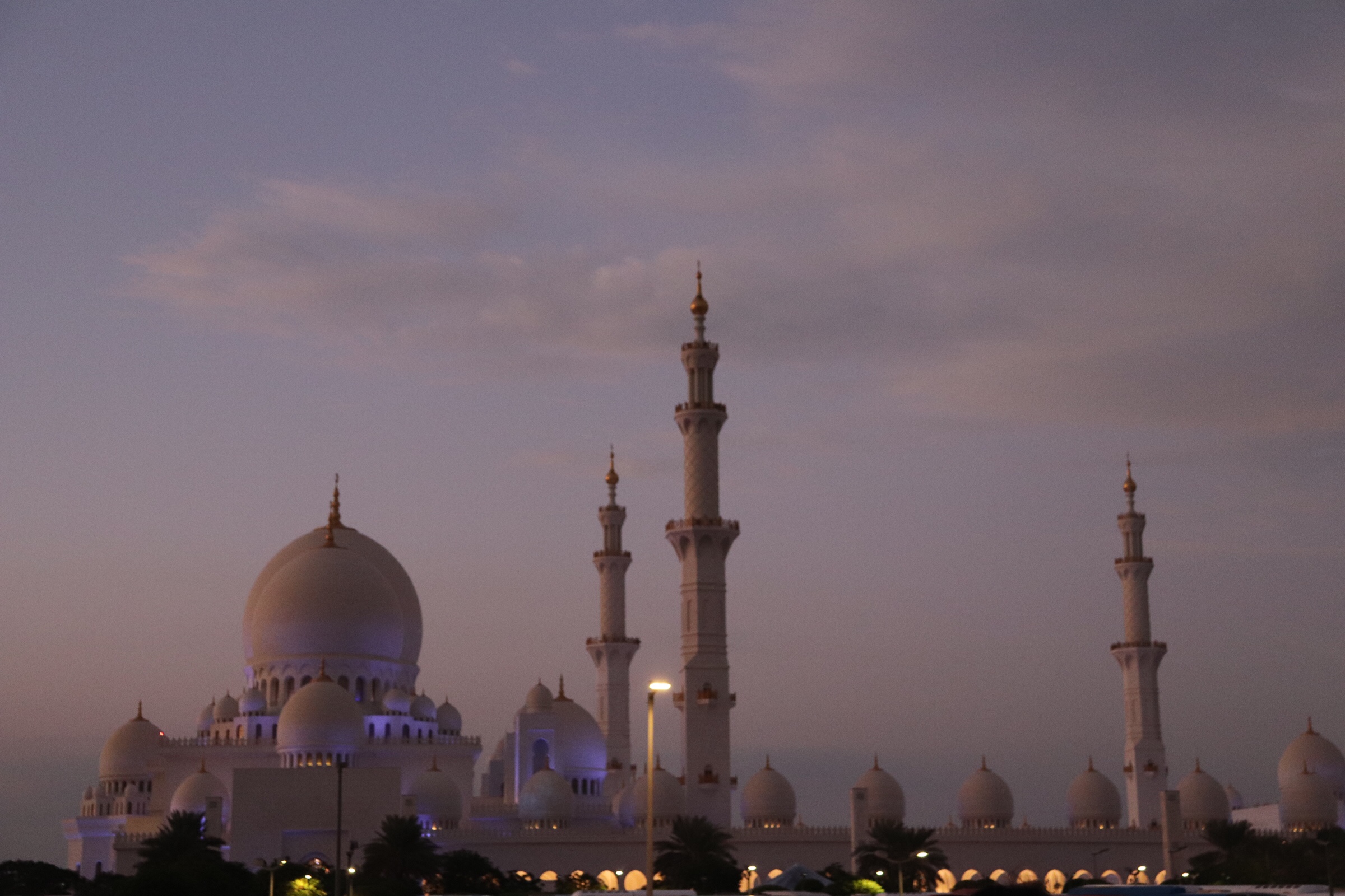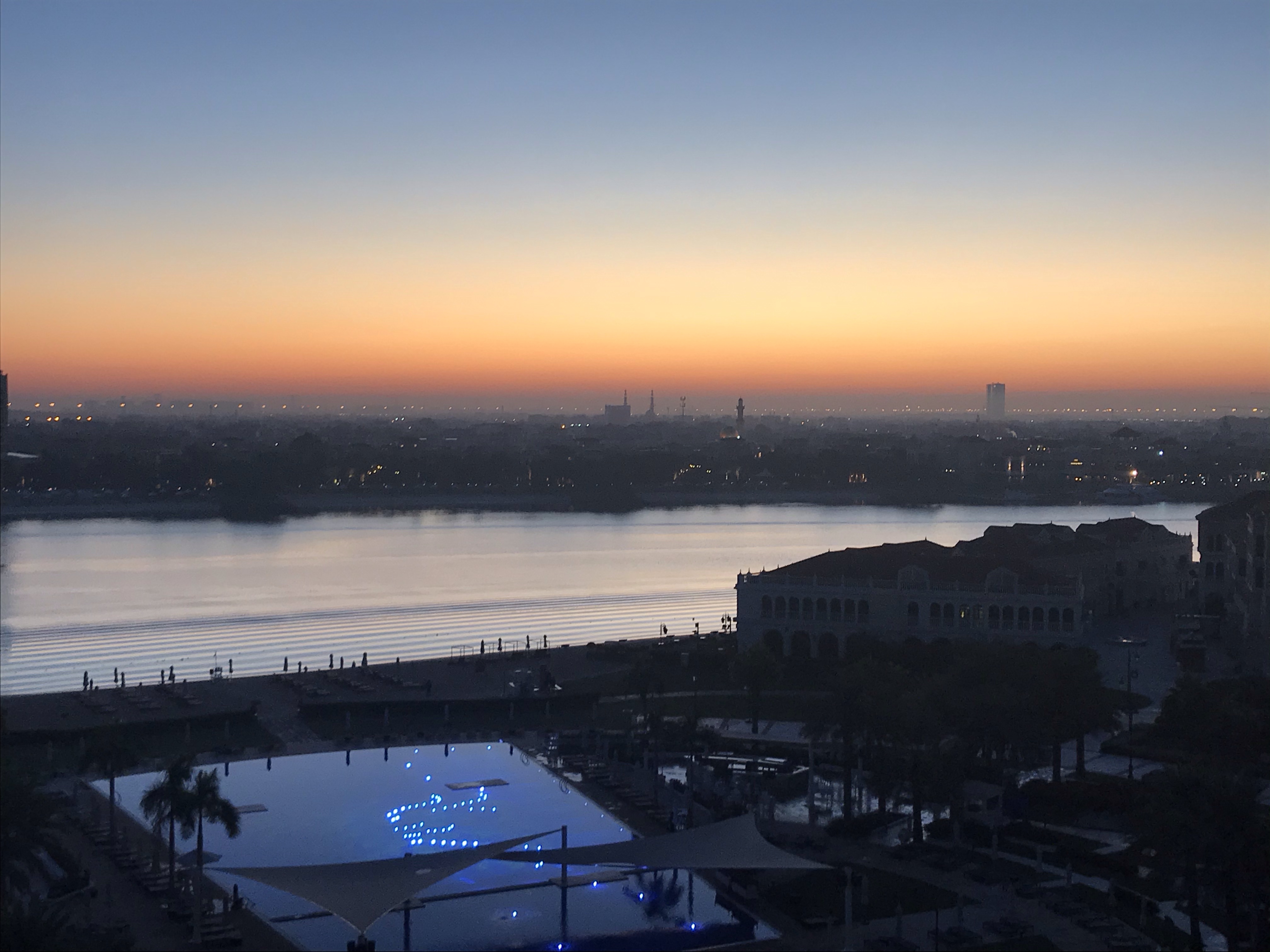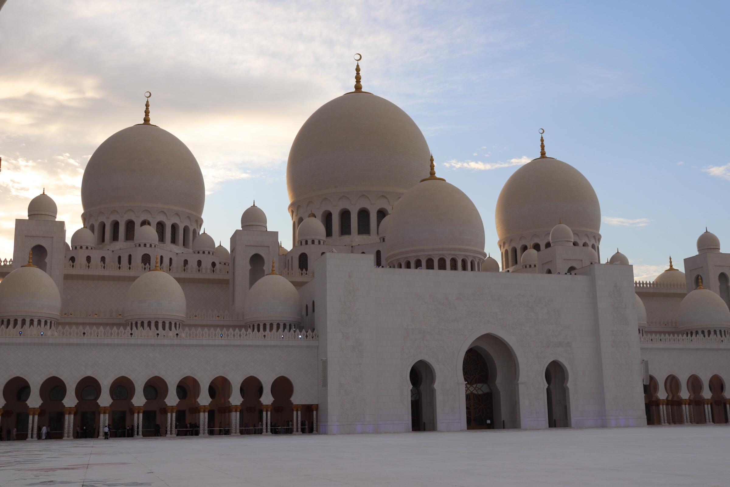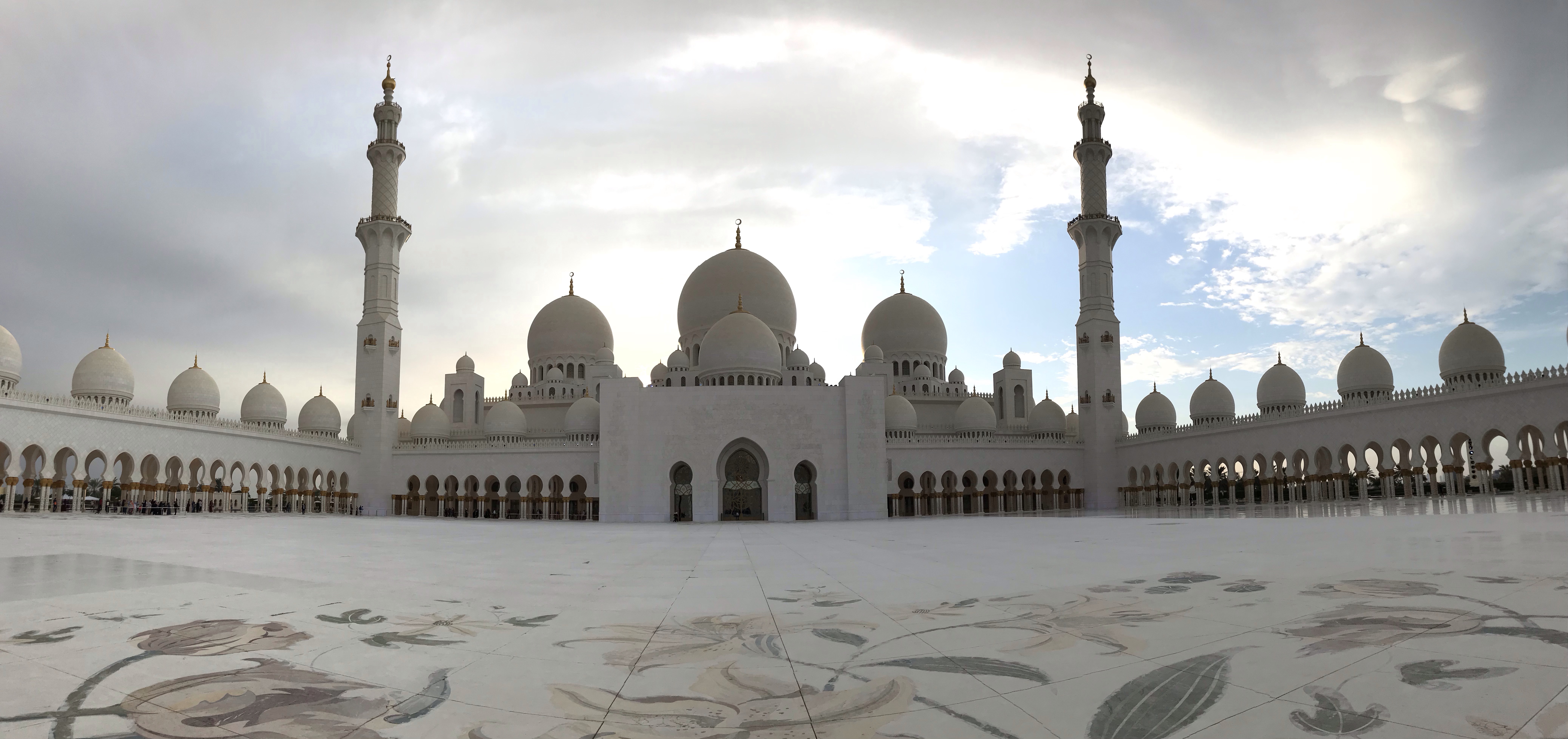 After an overnight flight we found ourselves landing in Abu Dhabi at 5:20 am and in the taxi to our hotel wondering what we were going to do for the next few hours. We had slept a little bit on the flight but not nearly enough to make it a full night of sleep. The drive to the hotel was quick, and at the end we were greeted with the magnificently lit up Grand Mosque, which was nearly across the street from the Ritz Carlton, where we were spending our two free nights. By some stretch of luck they had a room ready for us at 6:30 am and we were able to get into the room and have a nap. I am not sure what we would have done without the room being ready. We were both exhausted. We watched the sun rise behind the clouds and took a nap.