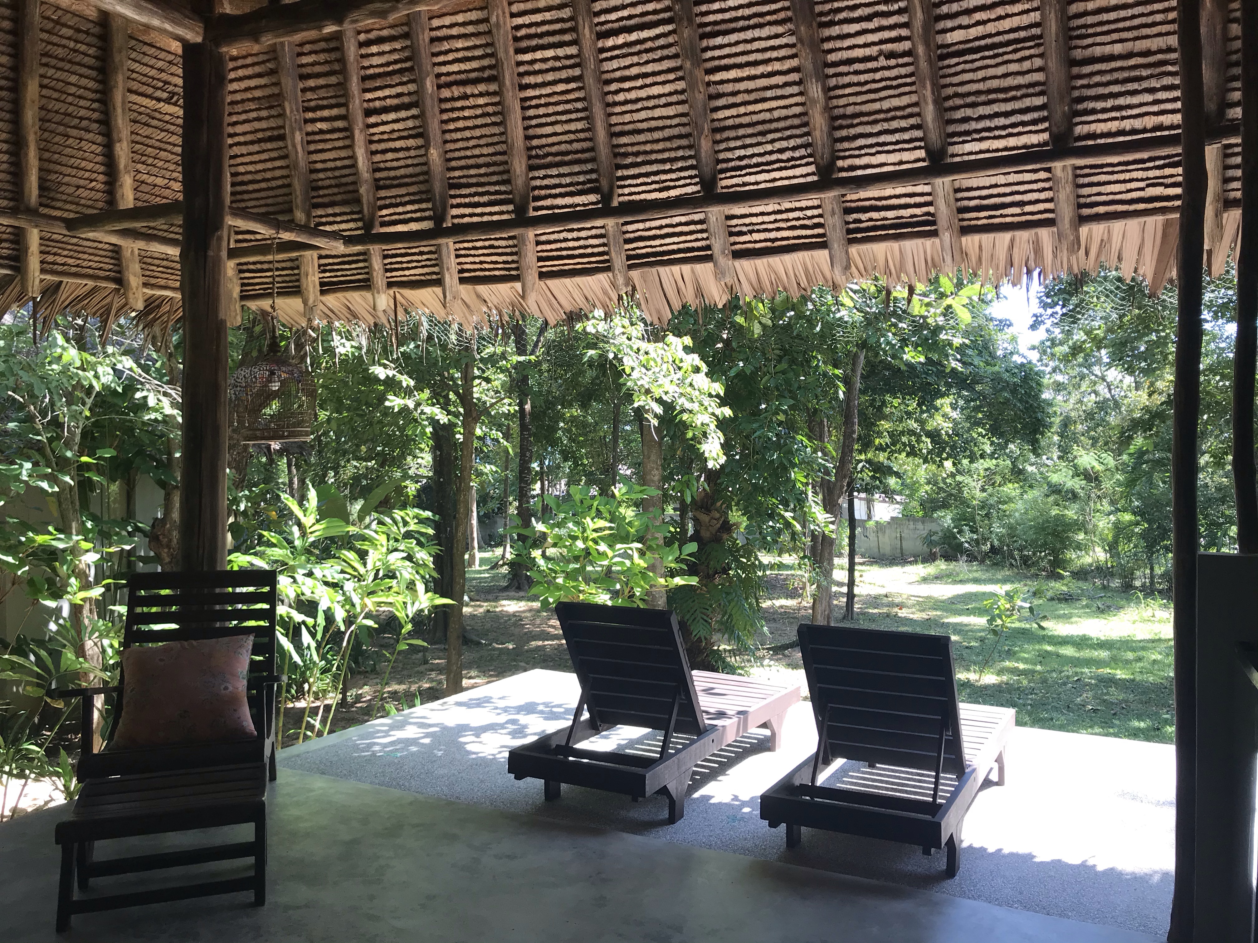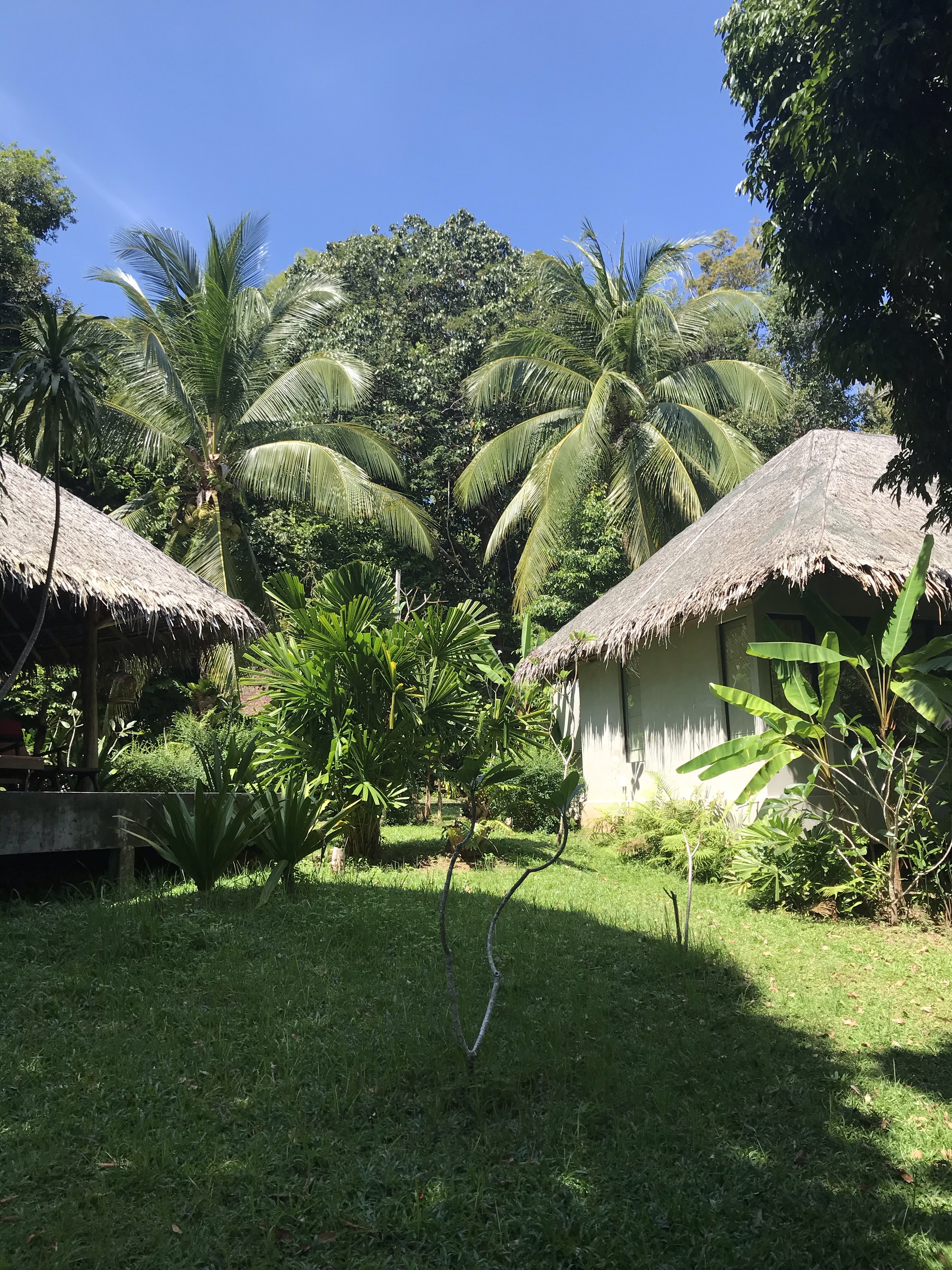 We arrived to the pier of Koh Yao Yai and found a taxi to take us to the hotel which was about a 15 minute drive away. We would learn that Taxi here means a converted pickup truck that had two benches in the back and a roof added over it. Upon arrival we were in luck that our room was already ready even though it was around 10:30 am. We were staying in a bungalow where we had our own deck with sunbeds and a couch, and the indoor portion where we would sleep. We also had an outdoor shower in the bathroom.