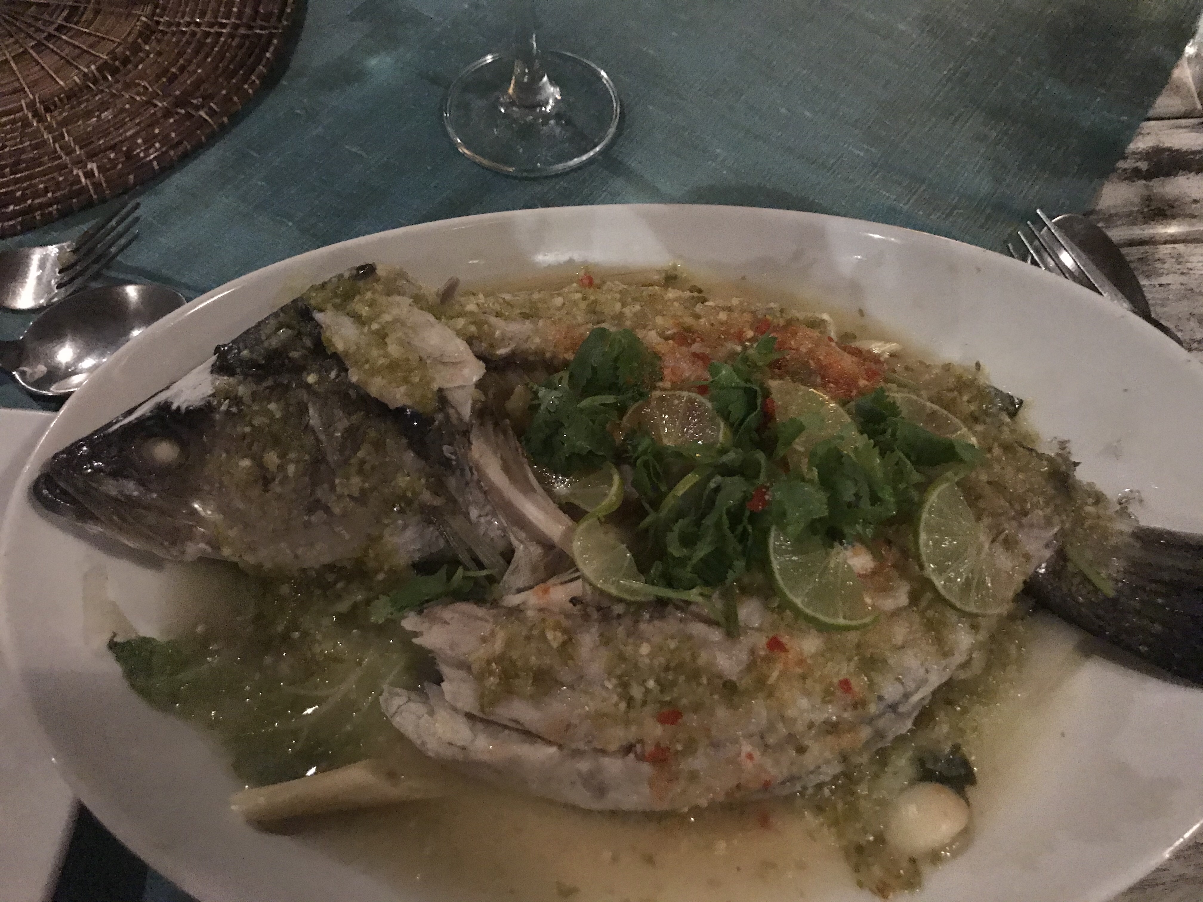 That night we had a delicious seafood dinner at the beach restaurant, with the tables on sand. We had a little laugh when we ordered the lime chili grilled snapper and the waiter asked if we liked spicy. We said yes, and he said to us, oh of course you are from America. Apparently a lot of the Europeans’ food gets sent back over the spice levels being too much. We knew this well from the Thai restaurant we ate in a few times in Germany where they always made sure we were ok with the spice. The chili lime grilled snapper was a great option and we devoured it to the sounds of the waves which were now crashing along the beach as the tide had come in. We were sad that we would have to leave the next day.